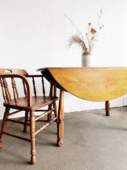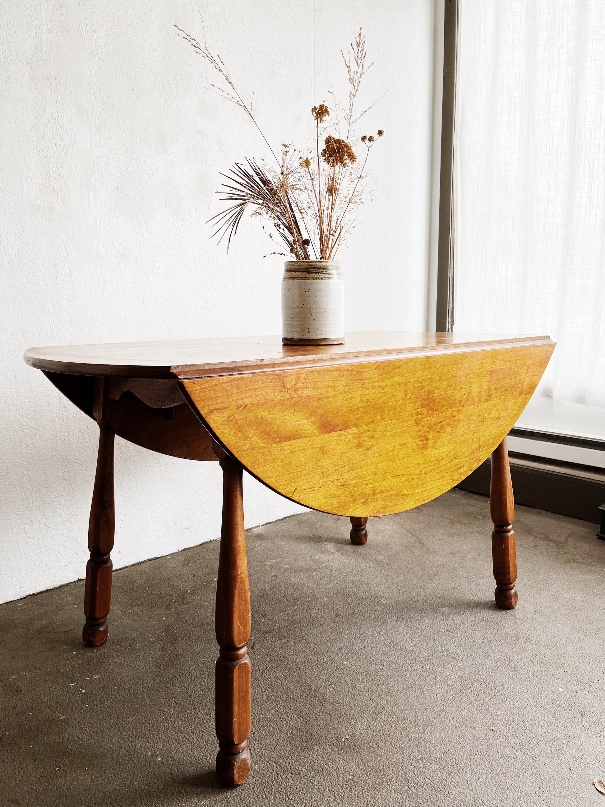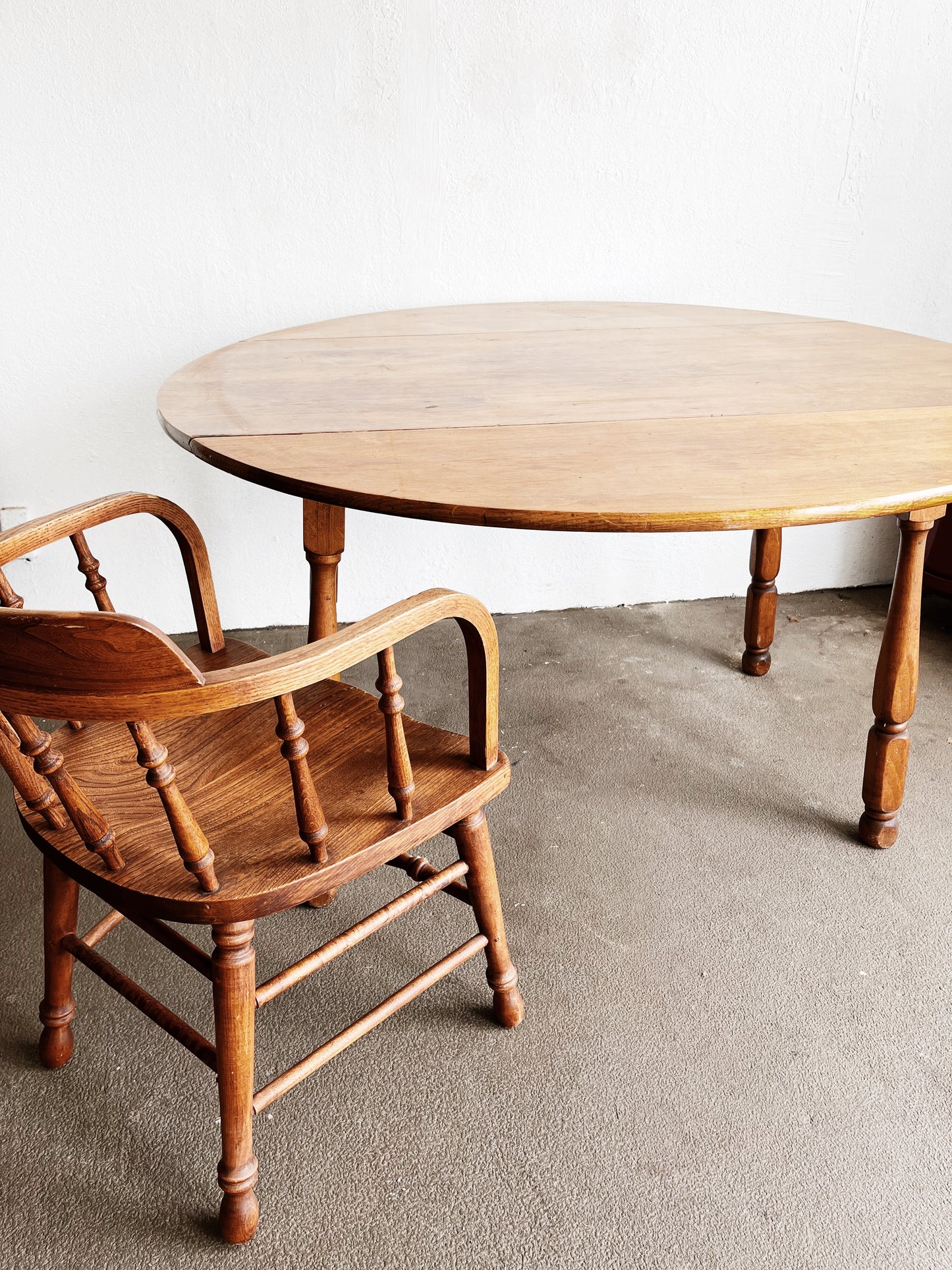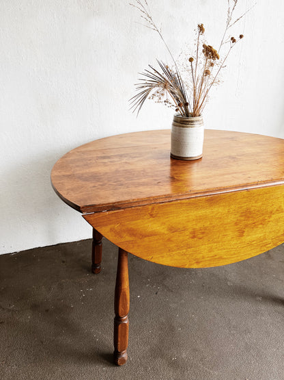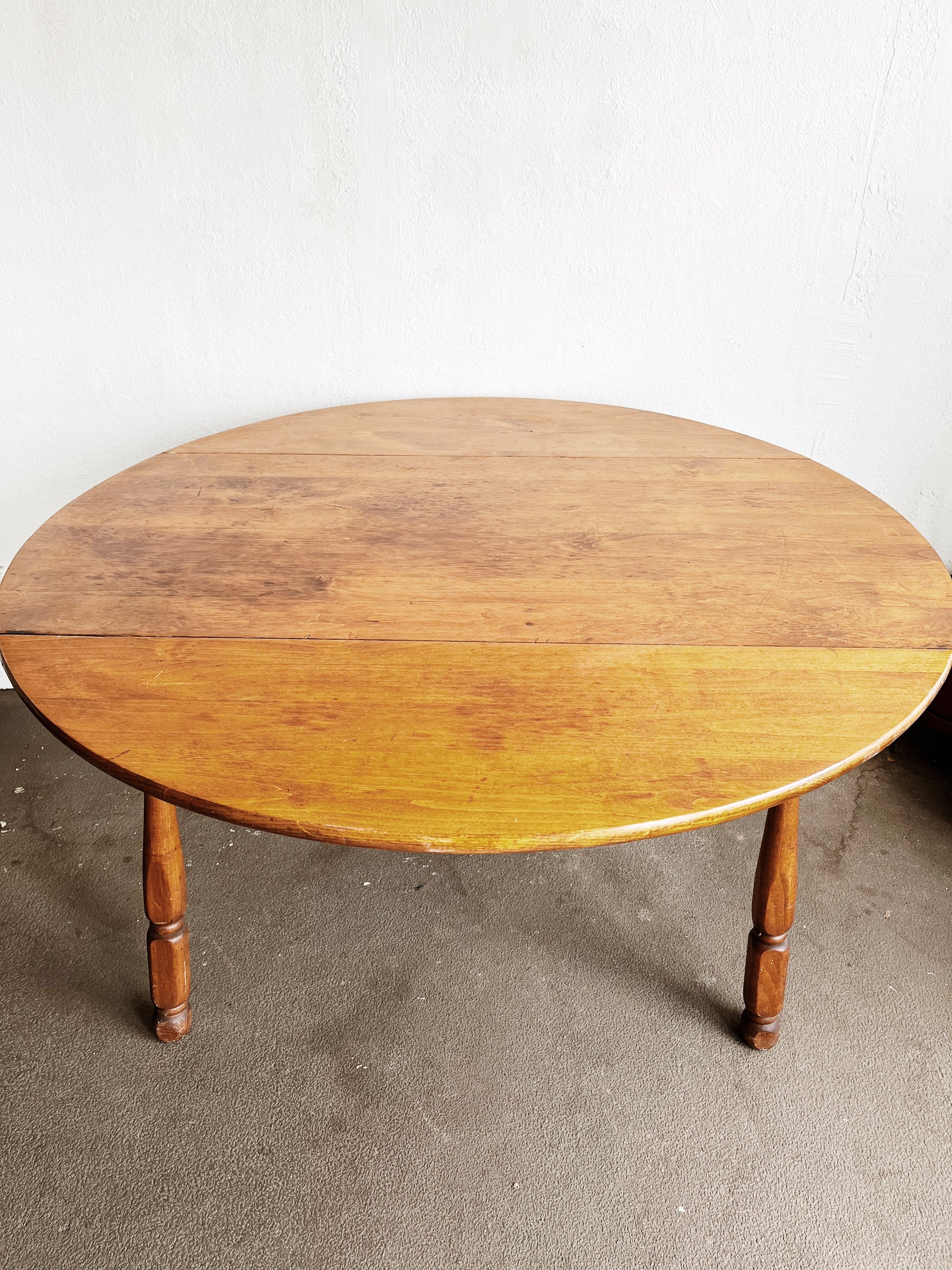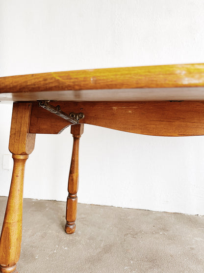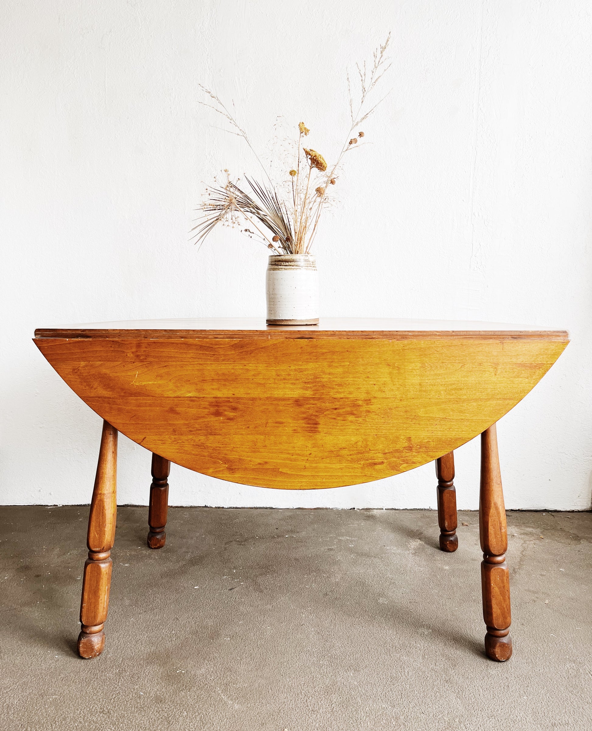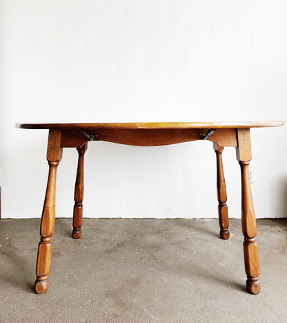 Gorgeous and hard to find round dining table. This one has double drop leaves with nice aged brass hardware underneath. Monterey style splayed legs and a nice mellow patina to the wood. In lovely condition