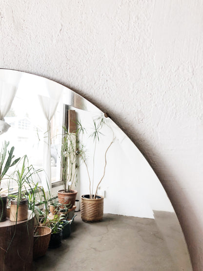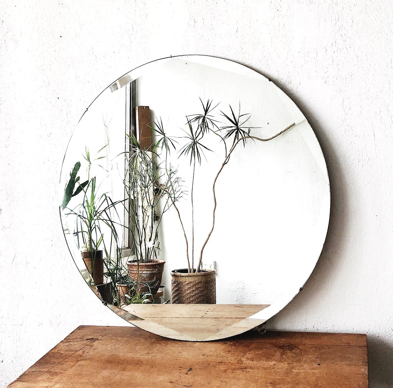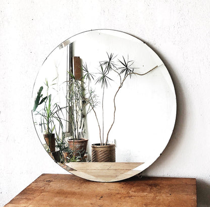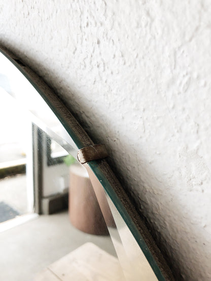 Beautiful old mirror from the 1930s/40s. Amazing bevel design all the way around. Industrial edge with clips. Wood backing and original hanger. Glass is mostly clear with just a touch of age spotting to give it character