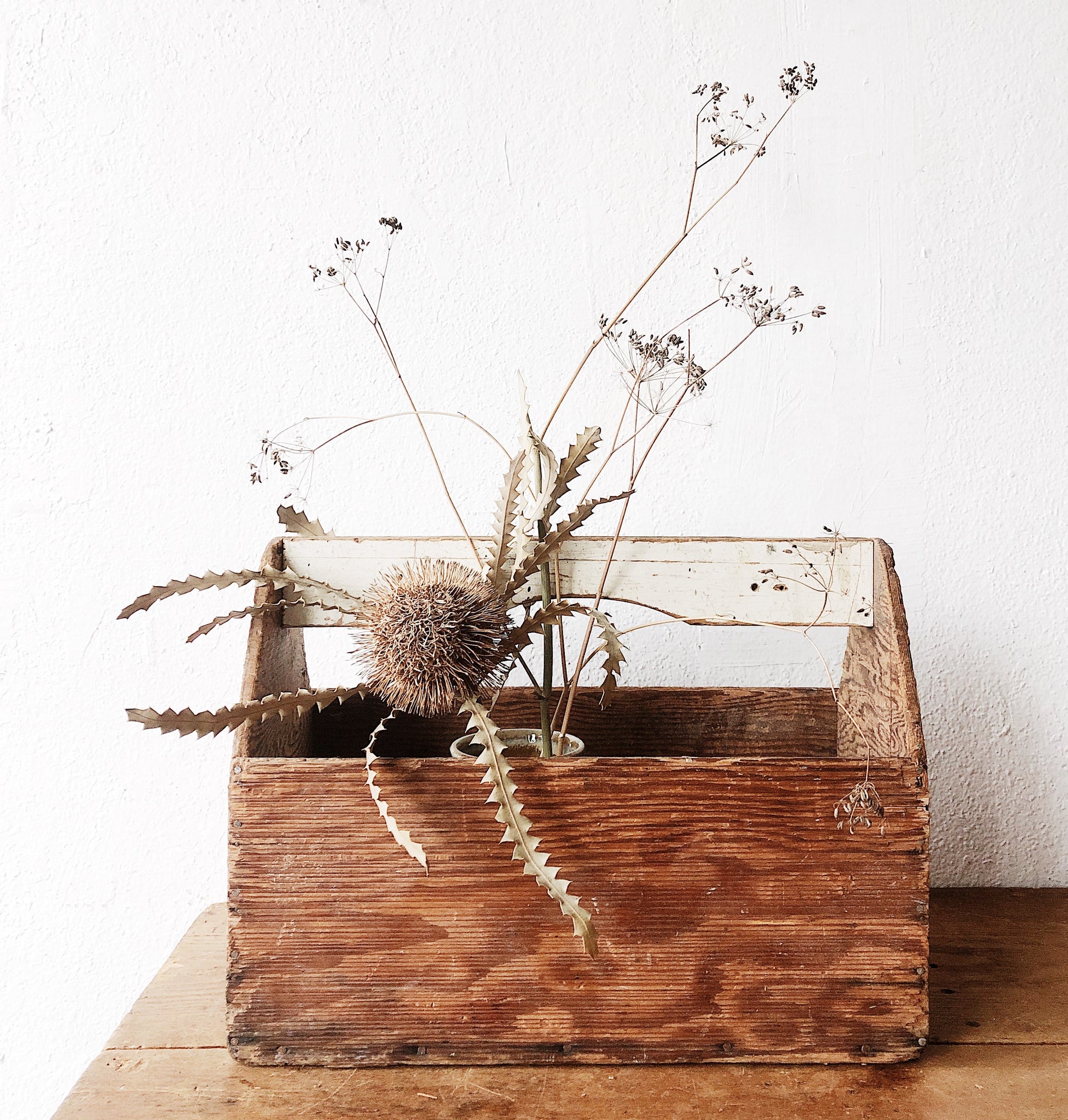 A vintage handmade rustic with Kati. Nice white and wood look. Really great for toting around garden supplies, tools, office supplies, really anything that you Want to be portable
