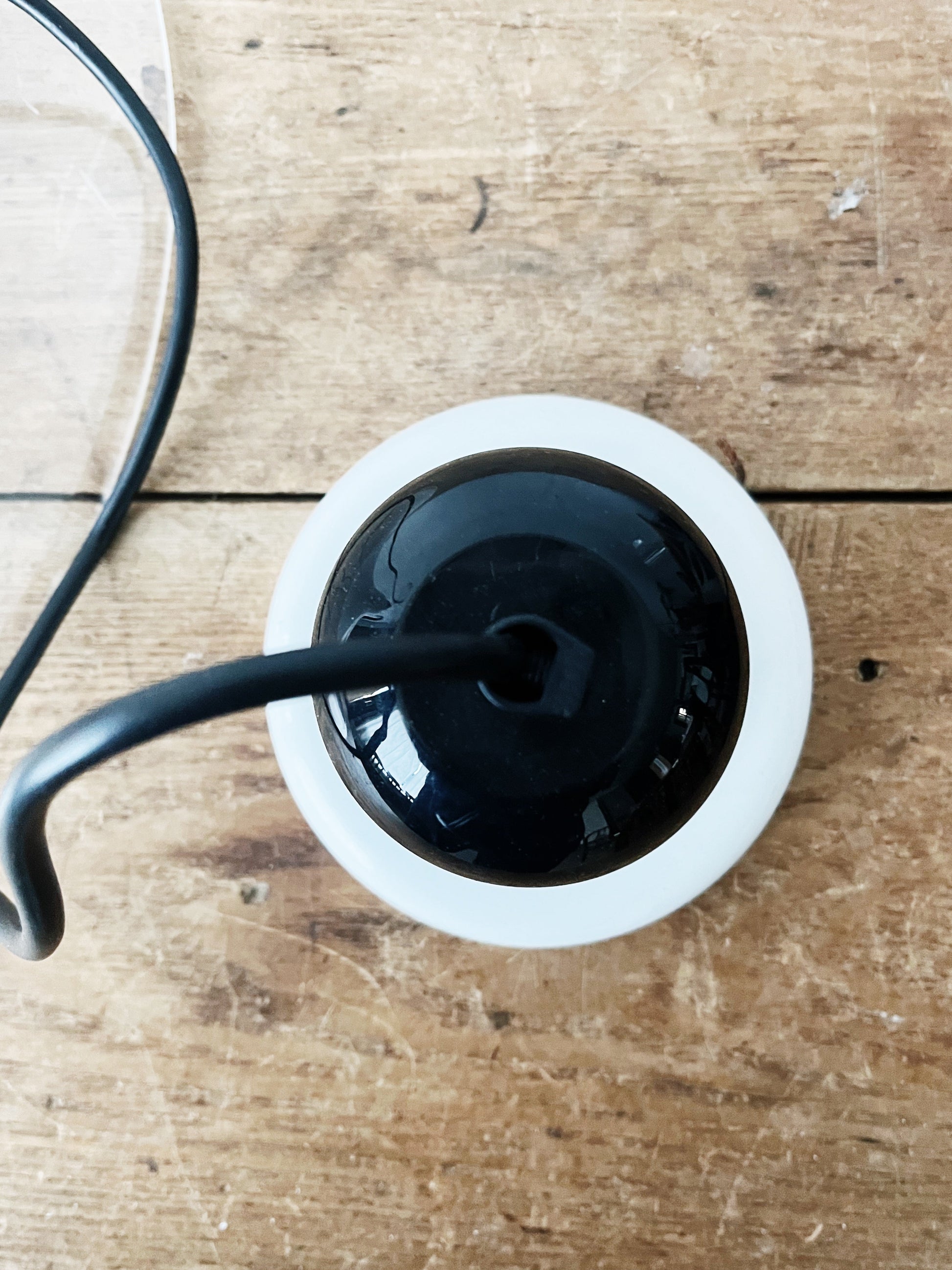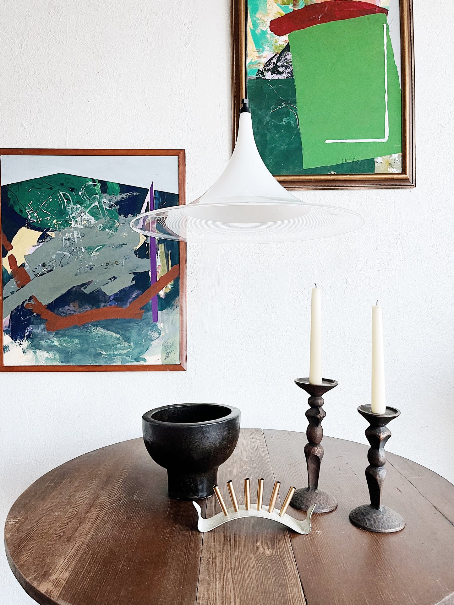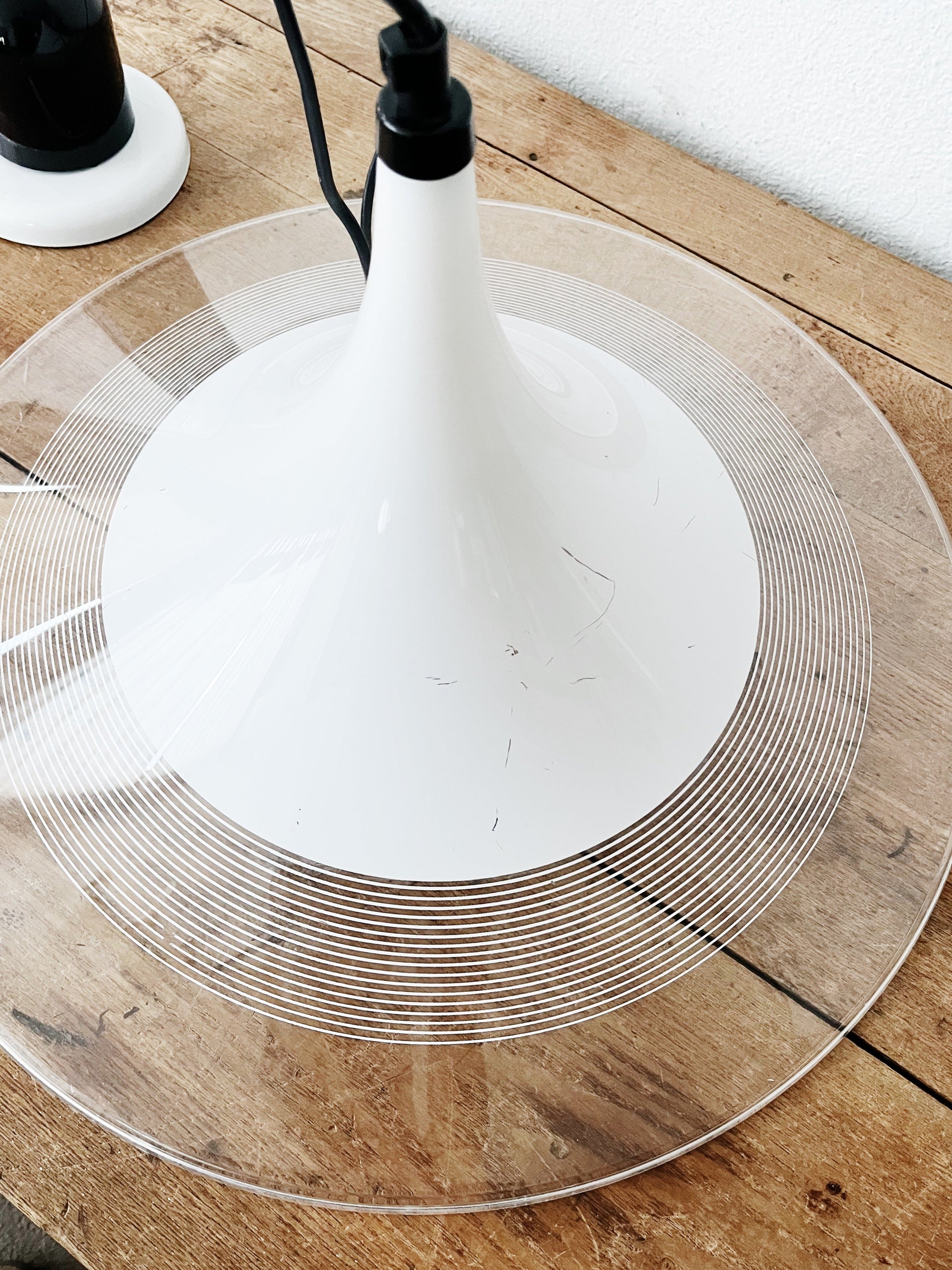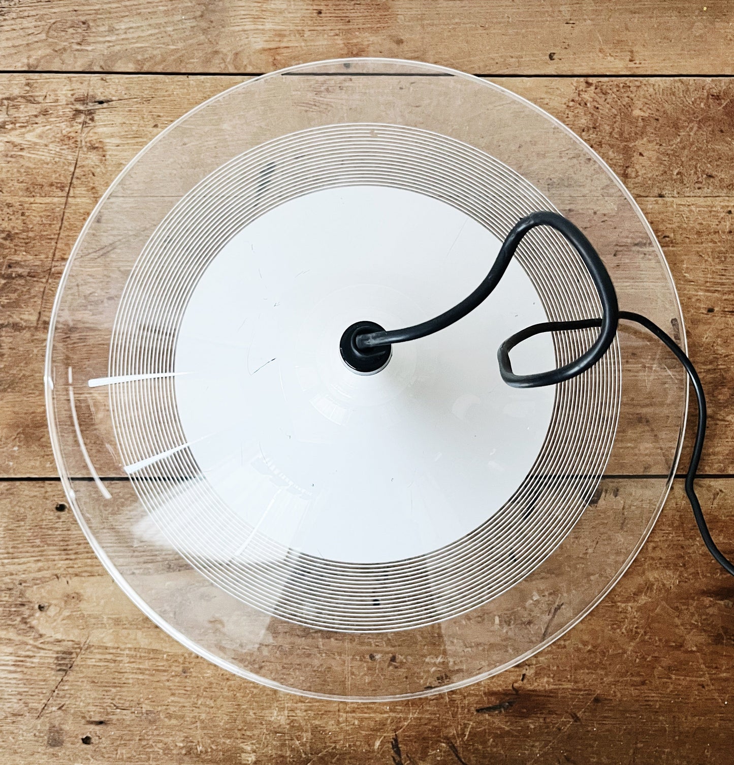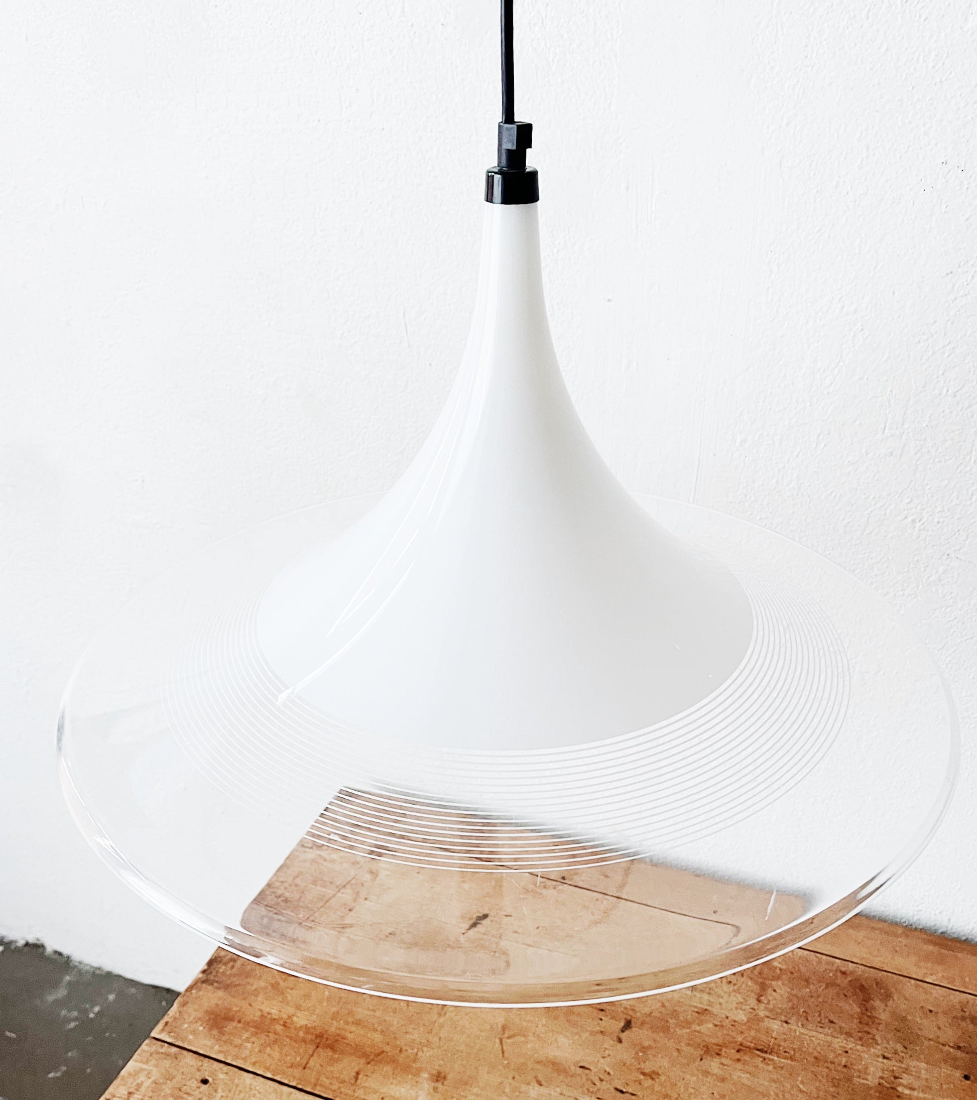 Fab post modern lucite pendant lamp in the Danish style. Saucer shape with alternating white and clear design. Original ceiling plate attached. Hard wire application. In good condition with some minor white paint loss to the underside, which won’t show very much when hung