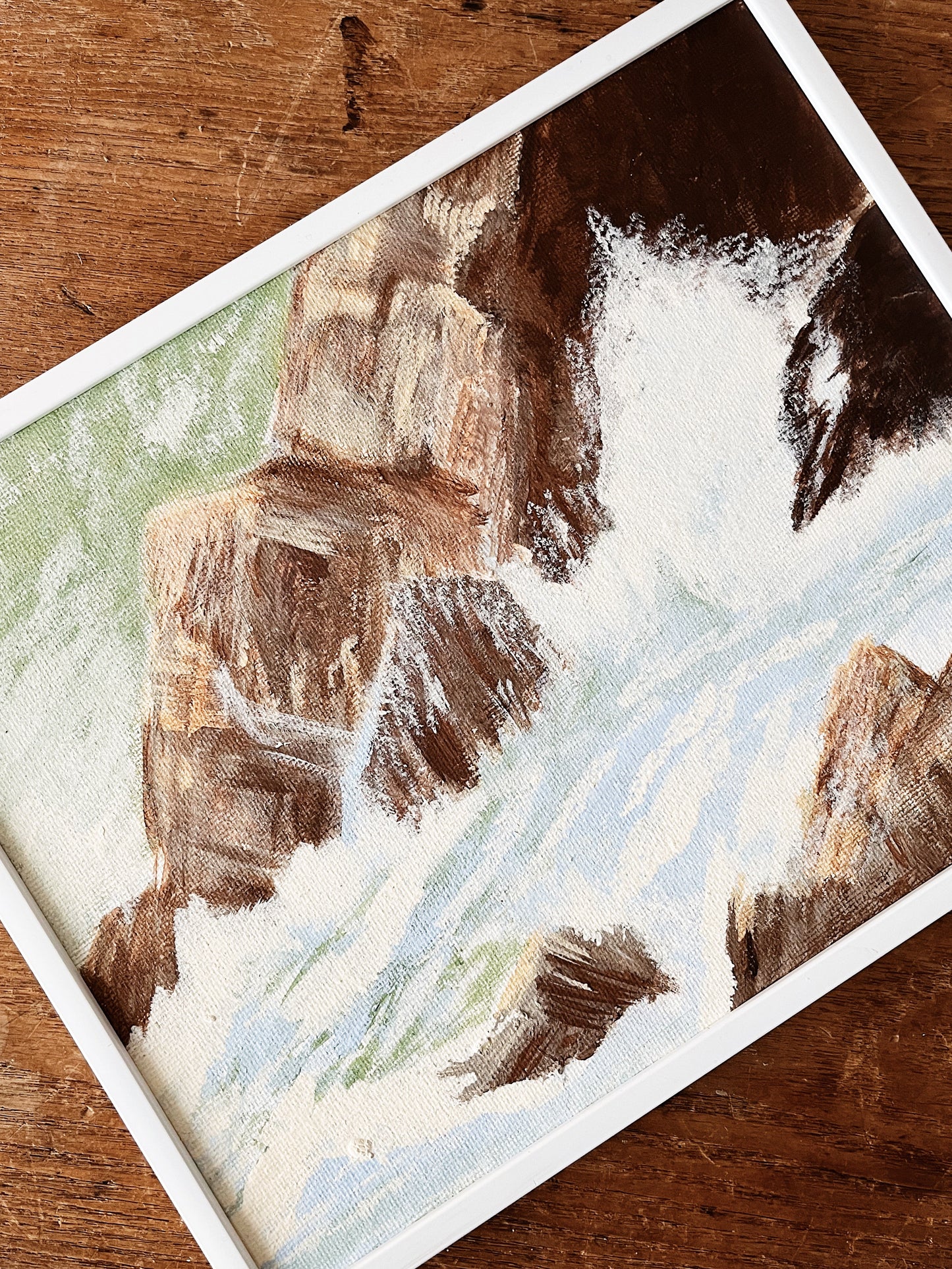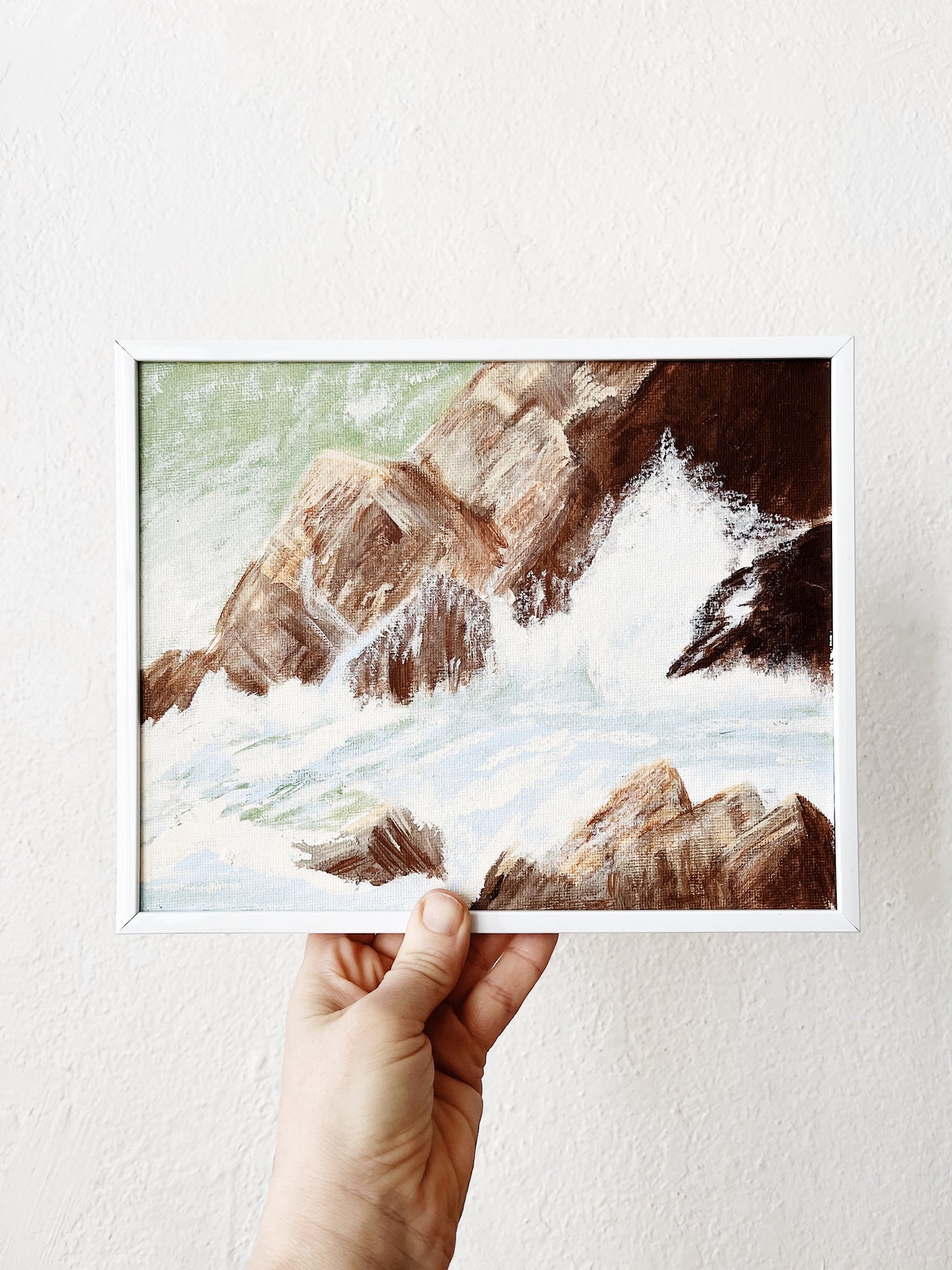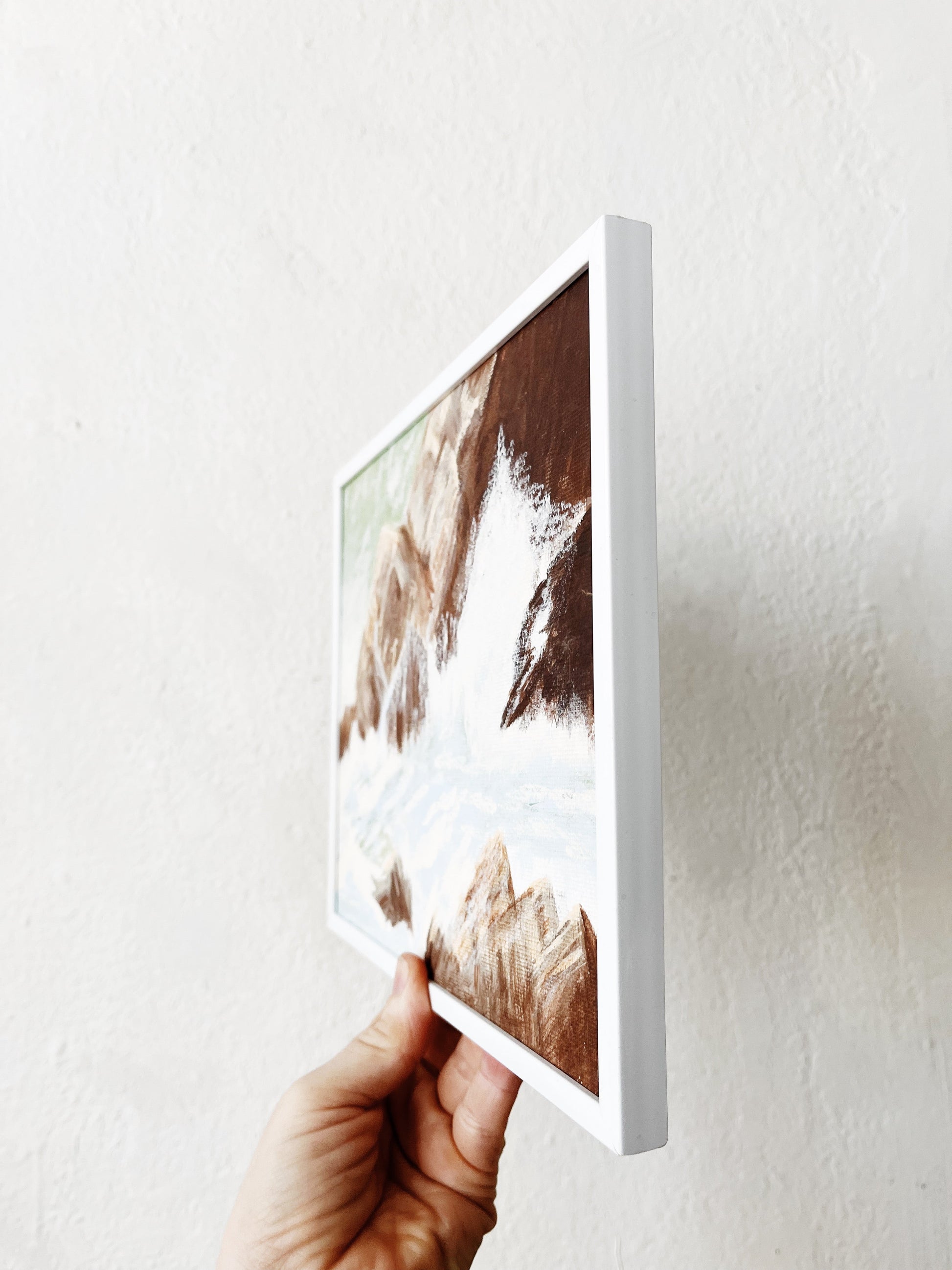 Sweet smaller vintage landscape painting on canvas board. Framed simply in white metal. Lovely movement and colors