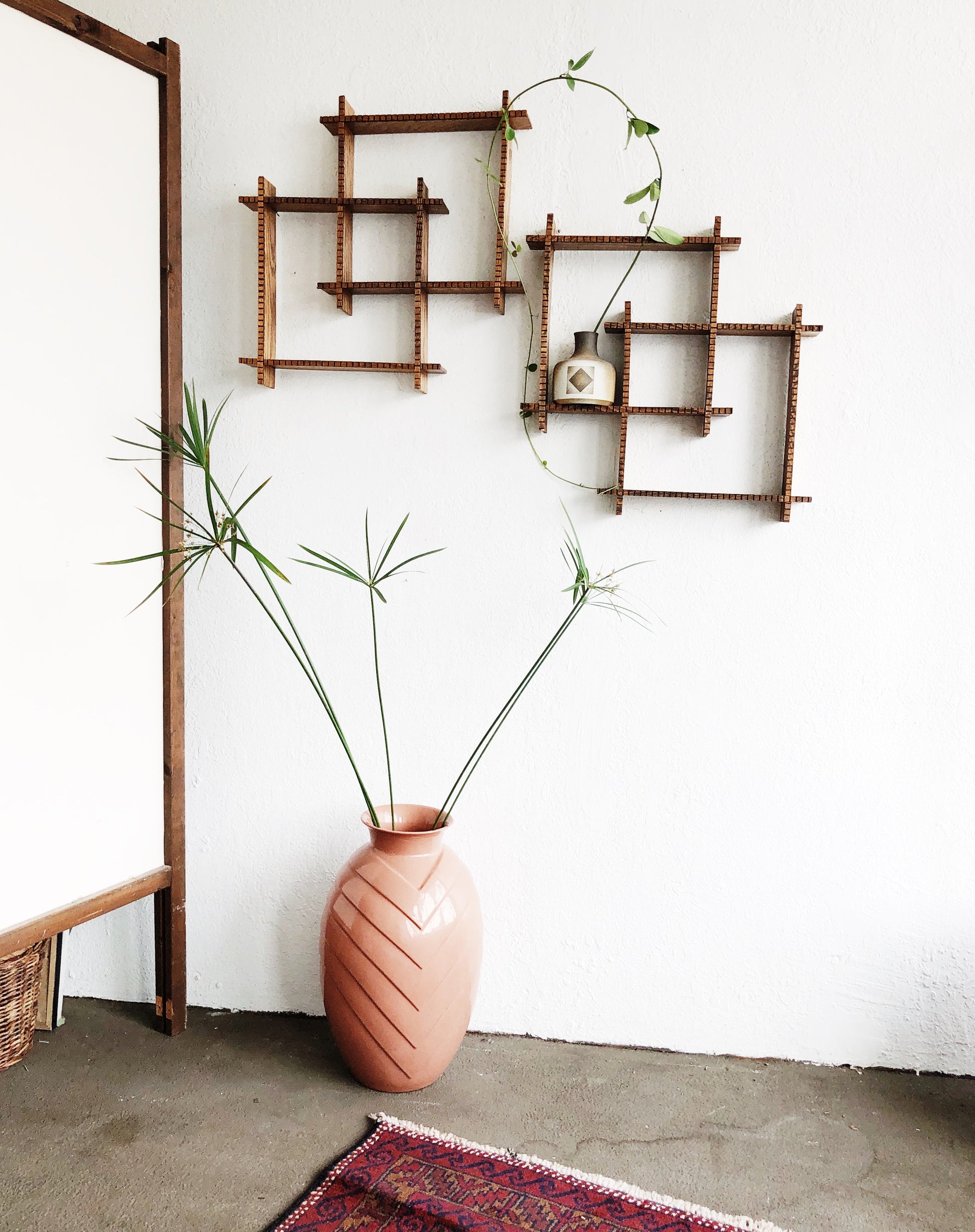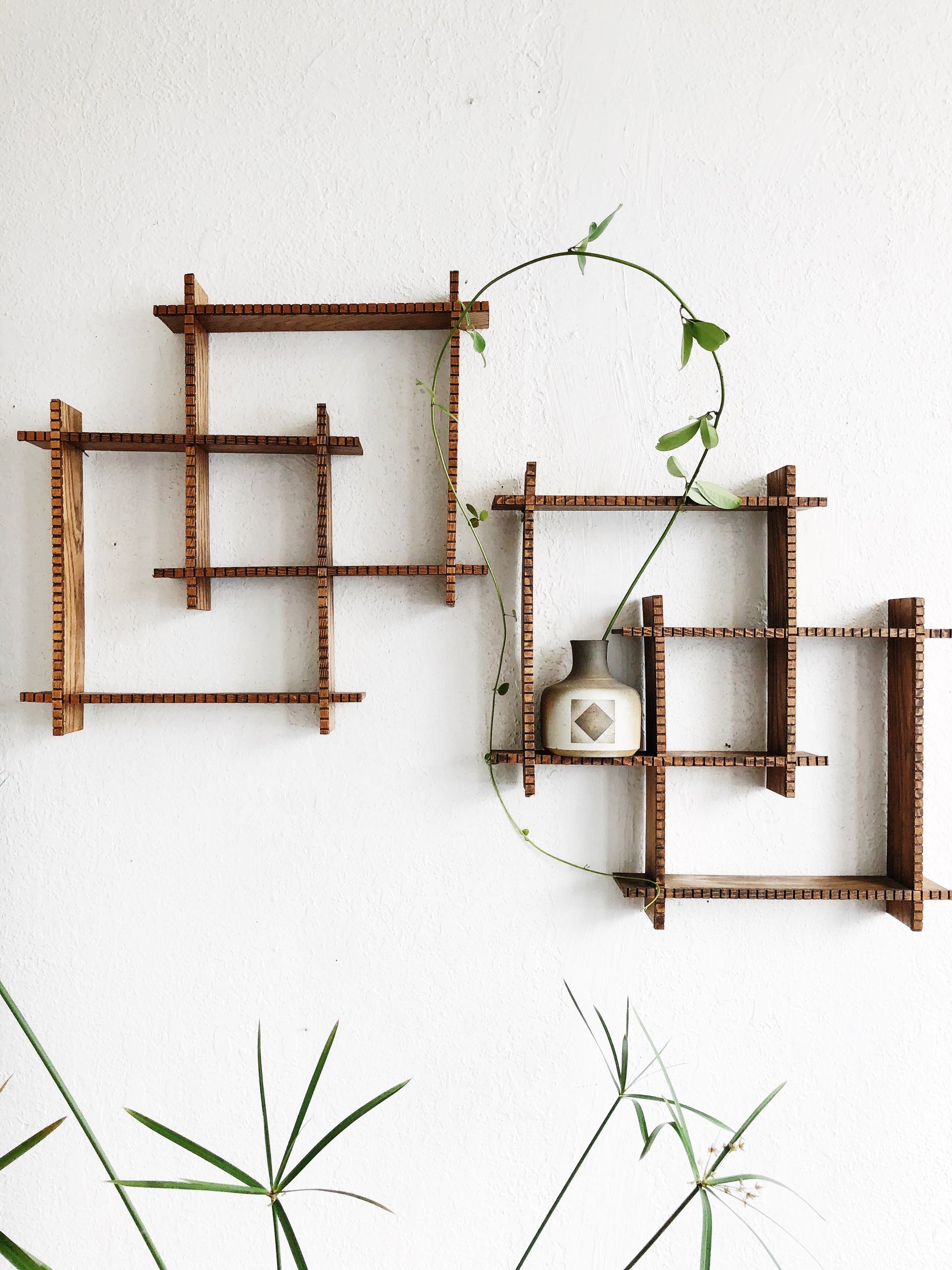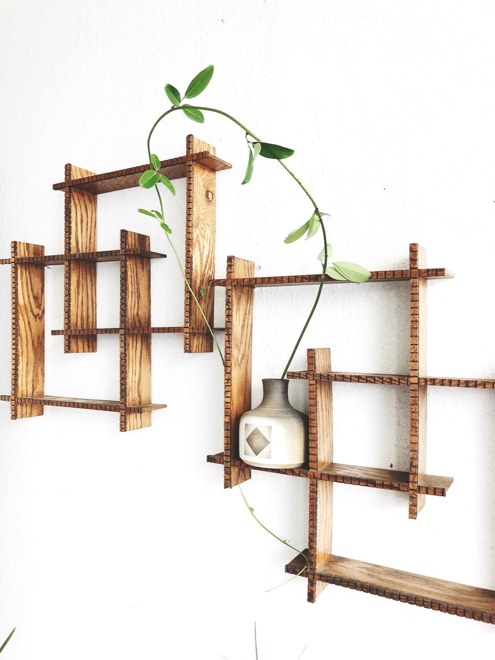 Vintage shadowbox shelf in oak wood. Fantastic carved trim detail.
