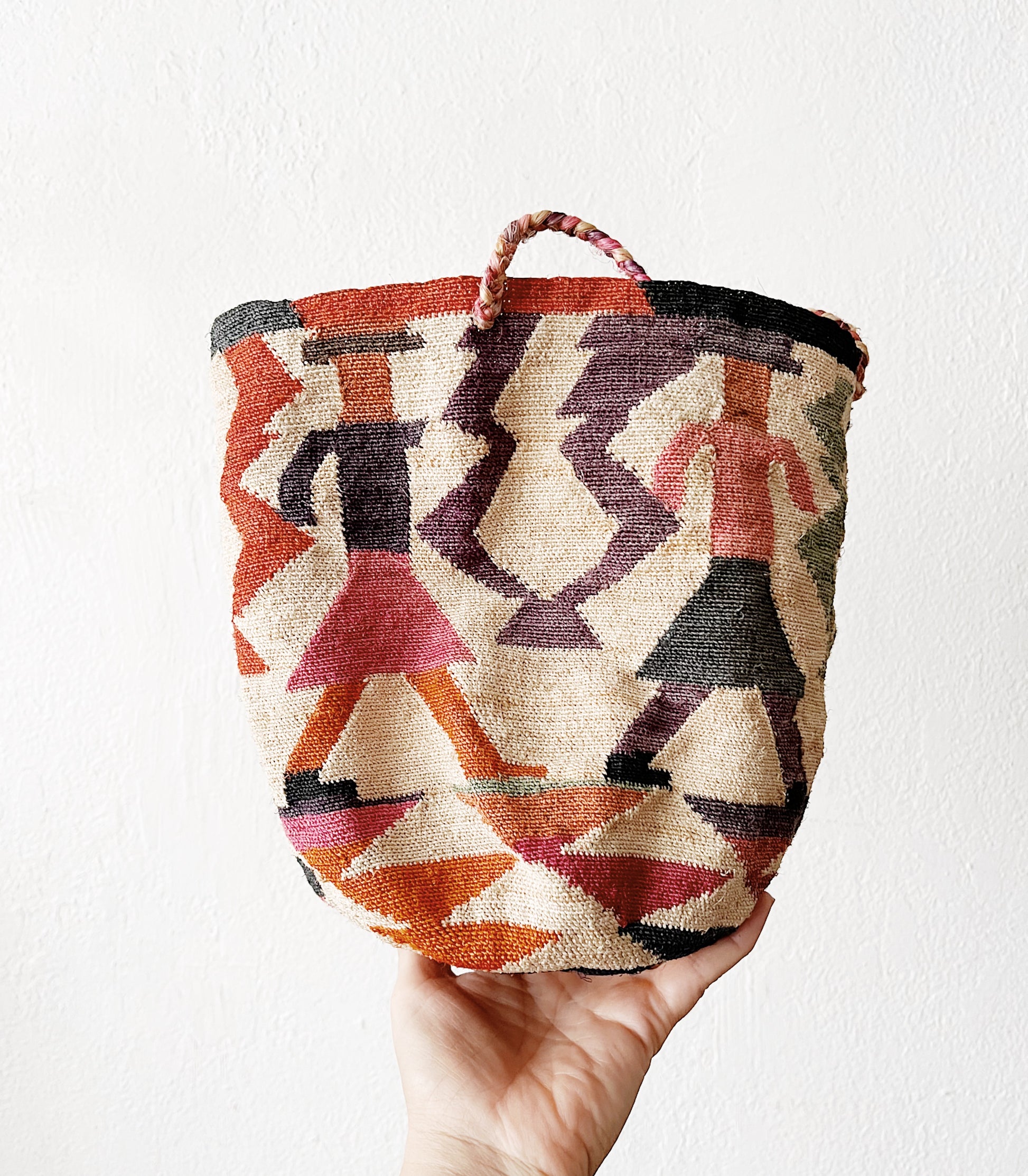 Tightly woven of natural materials, dyed with plants. The figures depict women holding hands. A nod to their sense of community in the fields