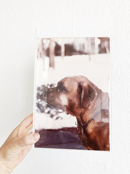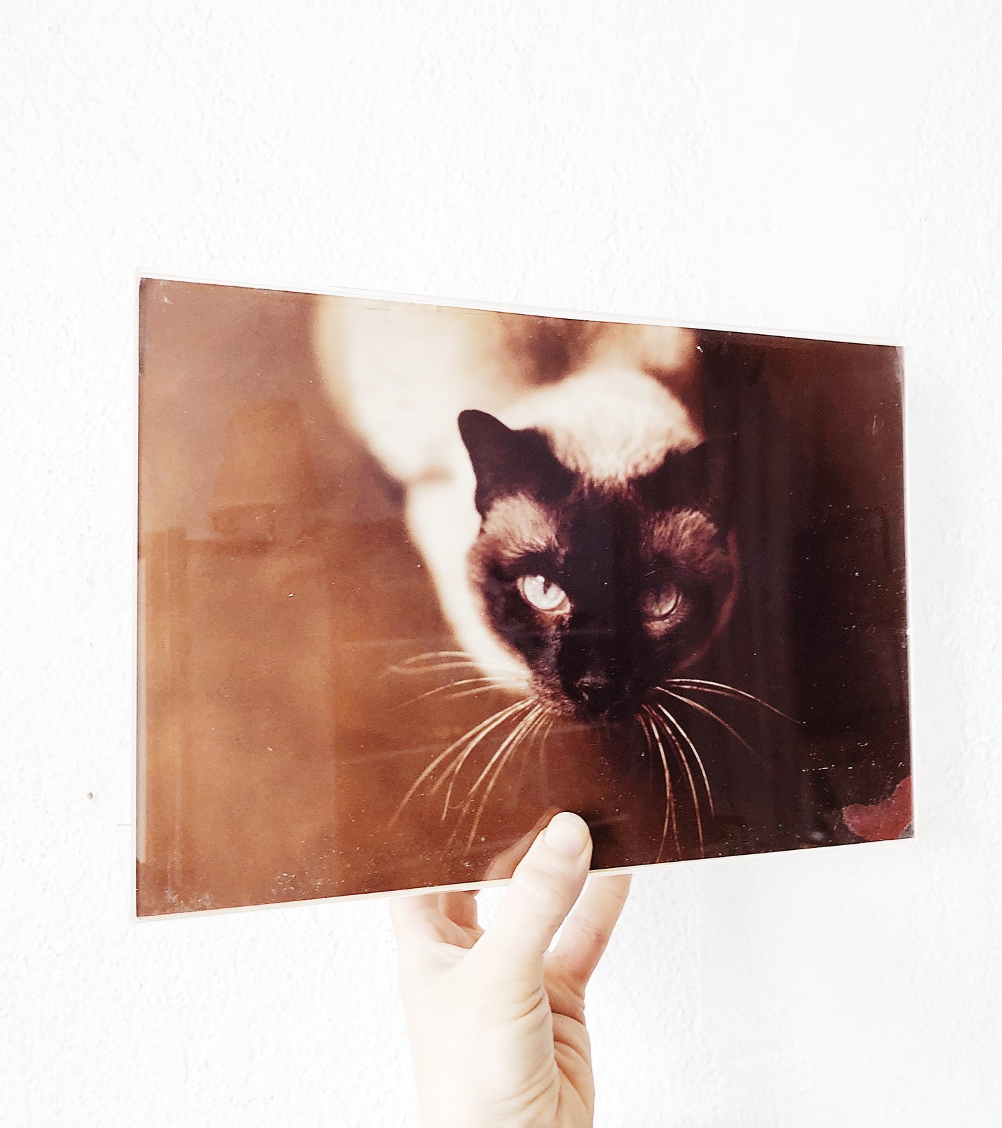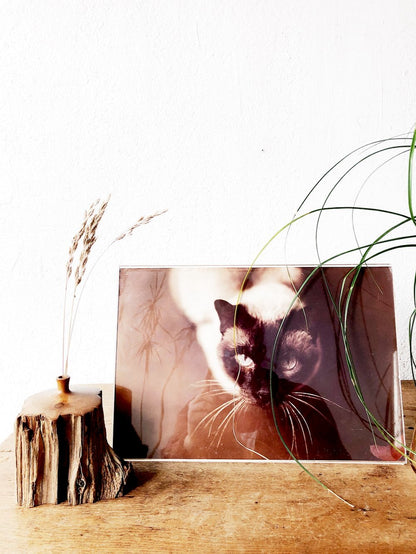 Fantastic film portrait of a Siamese cat. The tones are deep and mysterious. Plexi frame. Reverse has another ‘not my pet’ portrait