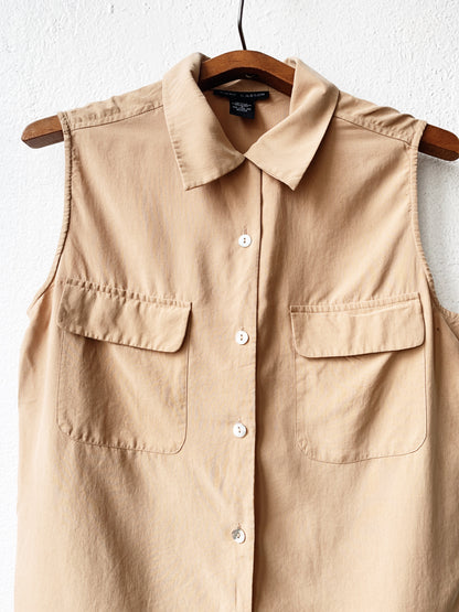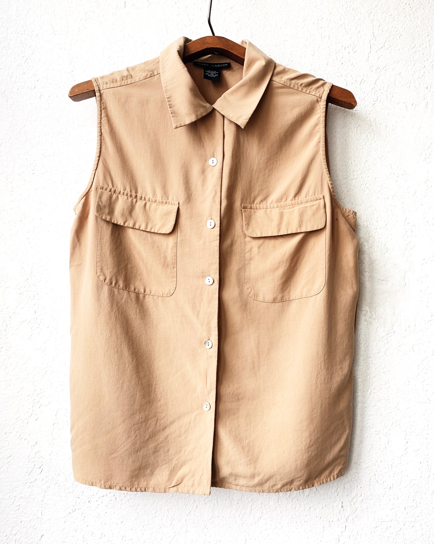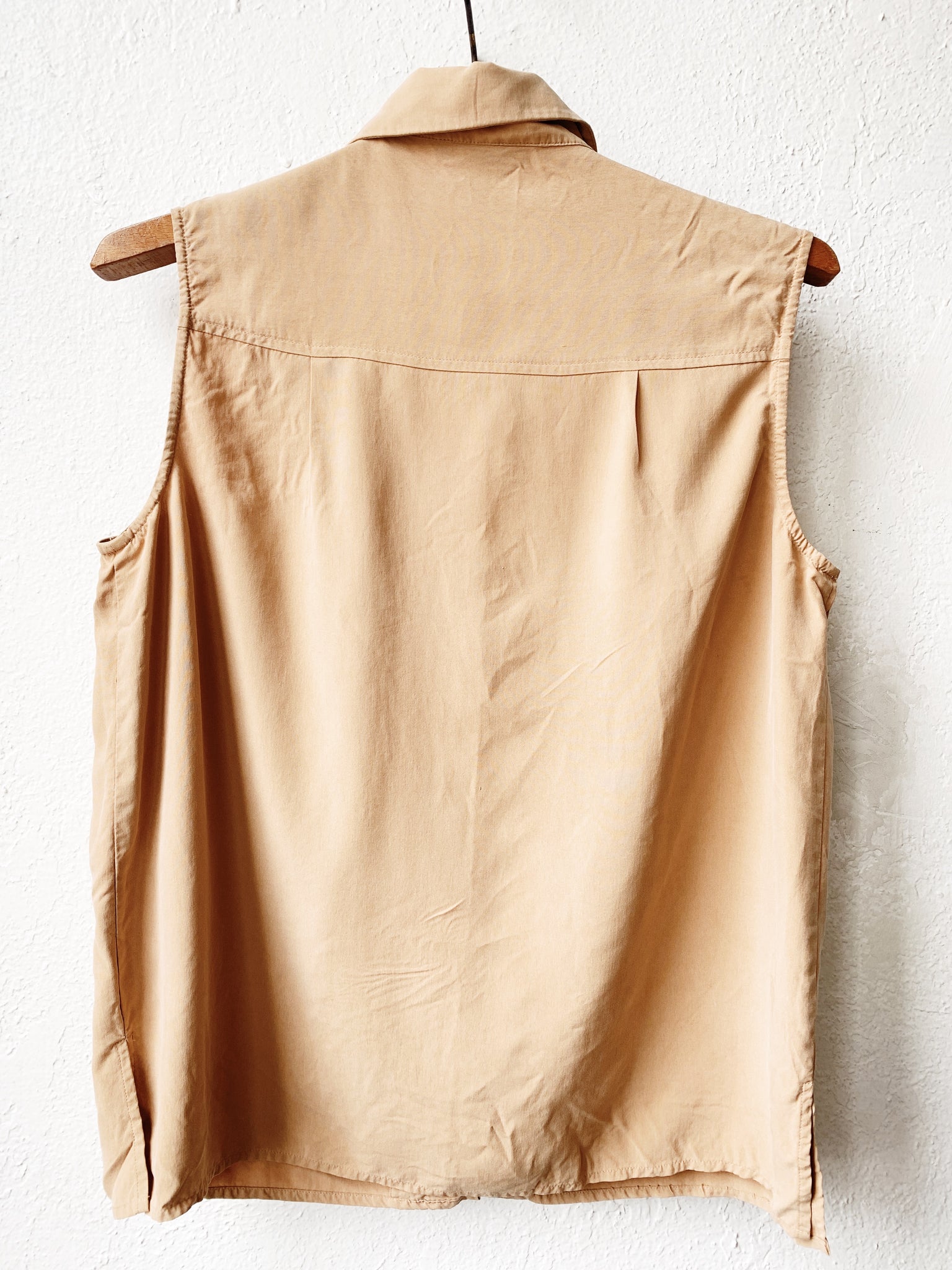 Vintage tan silk sleeveless button up with pockets and short side slits. Classy! Tagged a medium, fit is true.