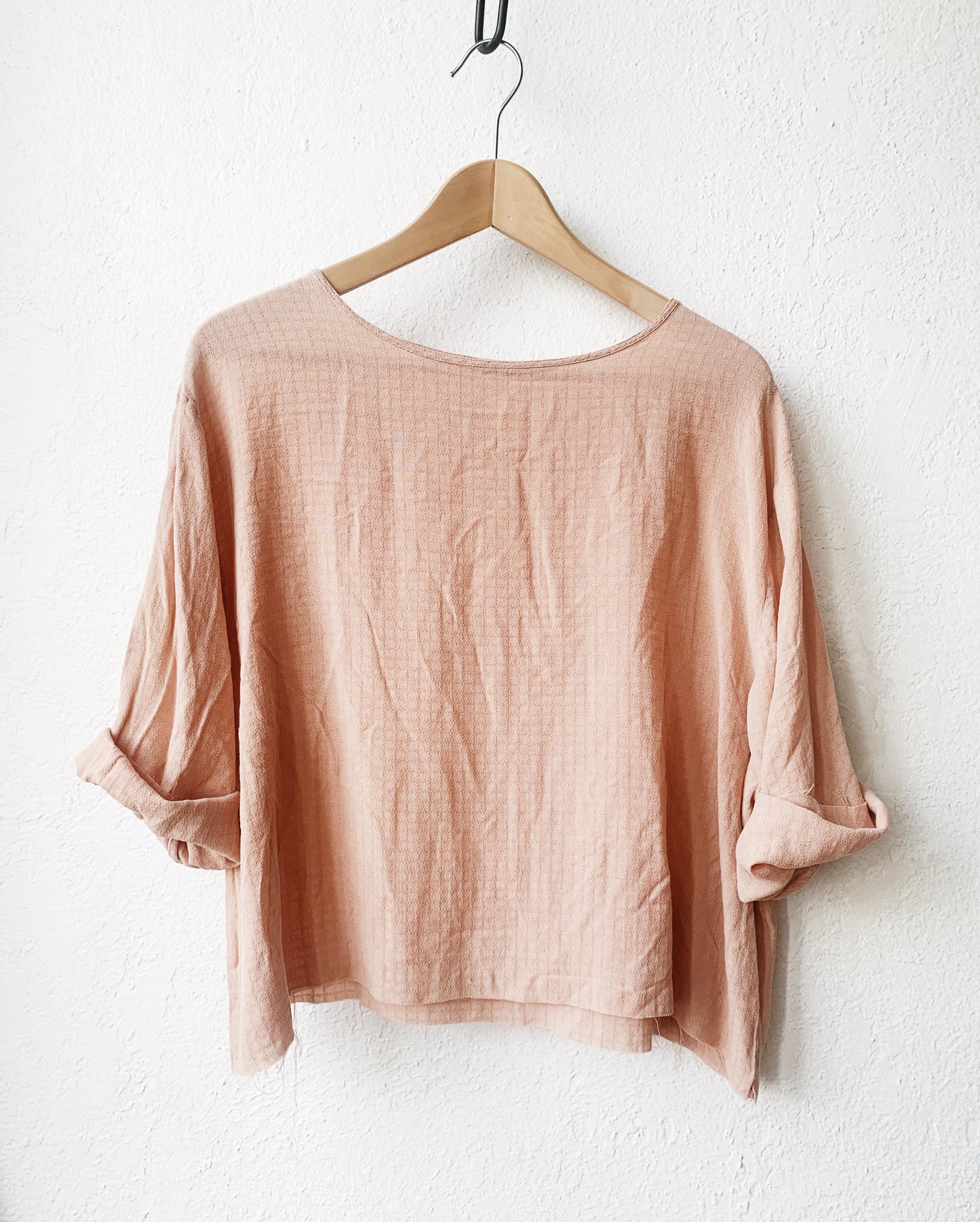 Vintage silk top in a light blush peach color with square check print. Super light and soft. The bottom and the sleeves have been cut, so slightly cropped and 3/4 sleeves and raw hem.