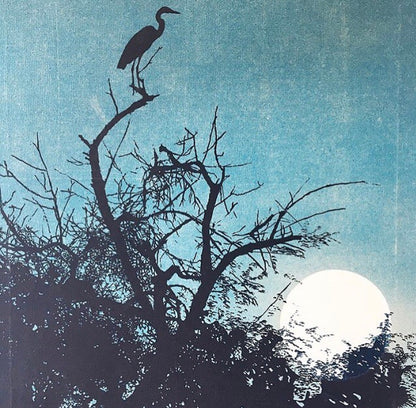 Vintage 1960s silkscreen panel with bird and moon. Deep indigo color. In wonderful condition.
