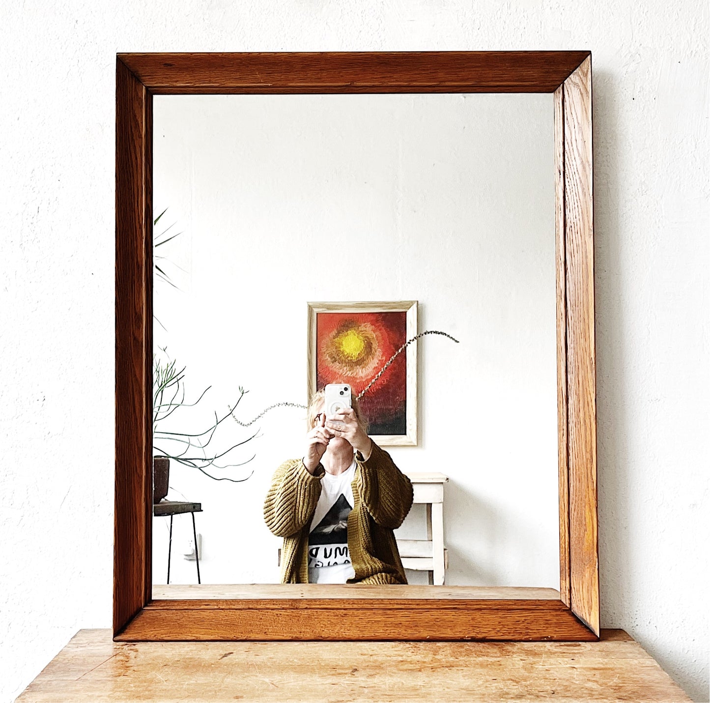 Sometimes simple is best. From the mid century. Warm toned hardwood and larger size. Glass is clear. Hanger on reverse