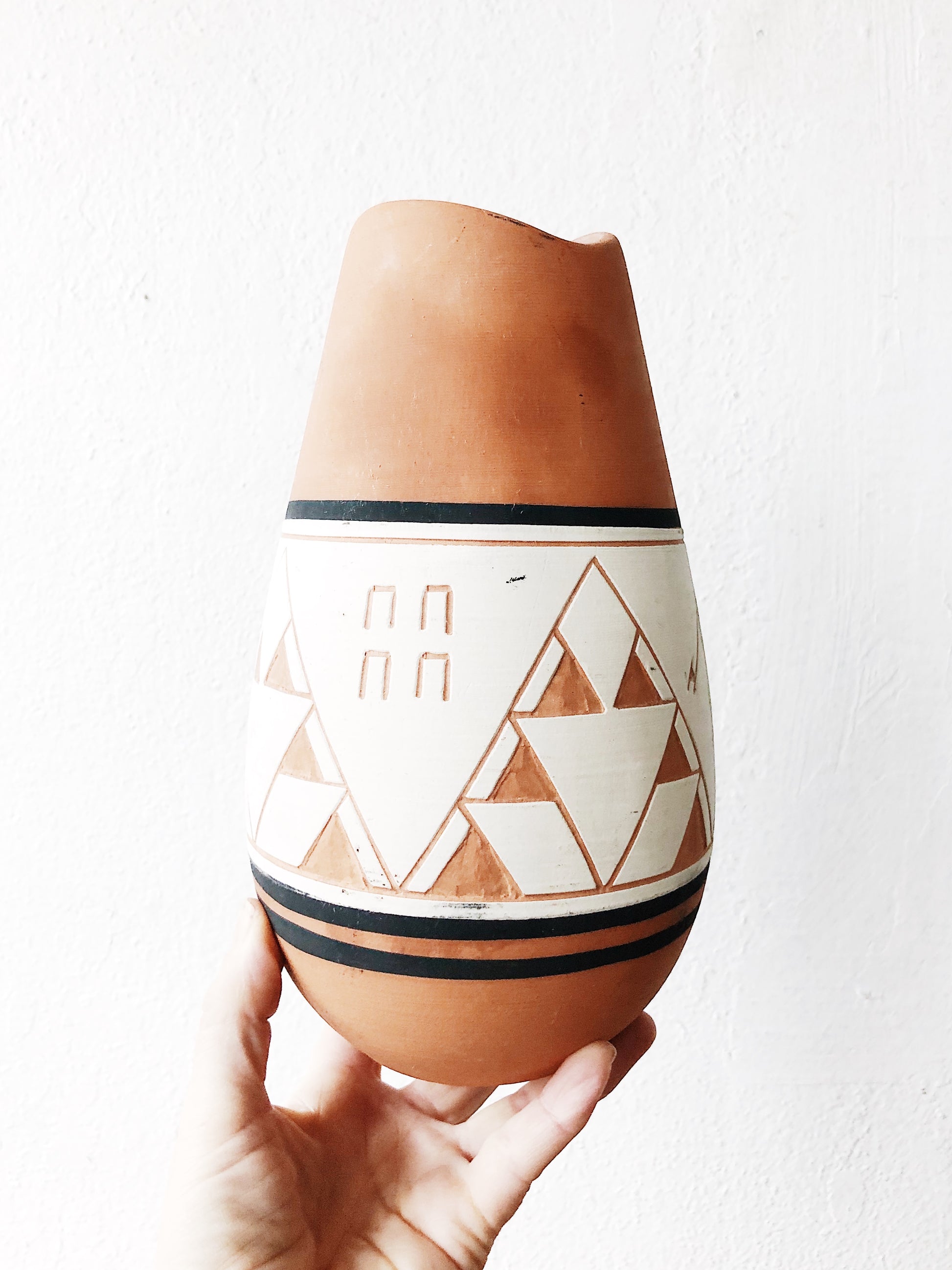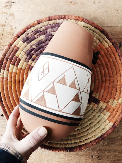 Wonderful piece of native Sioux pottery. Terracotta clay in traditional designs. Comes with maker tag and descriptions of the imagery
