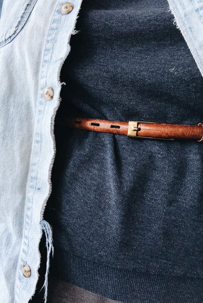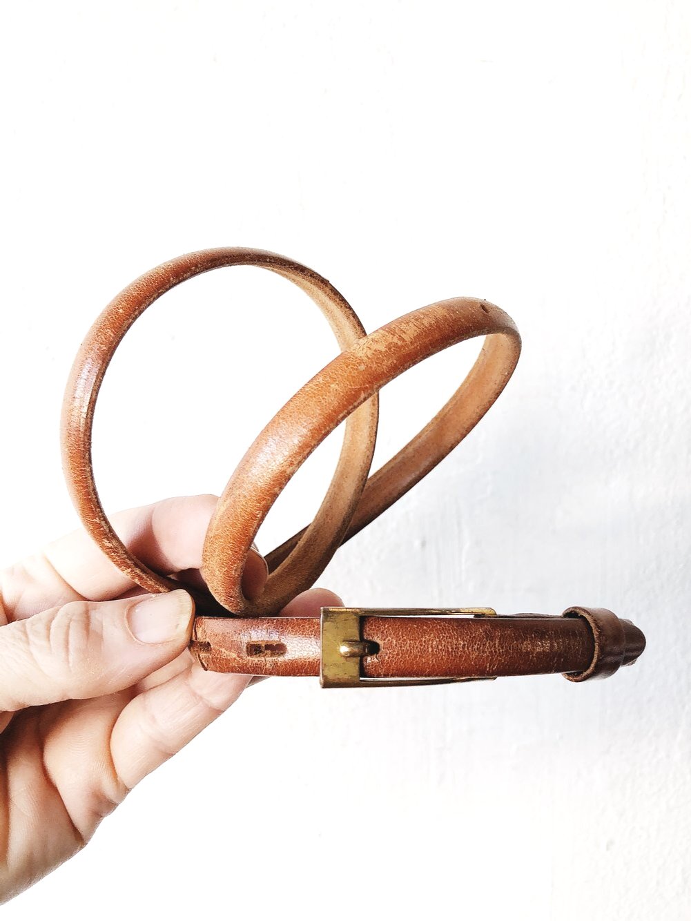 Simple and chic. Vintage saddle leather with aged brass buckle. A skinny mini