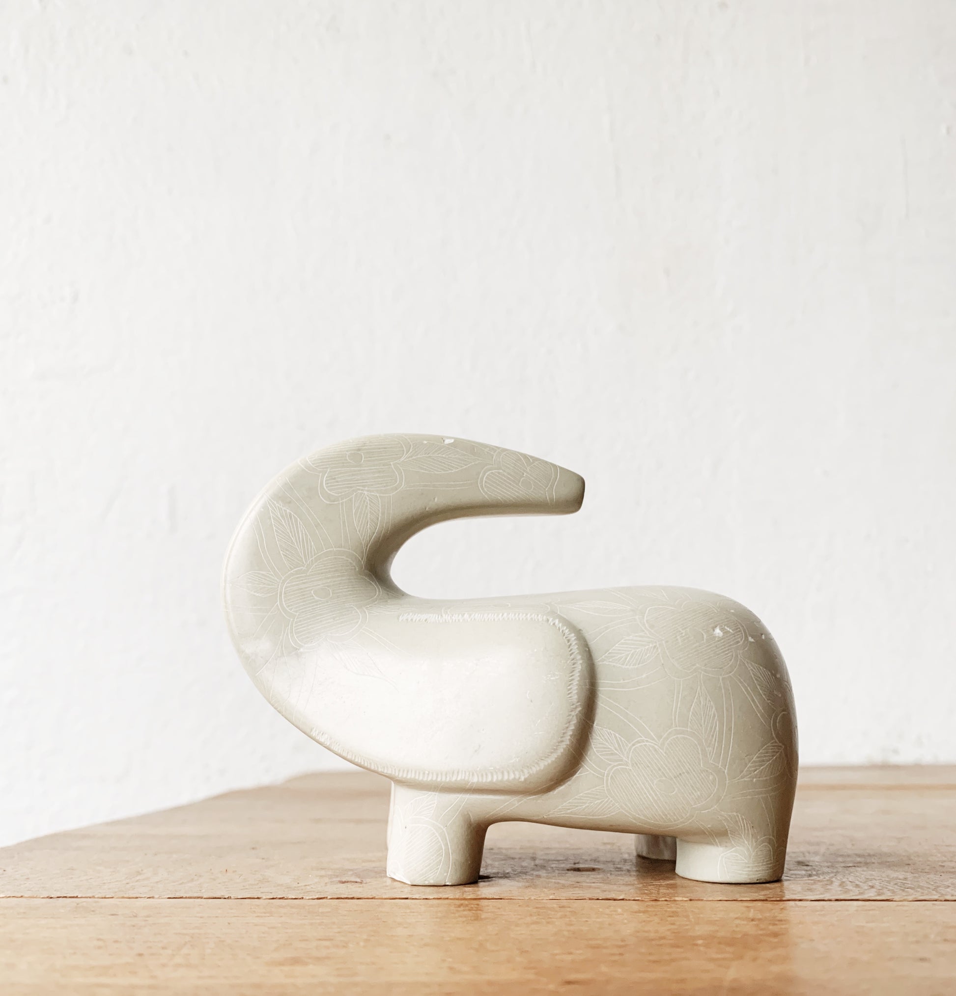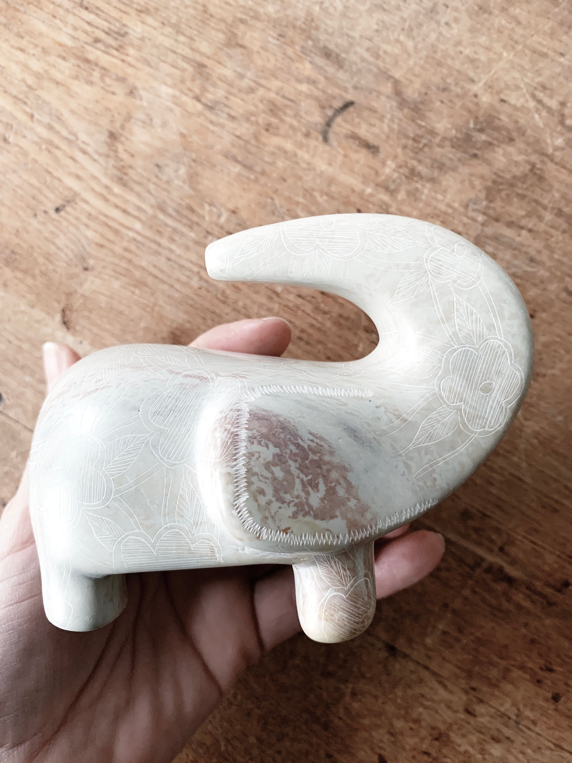 Sweetly etched vintage soapstone sculpture. Lucky upturned trunk. A few minor nicks on one side, please see photos.