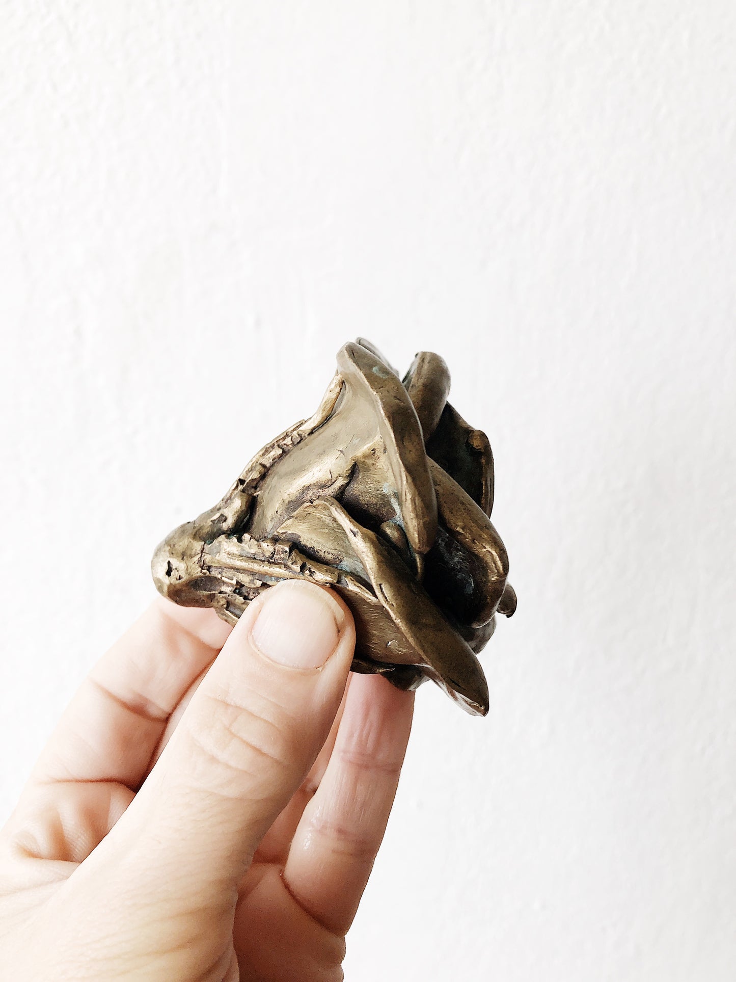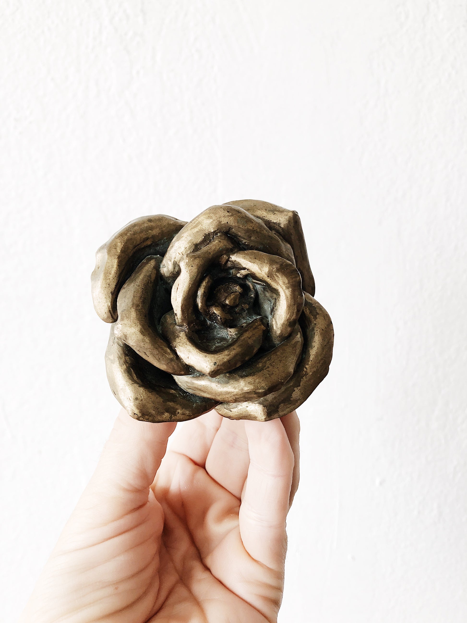 Beautiful old bronze rose that can be used as a paperweight or simply a shelf sitter. Lovely for the flower lover. Very heavy!