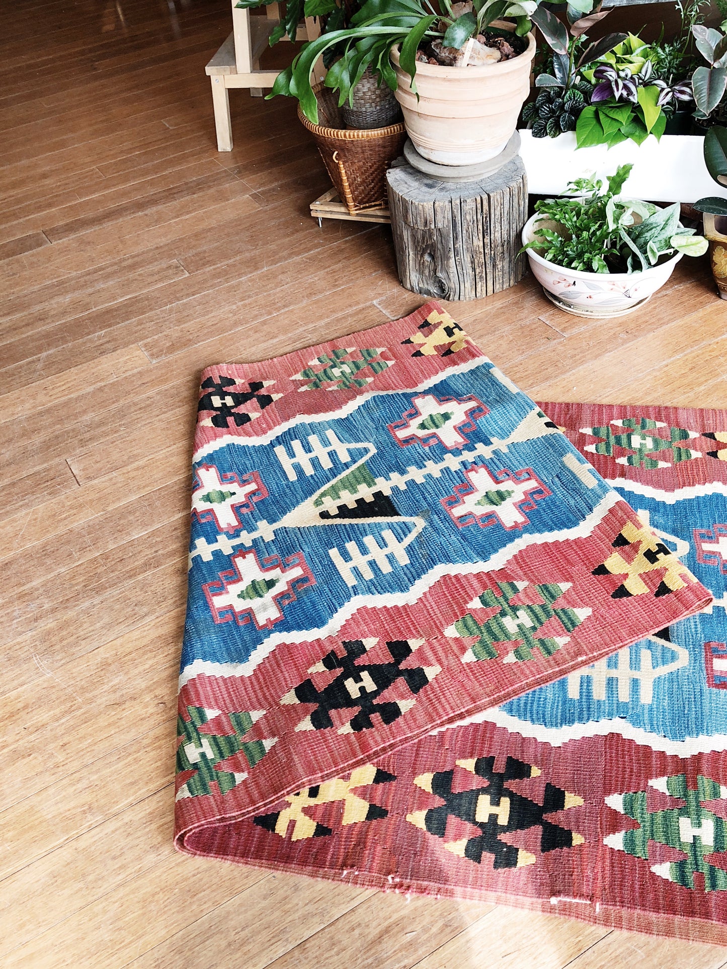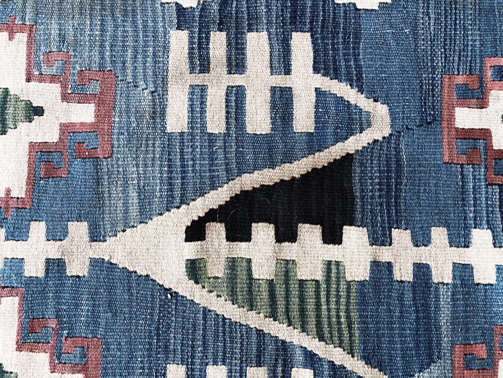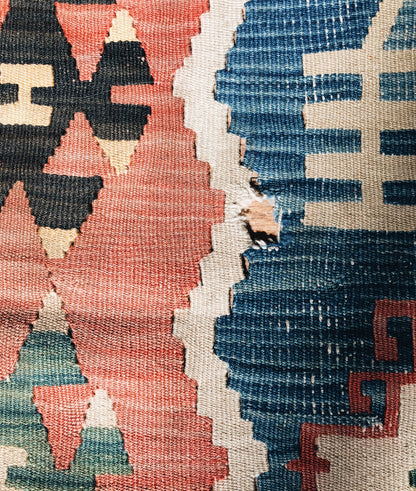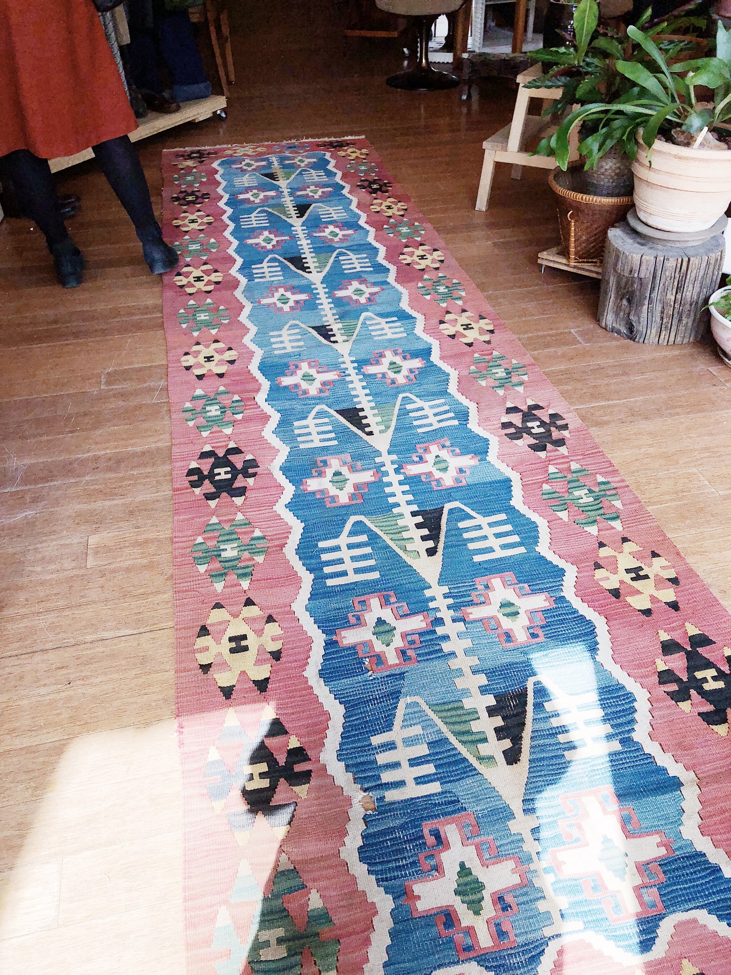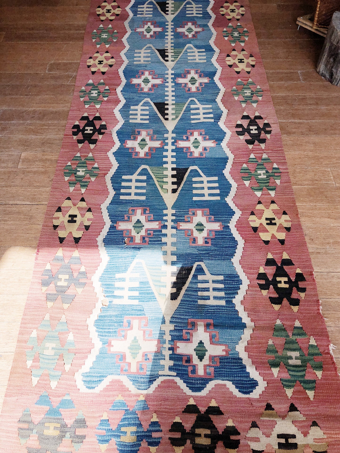 An unusually long Kilim runner in nice desert colors. One side is a bit more saturated, and the side shown a little faded, which we love. Two quarter sized seam splits and areas of age spotting. But honestly nothing detracts from this worn in beauty. No odors