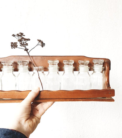 We love using these old wooden spice racks for plant propagation as well. Comes with two little hangers on the back and all of the bottles shown