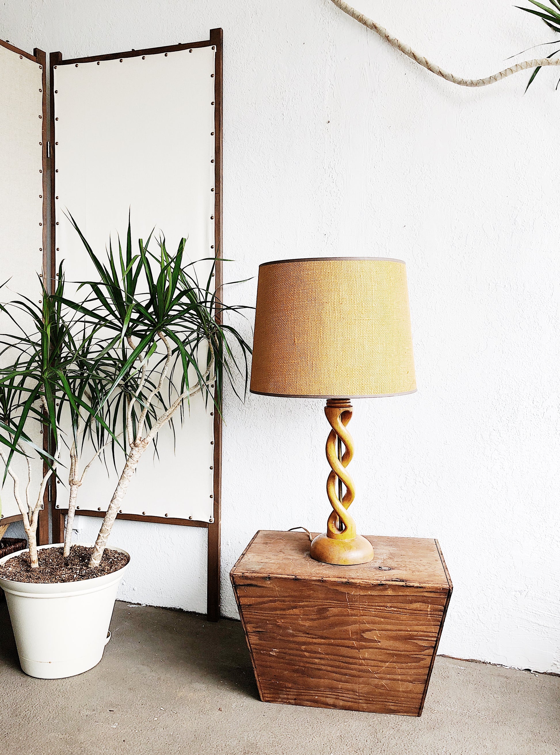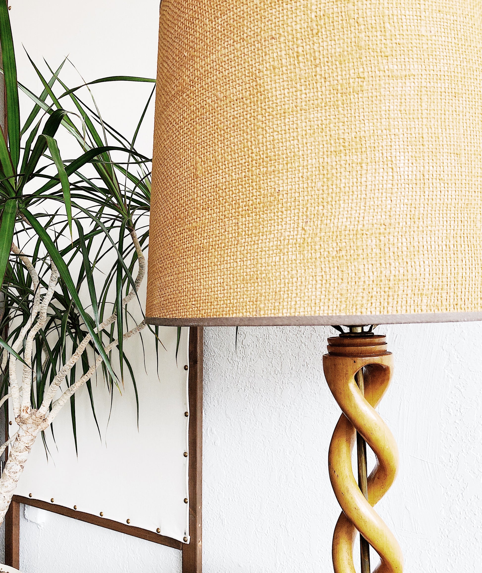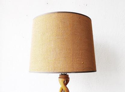 Tall vintage wood lamp with a twisted base, the twist was carved from a single piece of wood. Brass center rod. Nice big burlap shade. Lamp is in great condition. Shade has only a minor flaw as shown