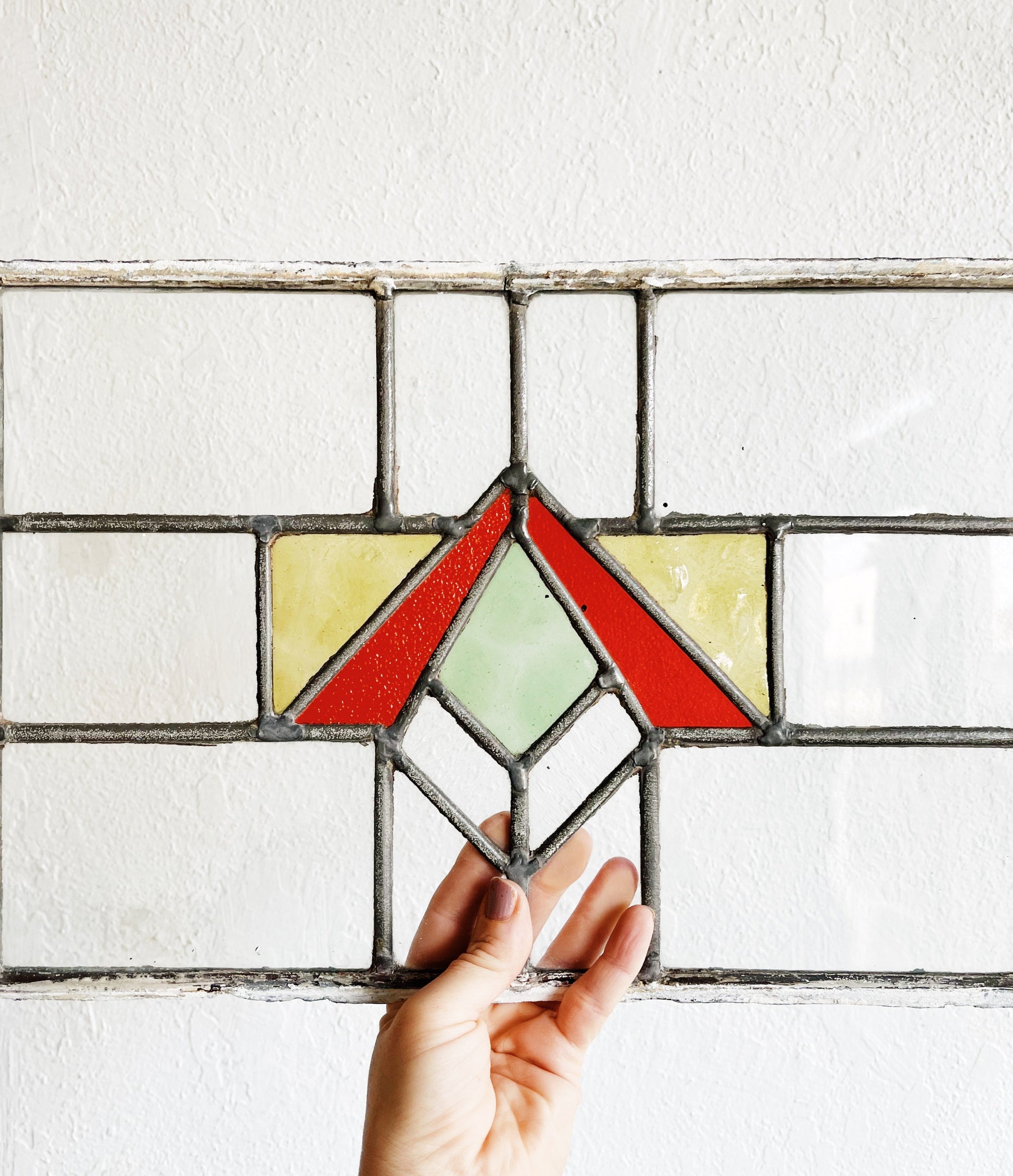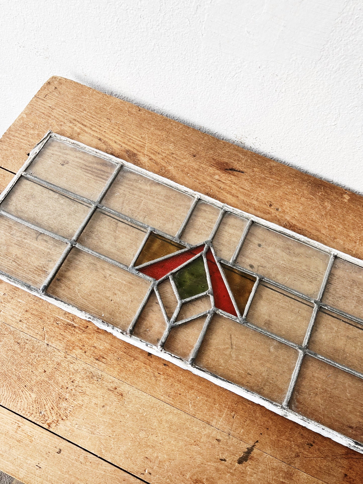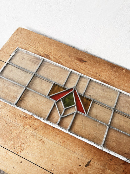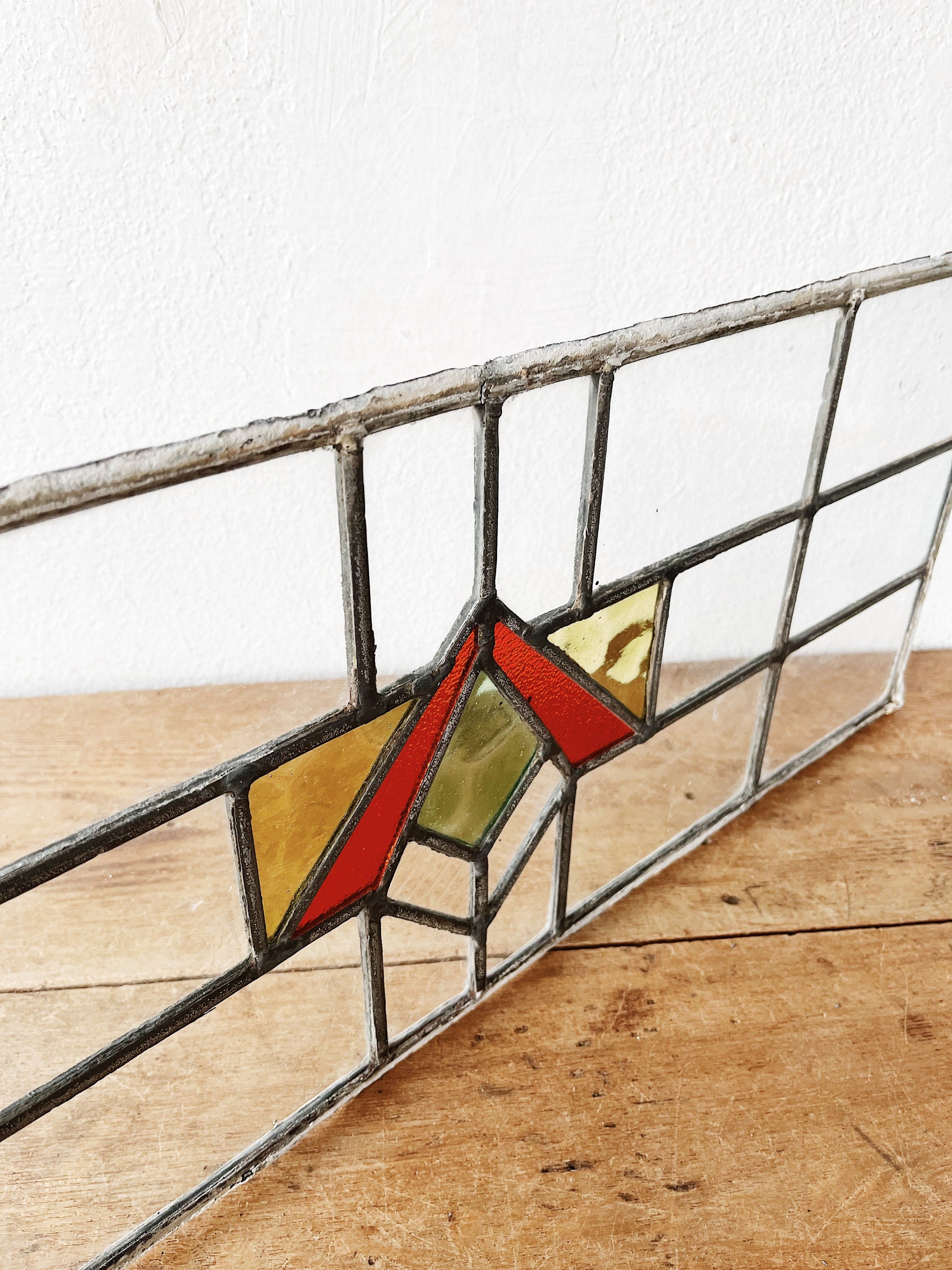 Deco era panel in stained and leaded glass. Has some bend or play in the center. Due to the fragility of this one we will not be able to ship it.