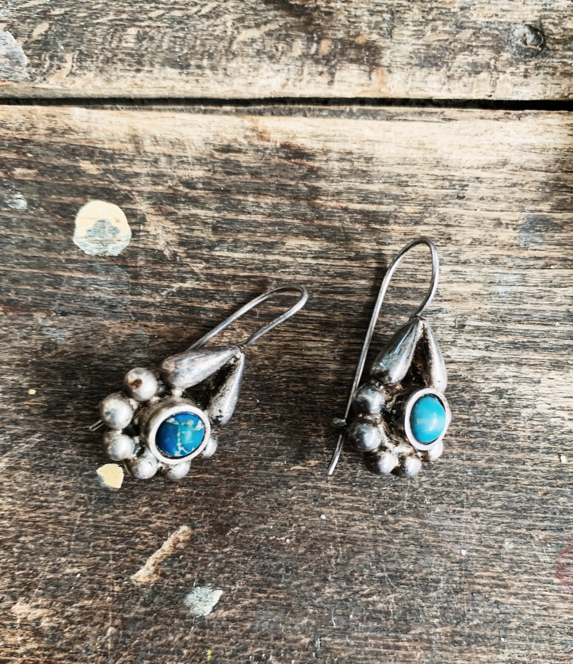 Gorgeous vintage sterling silver earrings with turquoise. Long hook with loop in back. Perfect size for daily wear. 1” drop