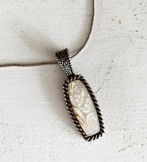 Gorgeous vintage silver pendant with carved mother of pearl. A stunner! The back of the pendant is beautiful too. Stamped