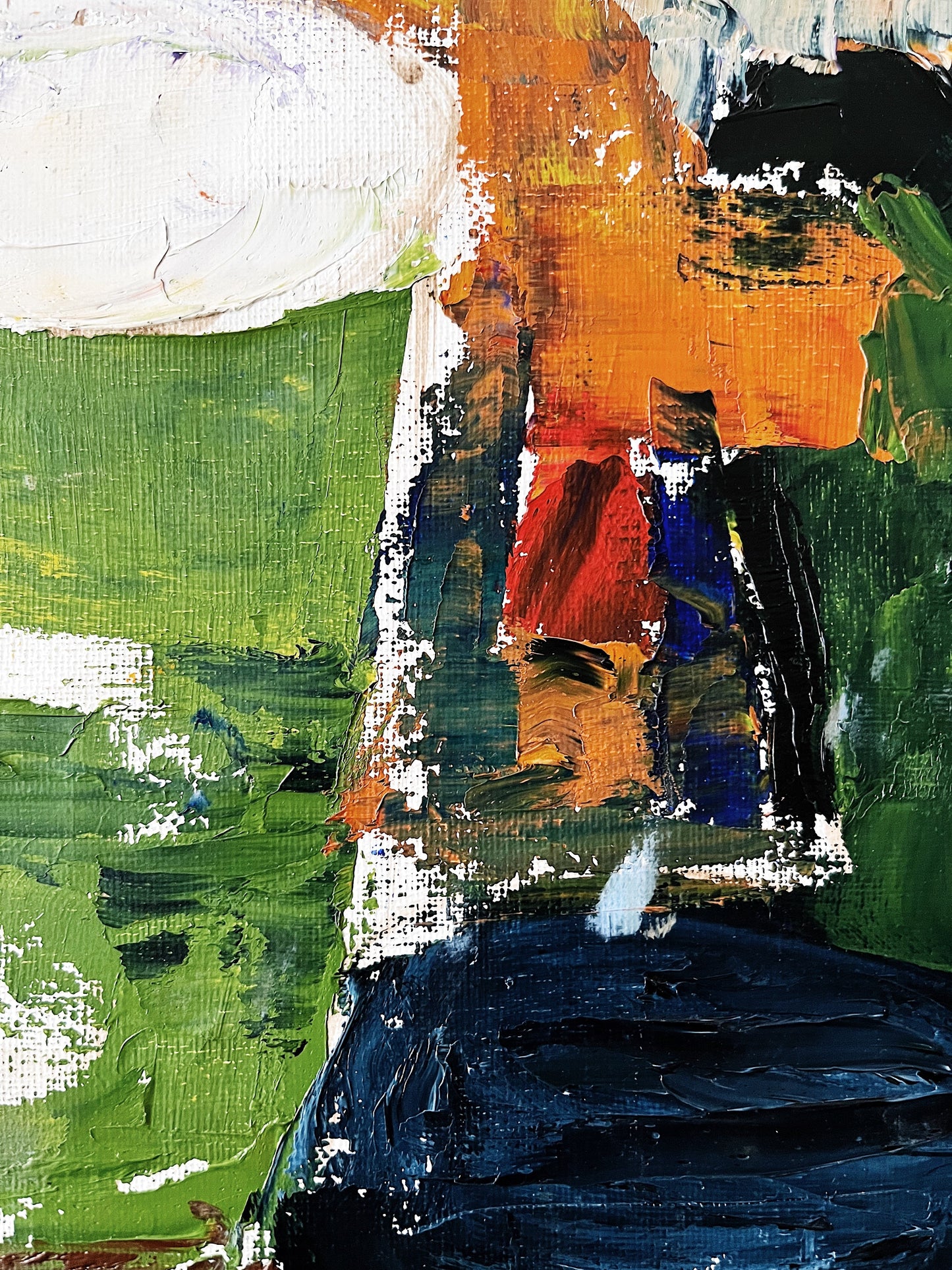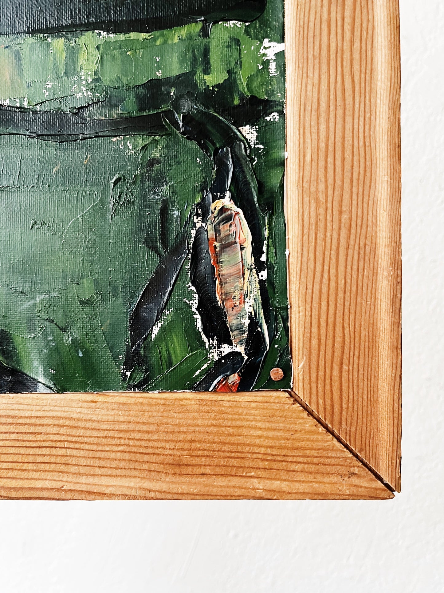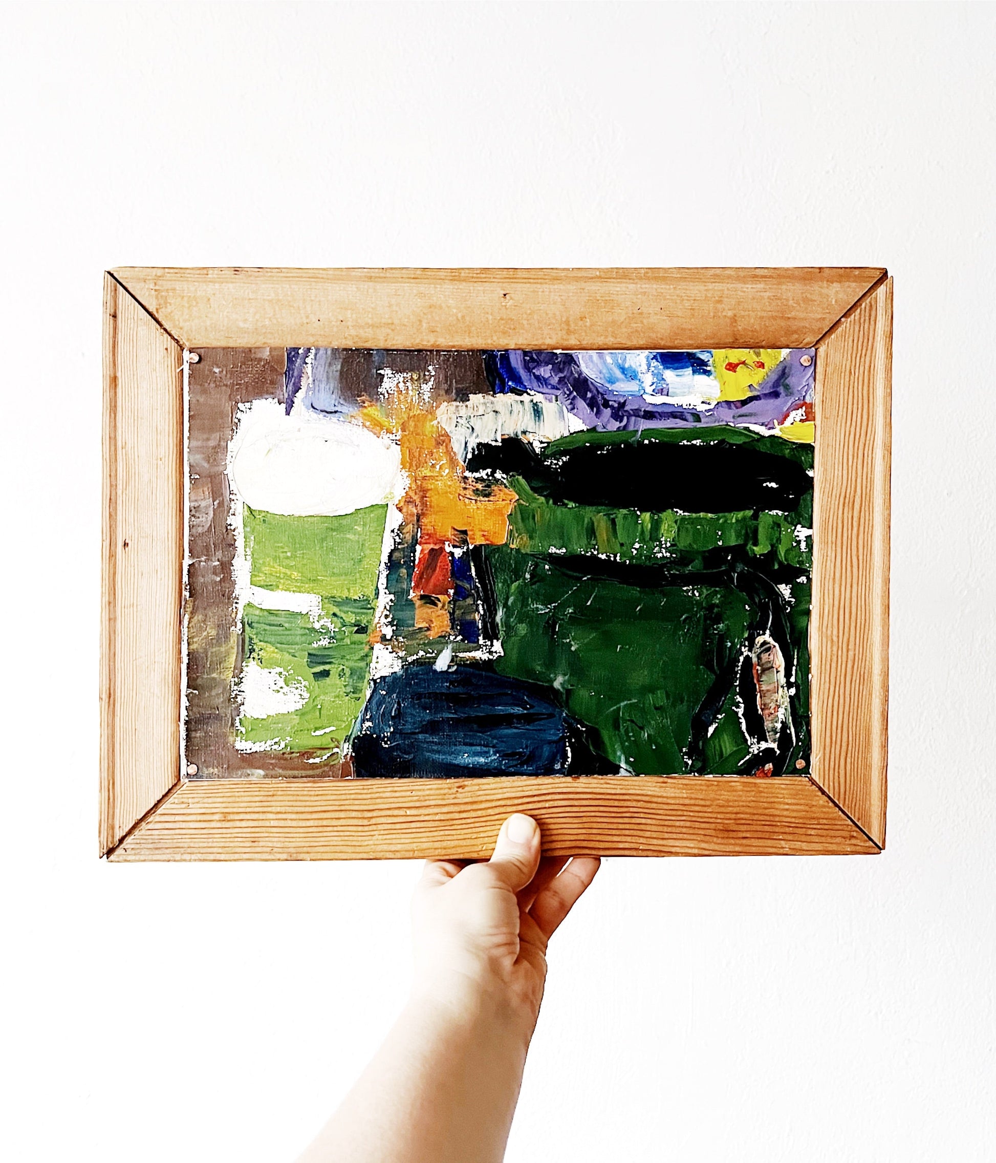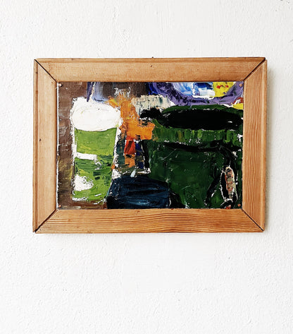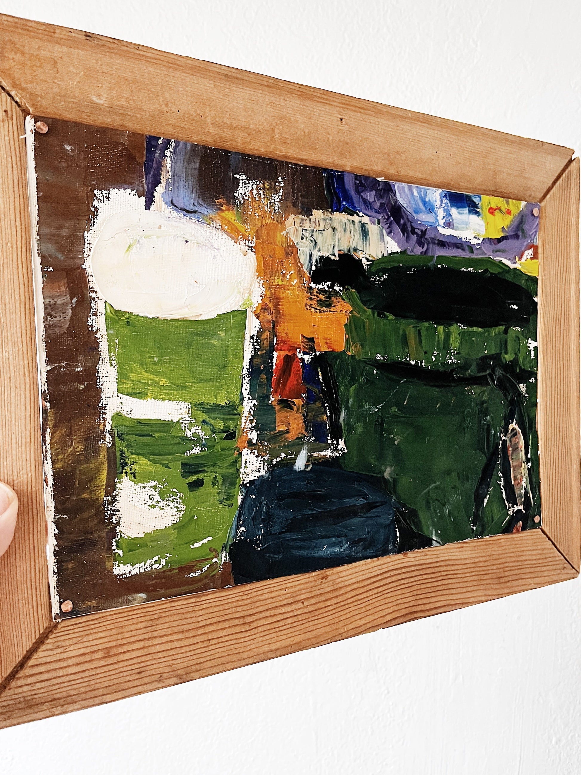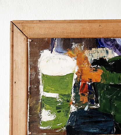 Fab abstract still life painting with heavy areas of impasto. Oil on canvas mounted on cardboard. Love the little anchovy in the corner. Framed in a handmade frame with tiny copper nail details. Hanger on reverse