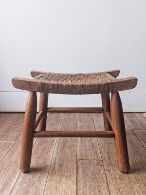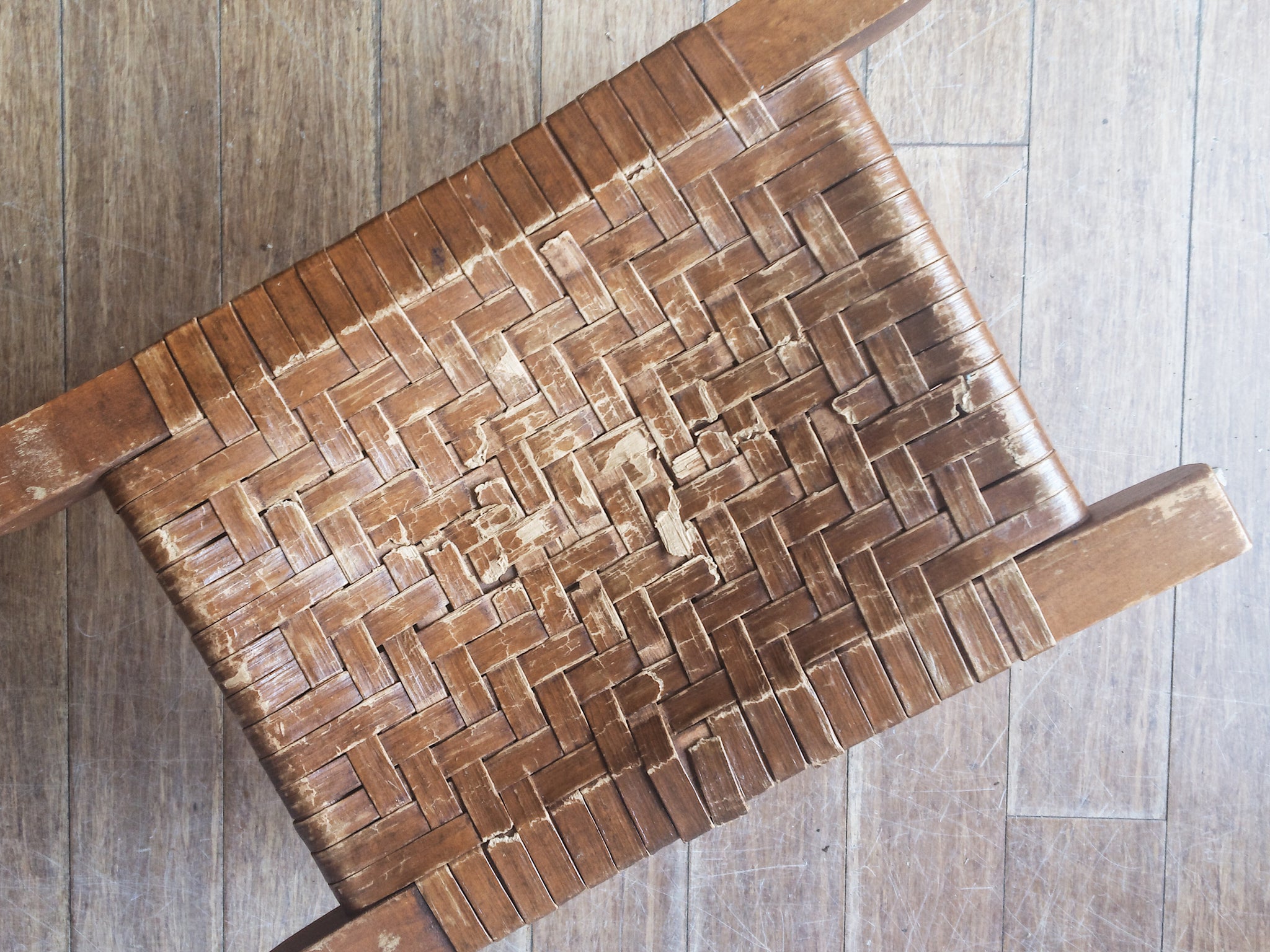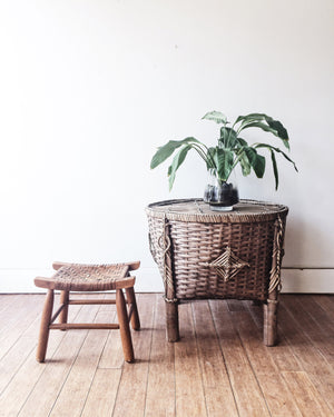 Wood with woven top. Some fading and wear to the top. Sturdy though and a lot of use left in this beauty.