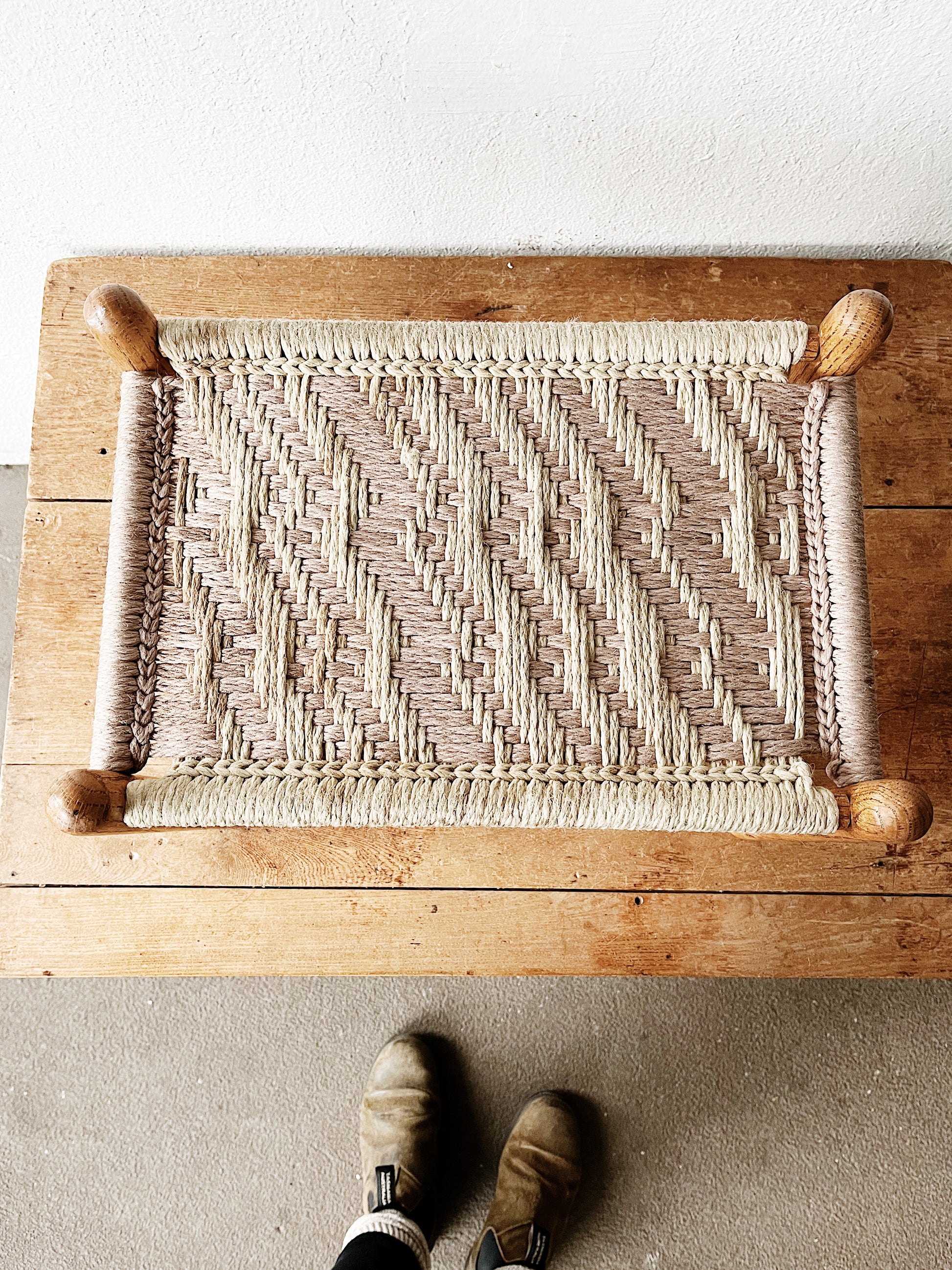 Simple folk stool with a woven seat. Wool blend in neural and lavender tones.