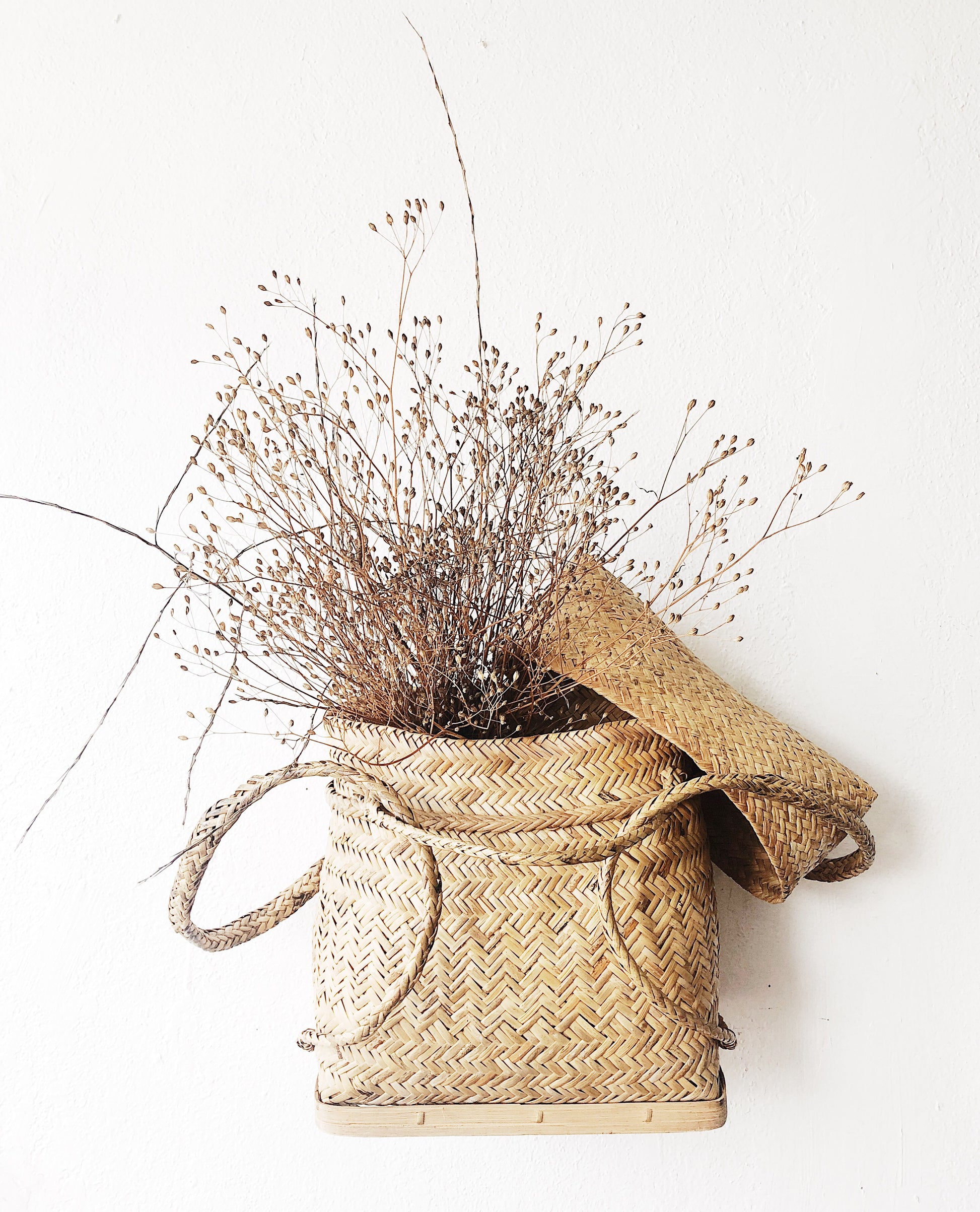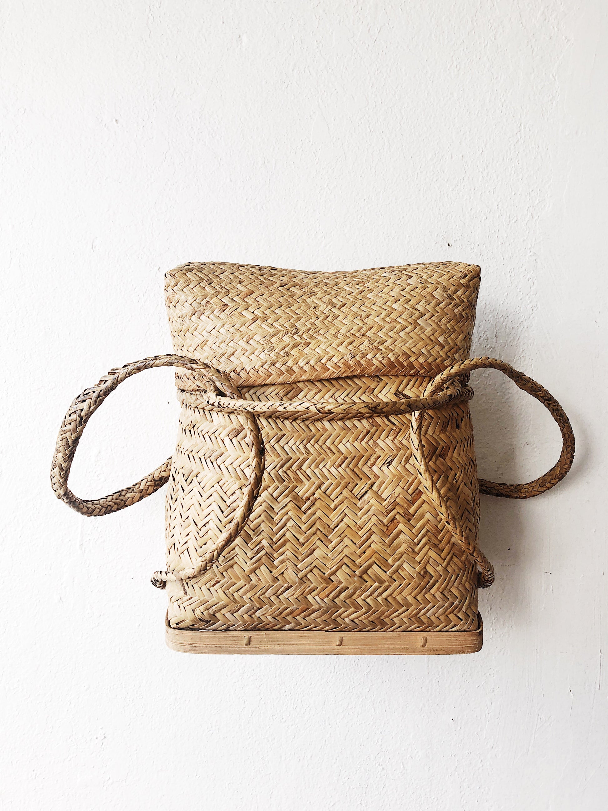 Vintage herringbone woven straw back pack that we love using on the wall. It stands too. And of course, can be used to tote your swimming suit to the river as well. Nice n big