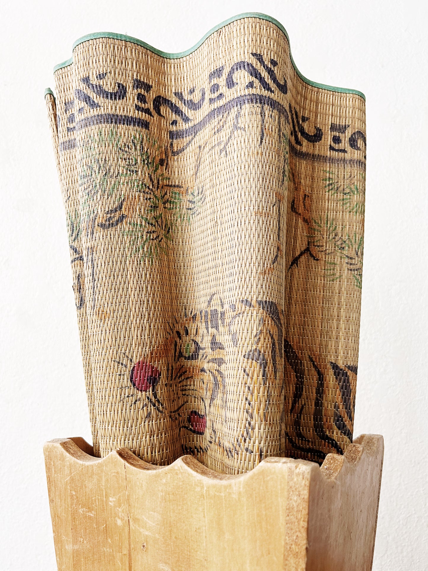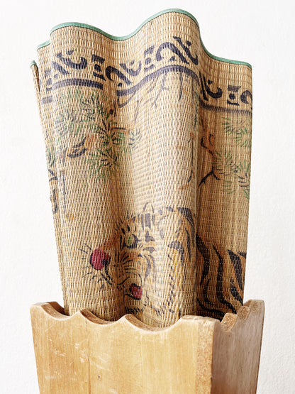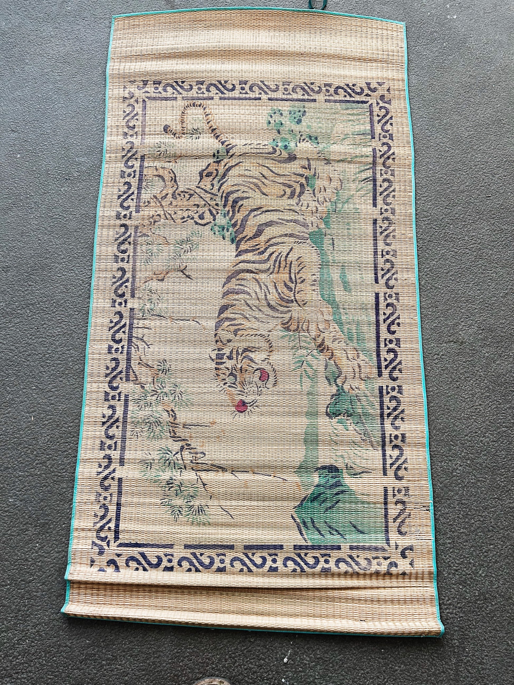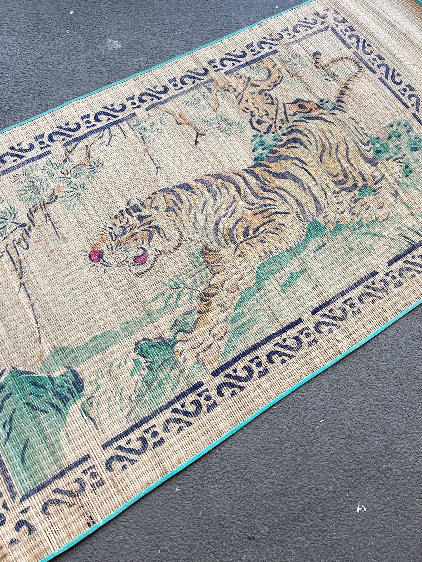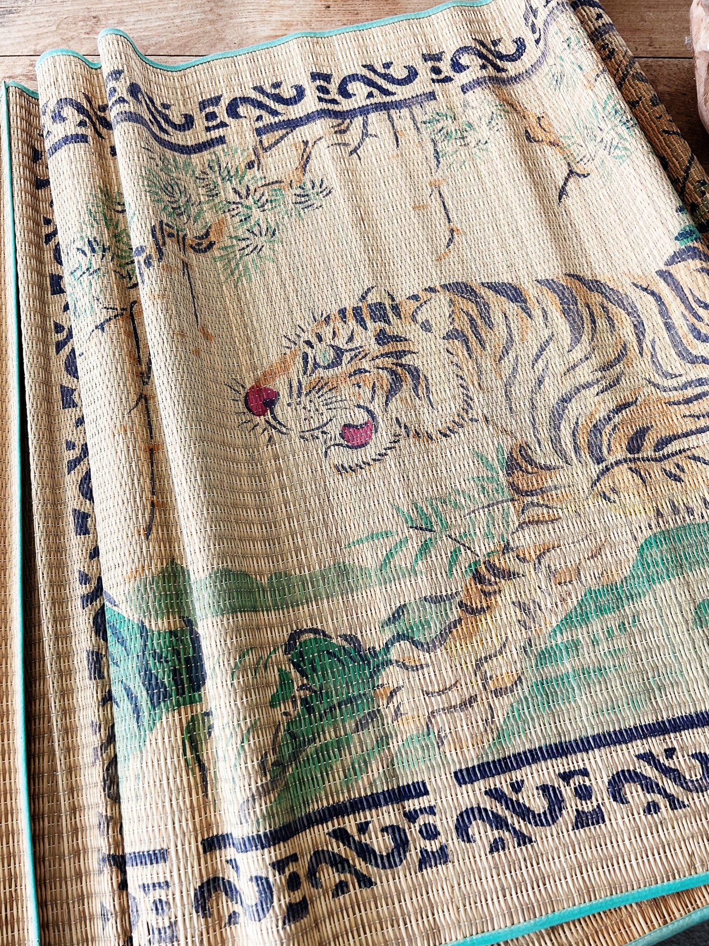 Vintage straw mat with tiger print. A lovely one in nice shape with green silk ribbon tie. Perfect single size beach/picnic mat.