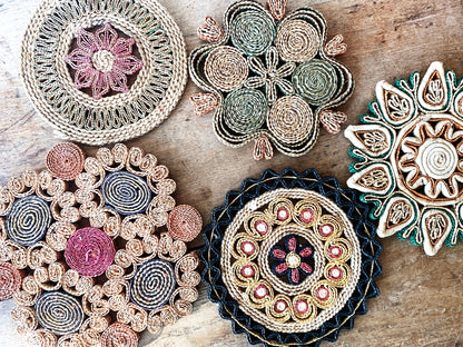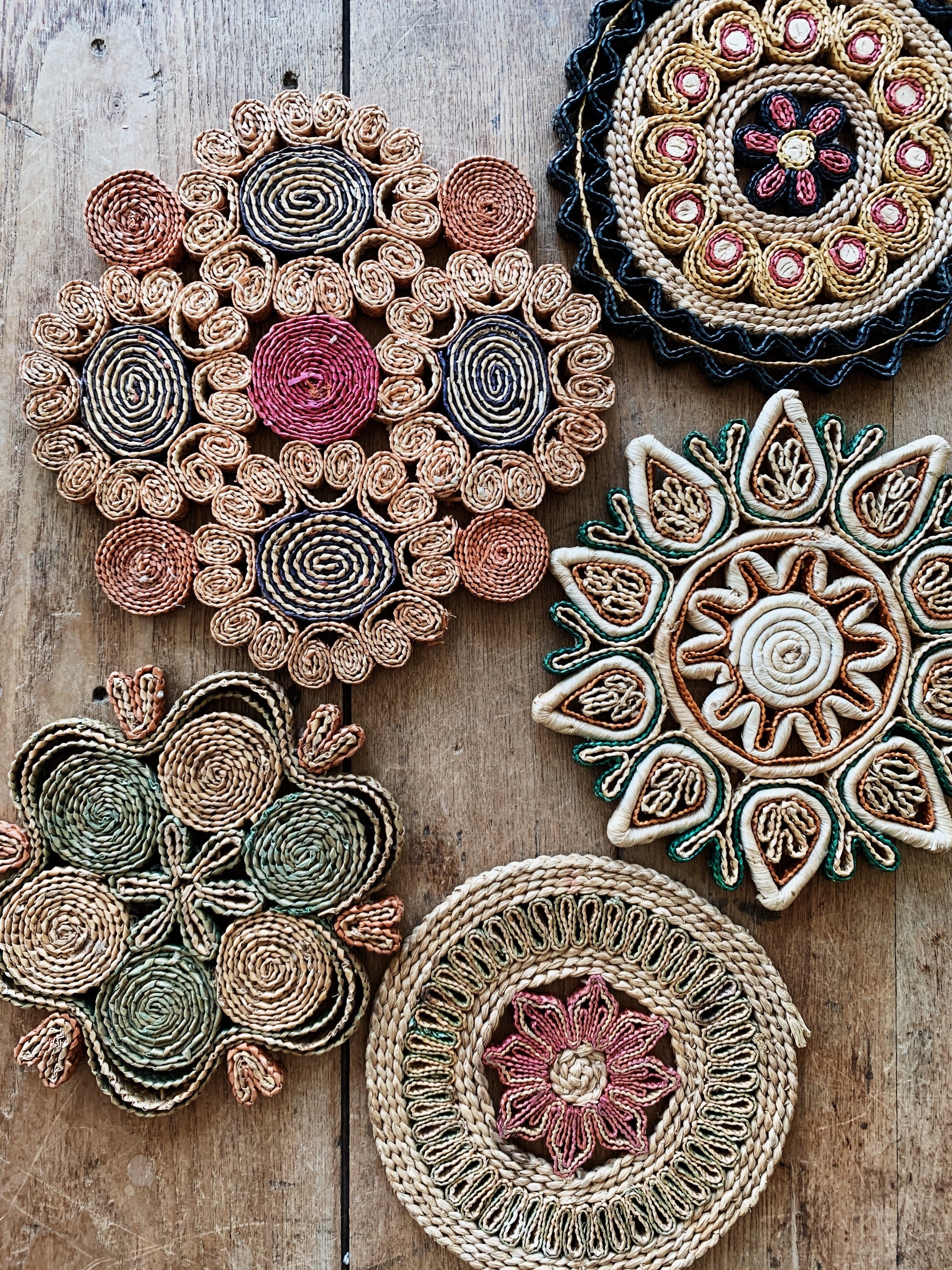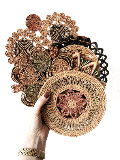 A wonderful collection of five vintage straw trivets. We love these! Pretty and useful