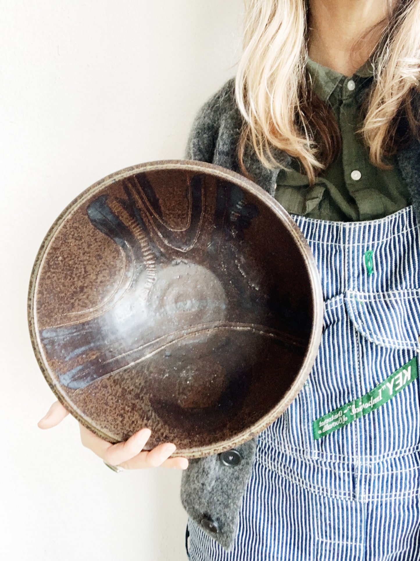 large vintage pottery bowl in deep brown. Beautiful incised patterning on the interior. Weighty! Signed and dated 1967. excellent condition