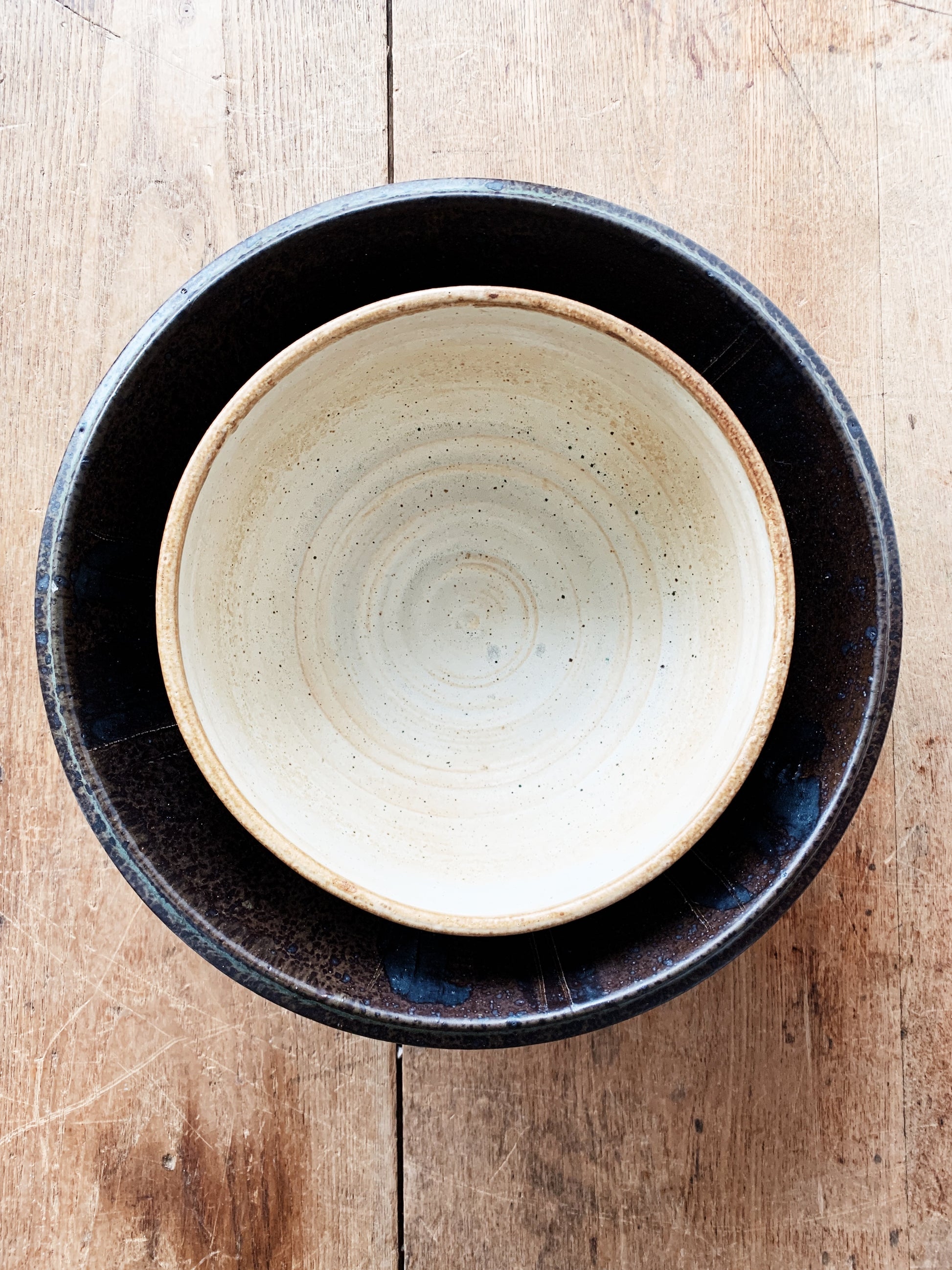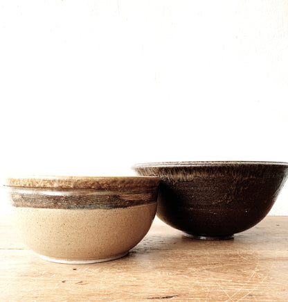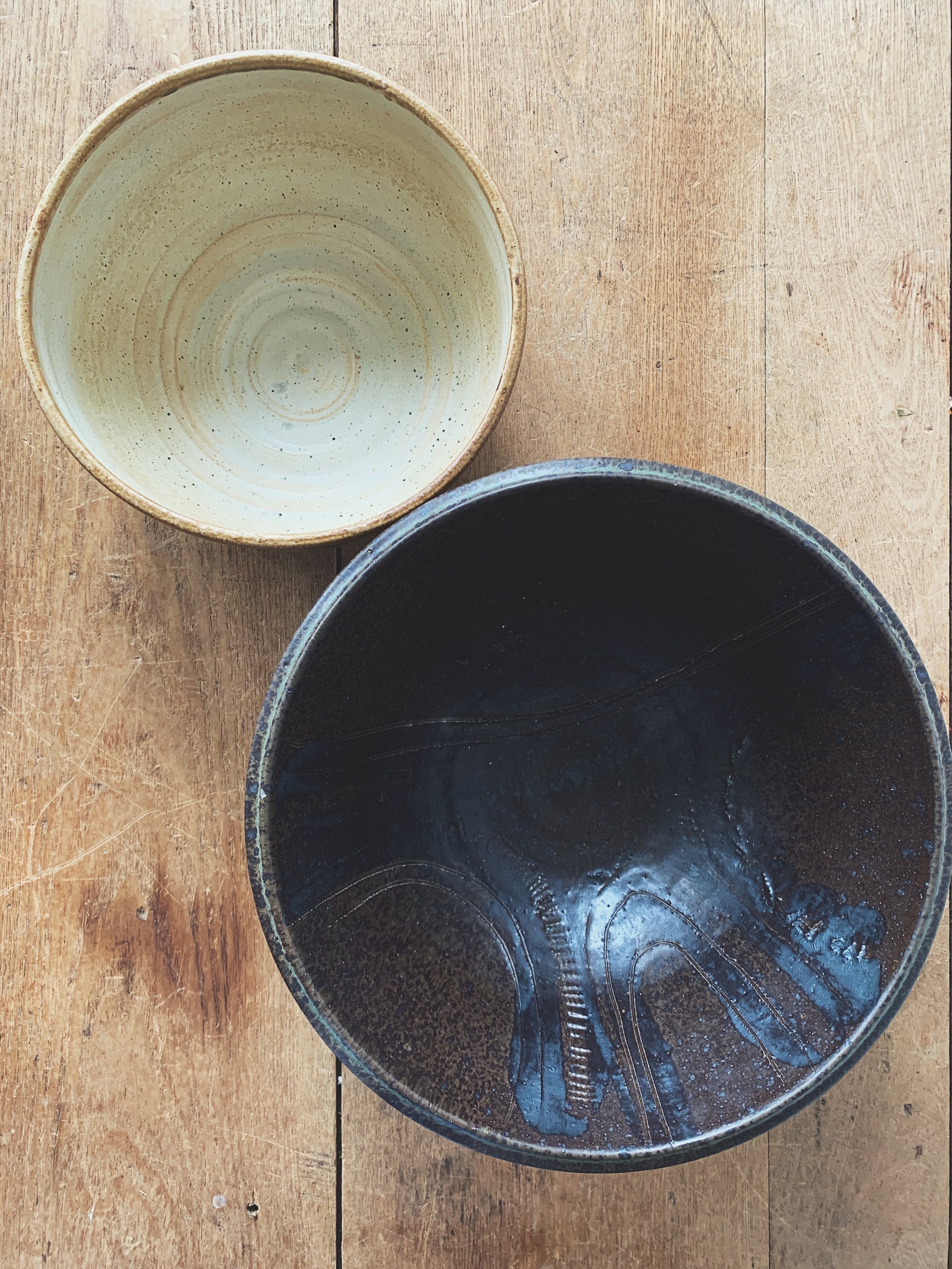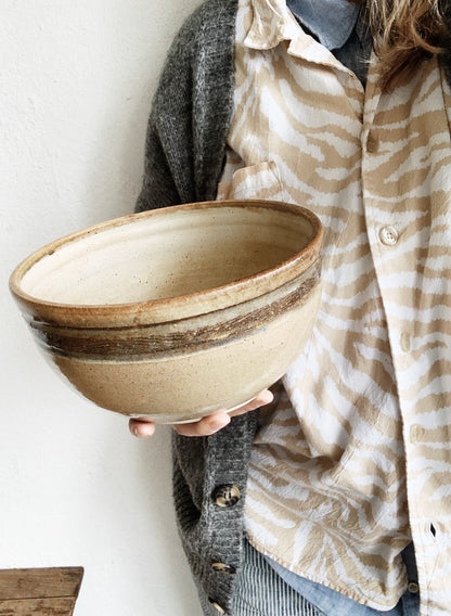 Weighty stone ware pottery bowl in speckled natural ochre glaze with incised indigo and burnt umber band.