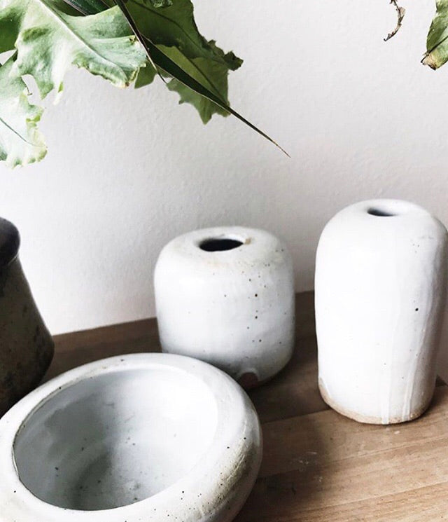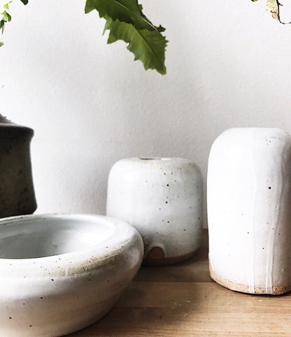 Great studio pottery collection in speckled white matte glaze. Low planter and two lovely shaped vases