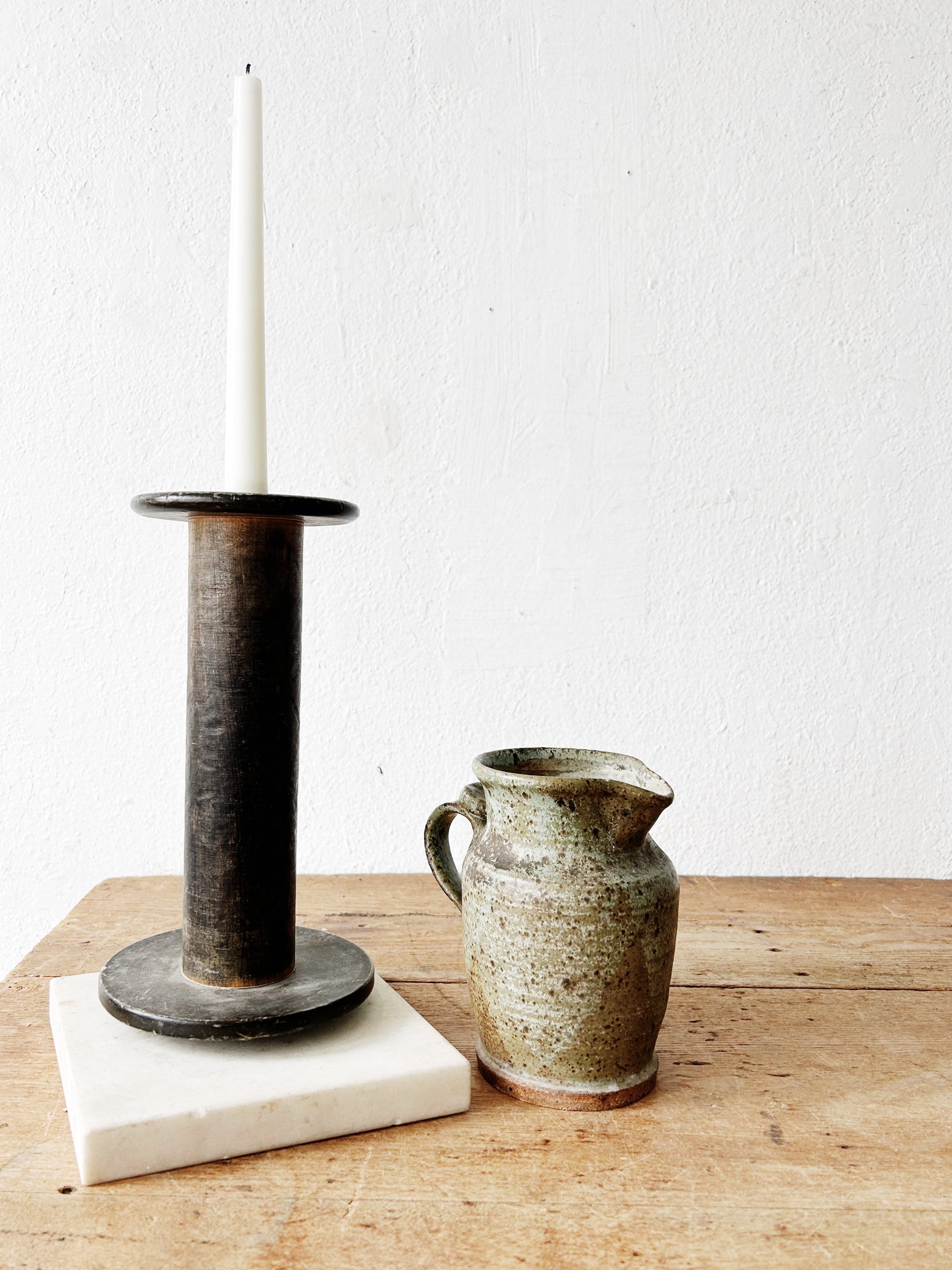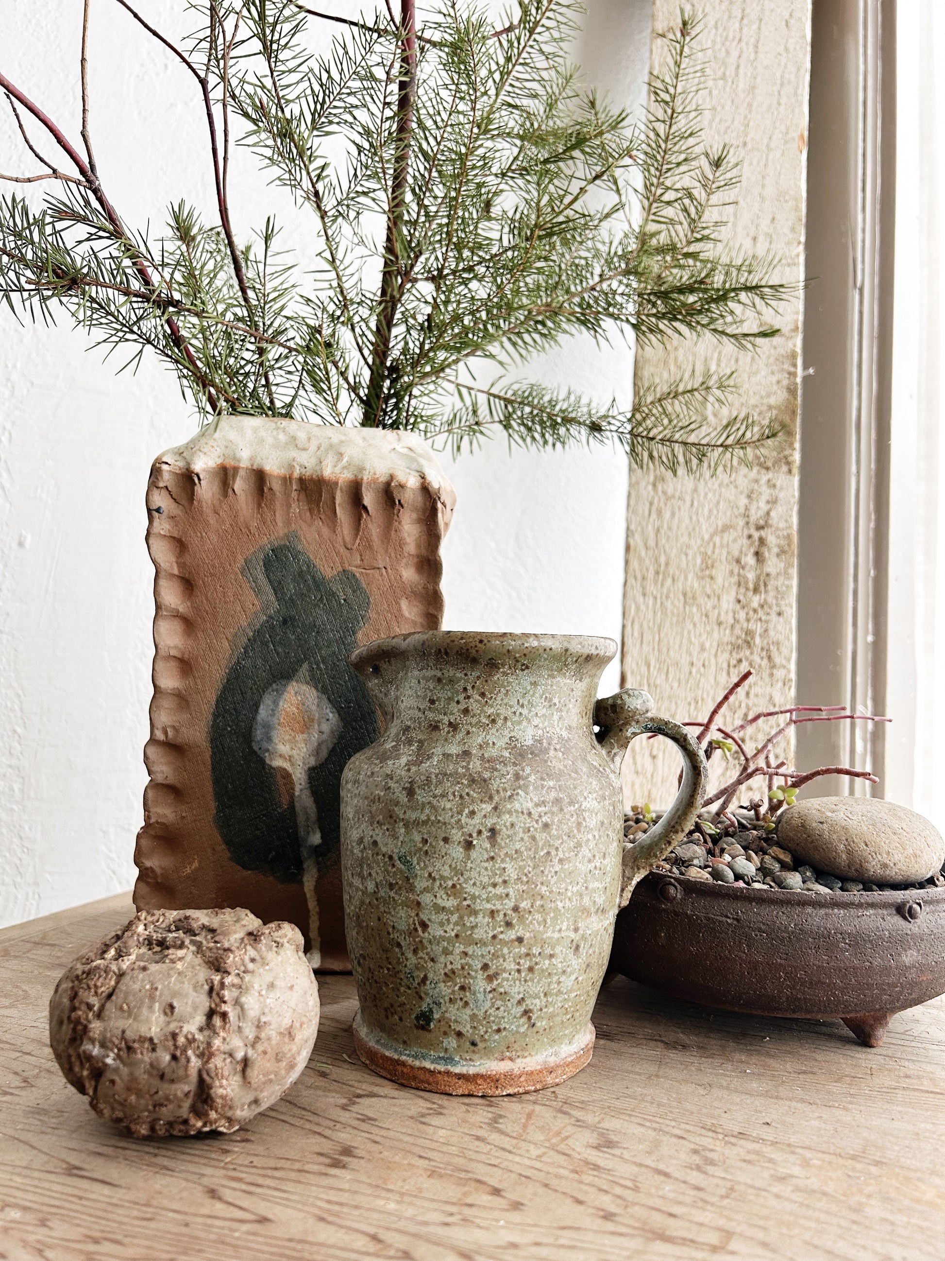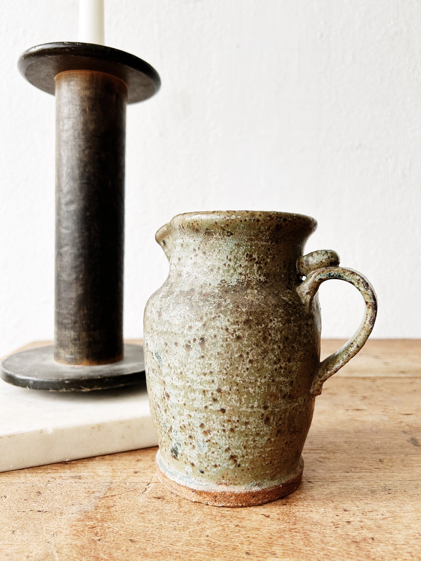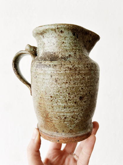 Earthy and lovely studio pottery pitcher with prettiest blue brown mottled matte glaze. makes a great vase.