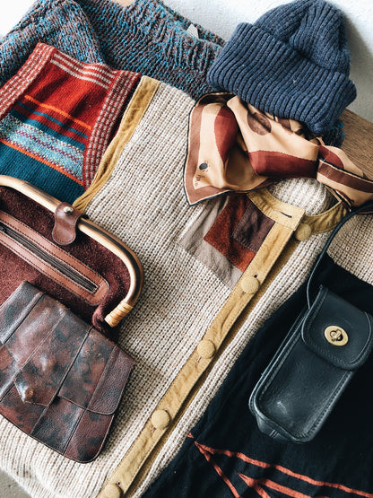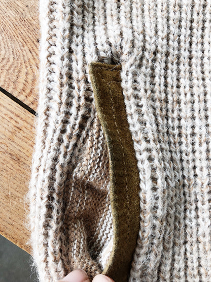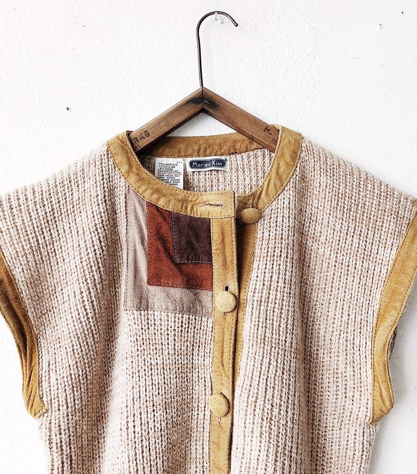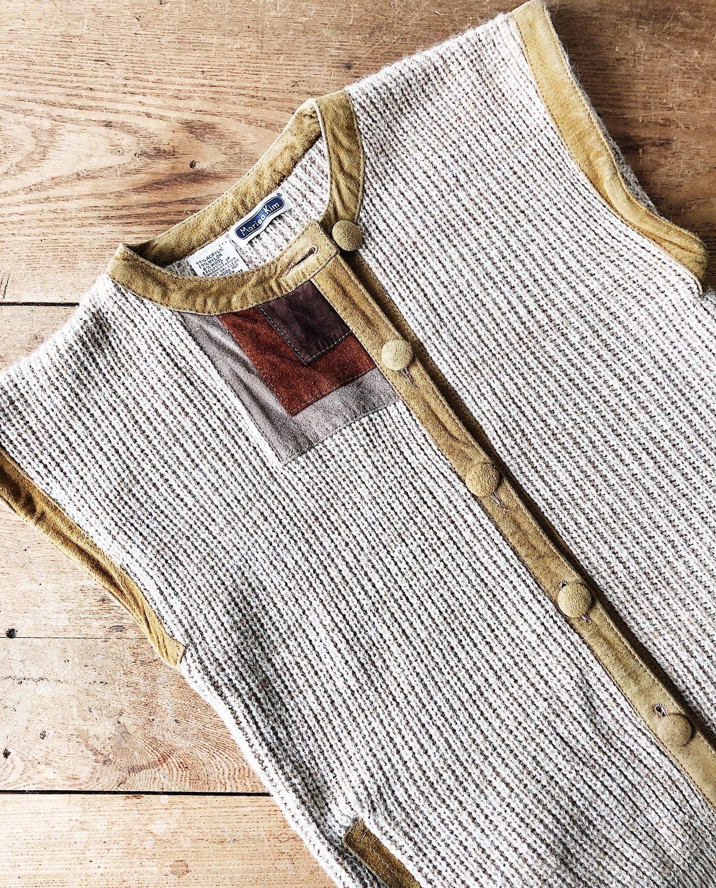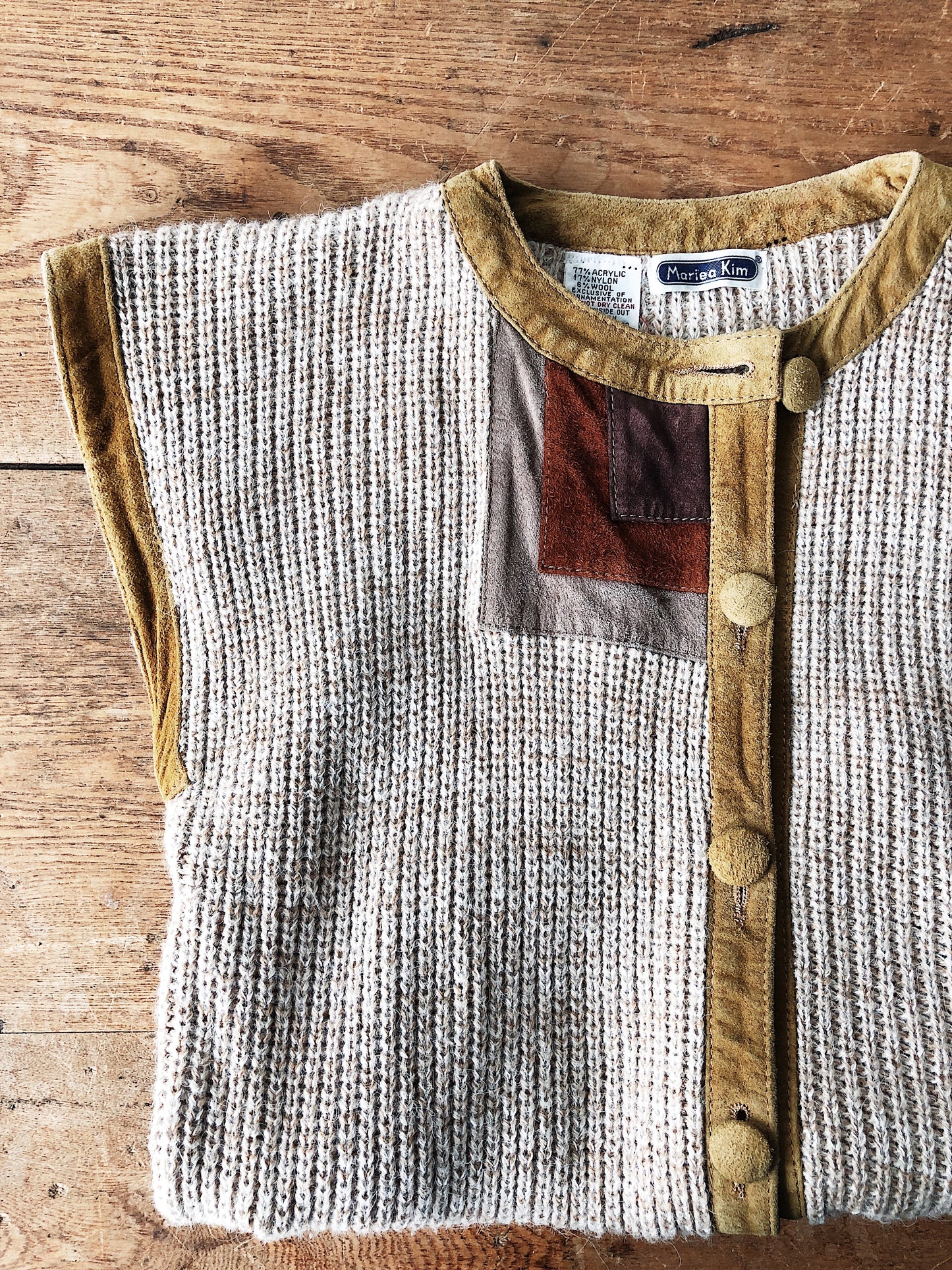 Very cool bauhaus style sweater vest. Those suede patches and trim! Even the pockets look cool. Man made and wool fibers