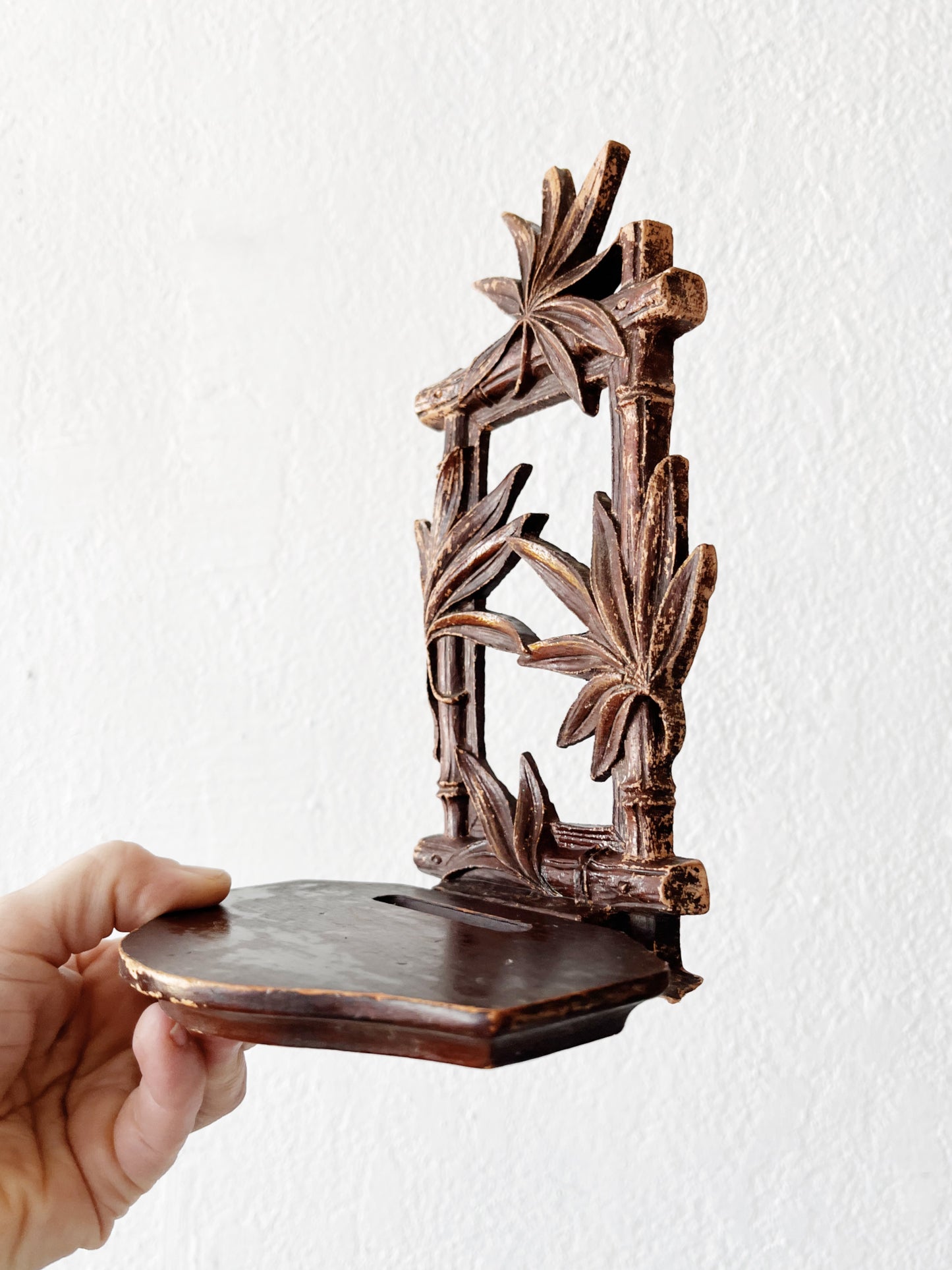 A sweet little stand that we’ve discovered can hang as a sweet little shelf. Sirocco wood that’s aged a bit. Some small defects that don’t affect use are present