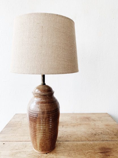 tall Cocoa brown ceramic with brass harp snd burlap shade. 25”