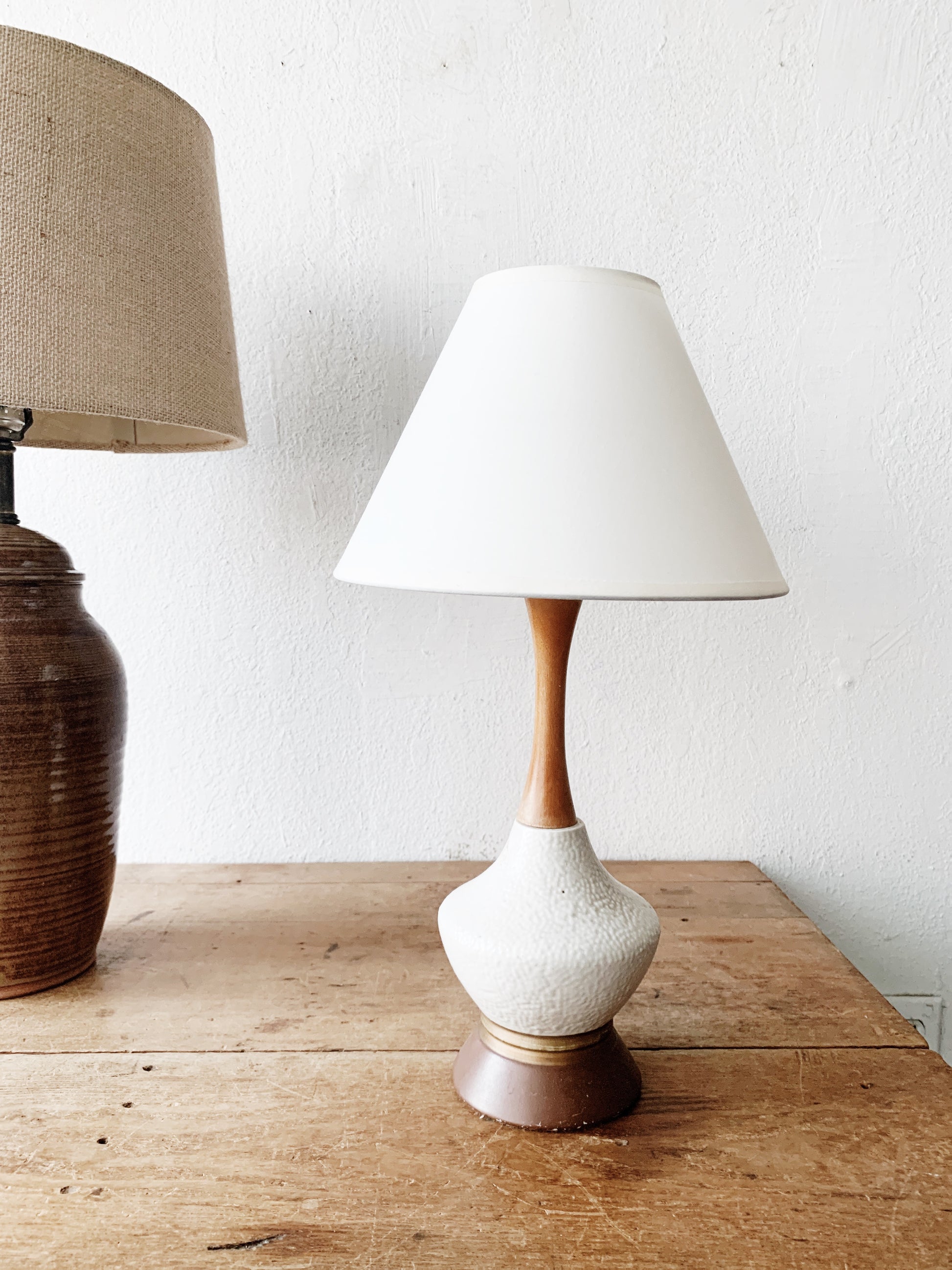 Petite mid century ceramic with wood base and top, newer white linen shade 19”