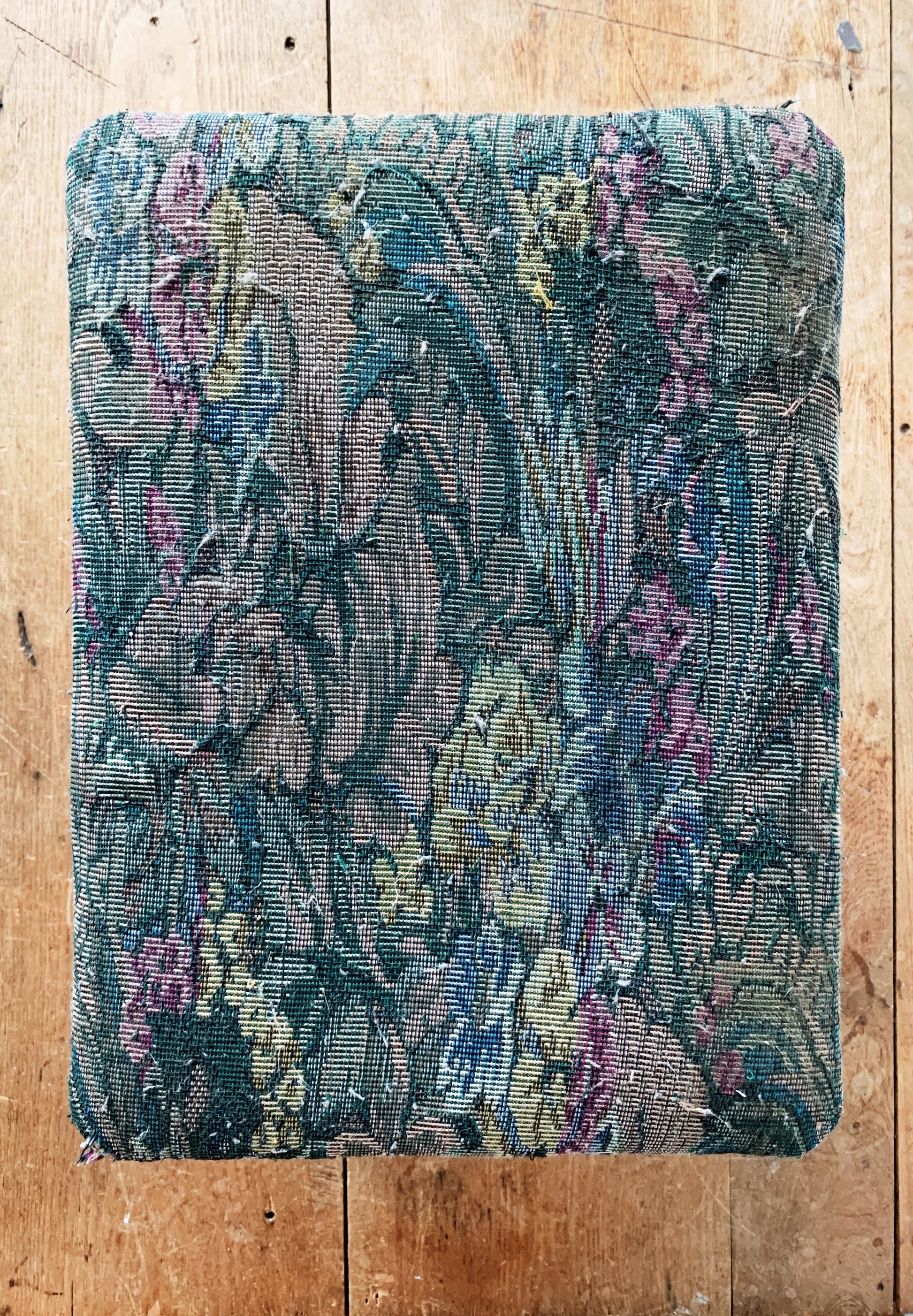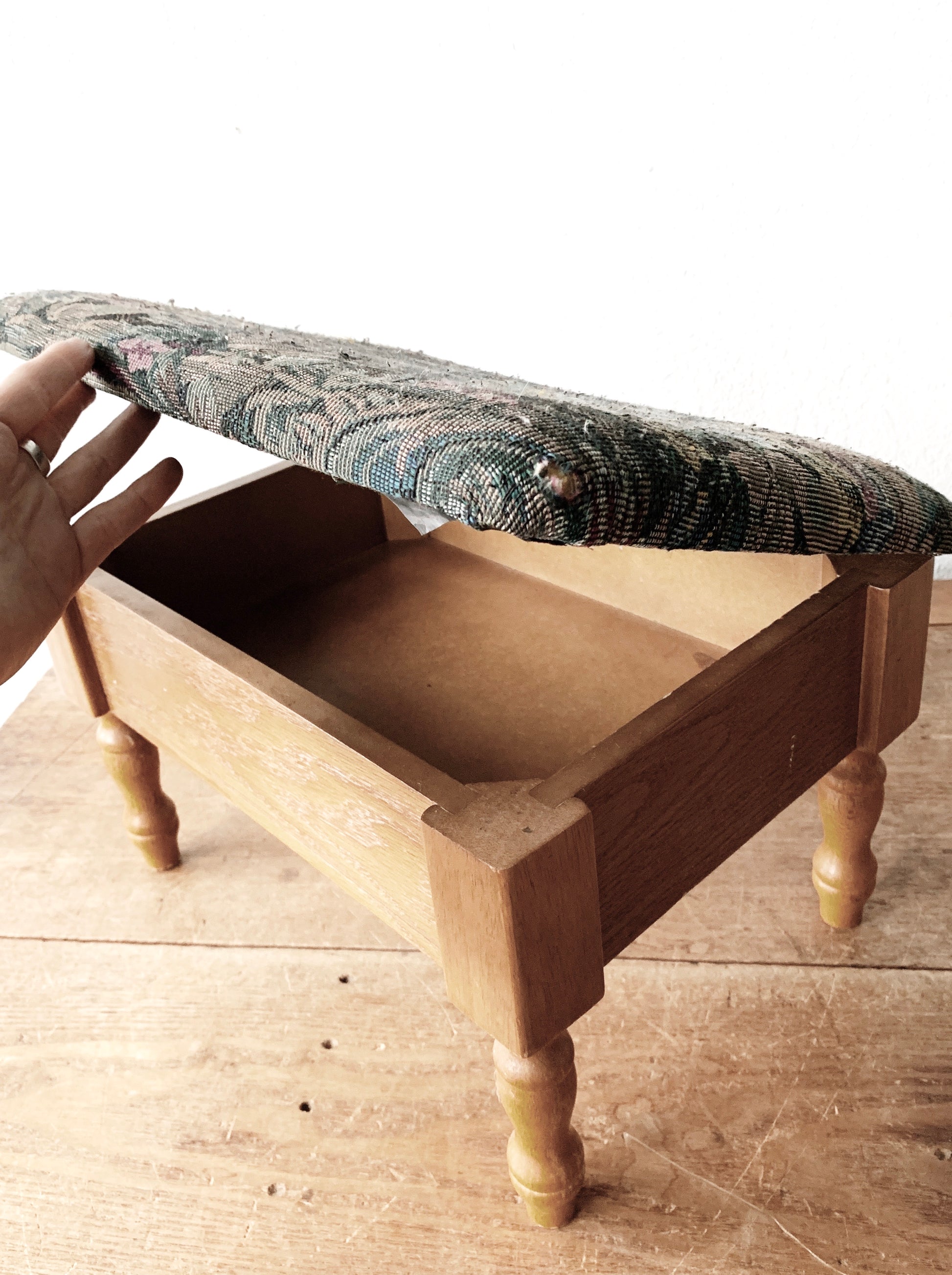 Vintage wood footstool with tapestry upholstered top that flips open and reveals storage. Sweet, sturdy, fabric is worn.