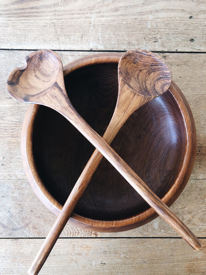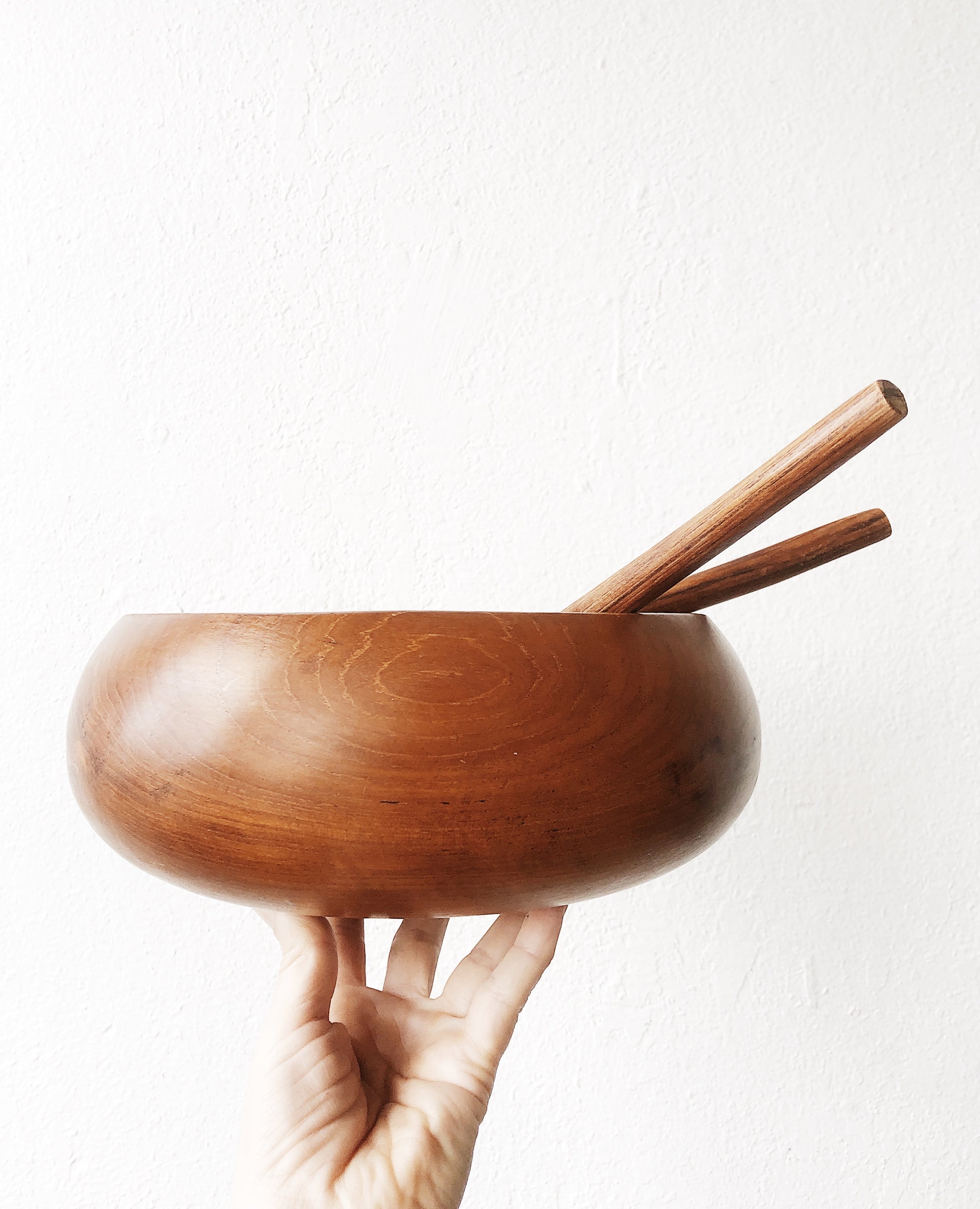 Beautifully toned teak salad bowl with a set of mod servers. Rounded shape is very appealing. Lovely condition.