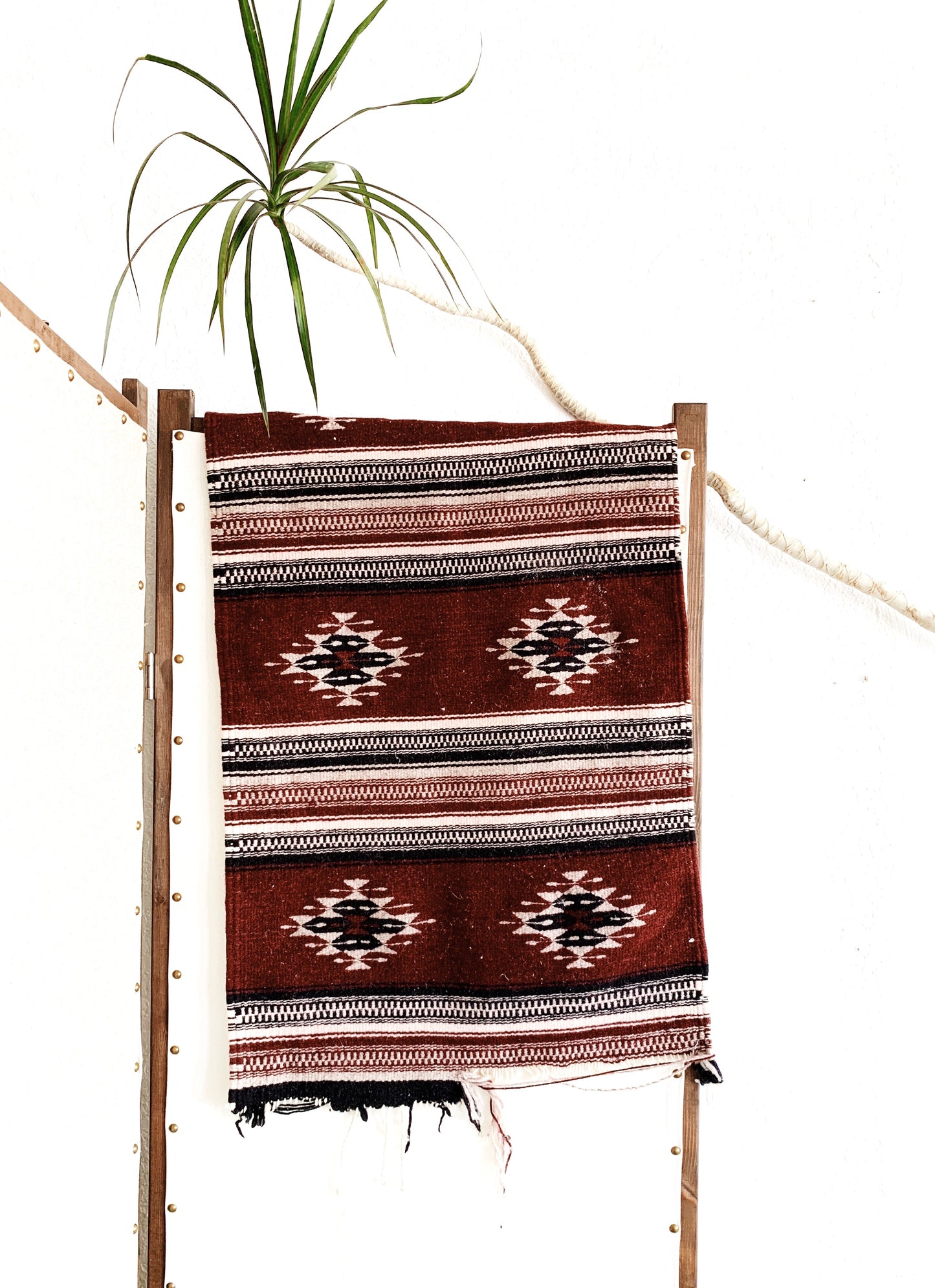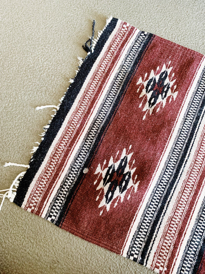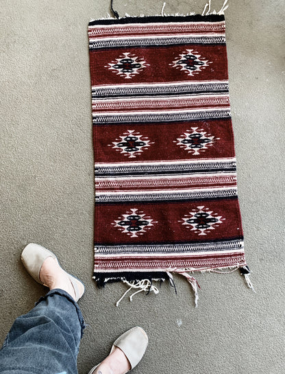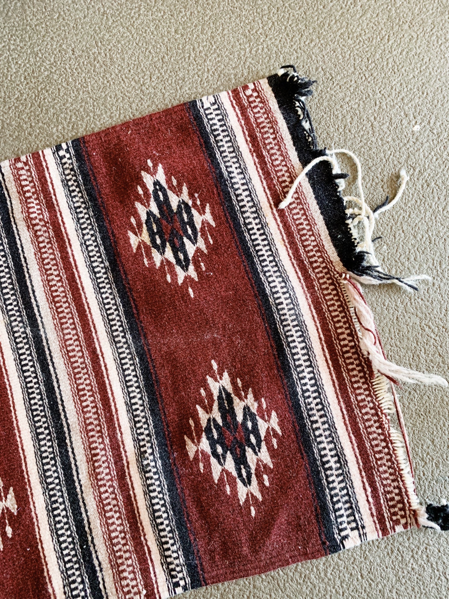 nice old southwest wool blend rug. Thick, in good shape, frayed on both sides in the best way. One small spot and area of discoloration. Please see photos. Great size for the kitchen, bath or bedside.