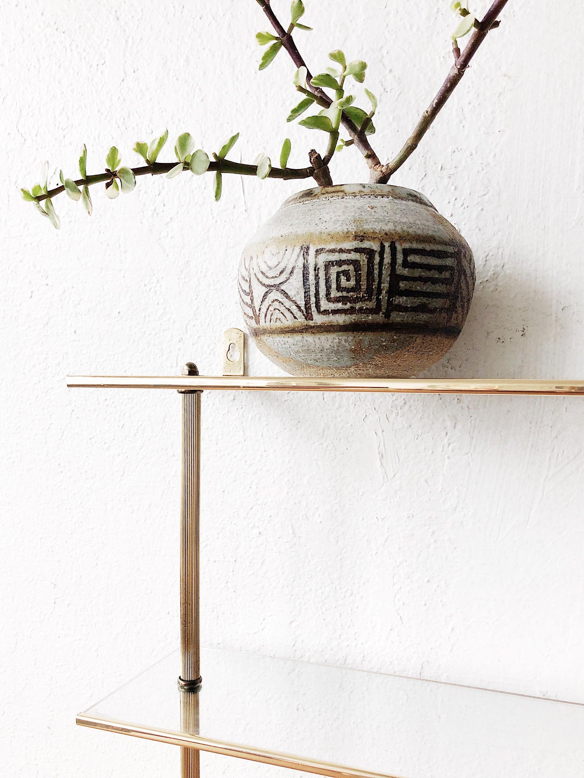 Three tiered shelf in modern brass and glass. Pillar style. Hanging hooks attached.