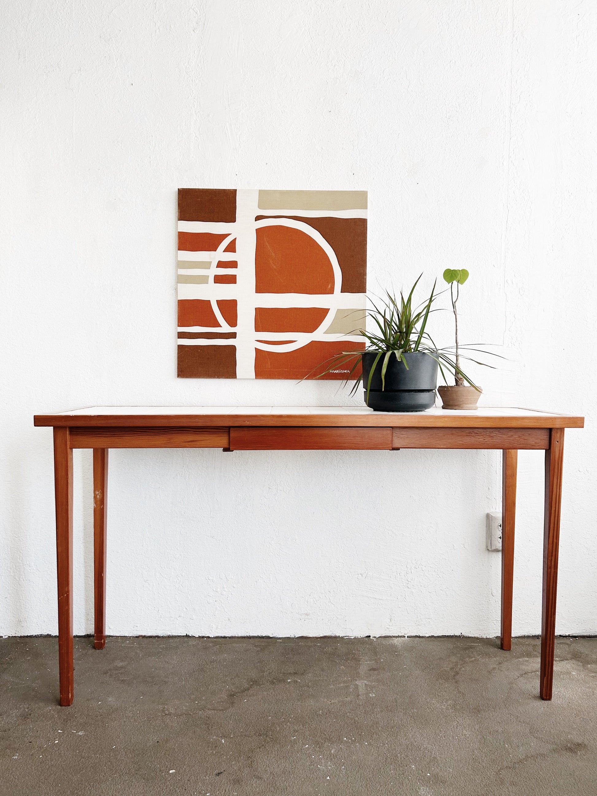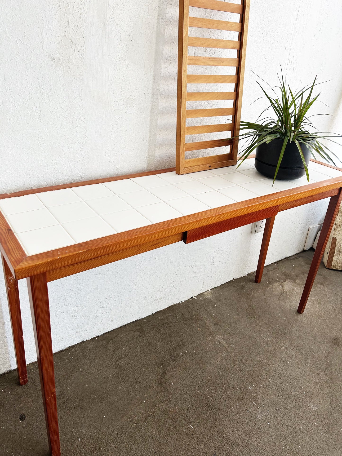 Such a clean, great piece. White tile top, framed in wood on skinny wood legs. With a drawer. Great entryway or sofa table. Excellent under any window for plants and books too.