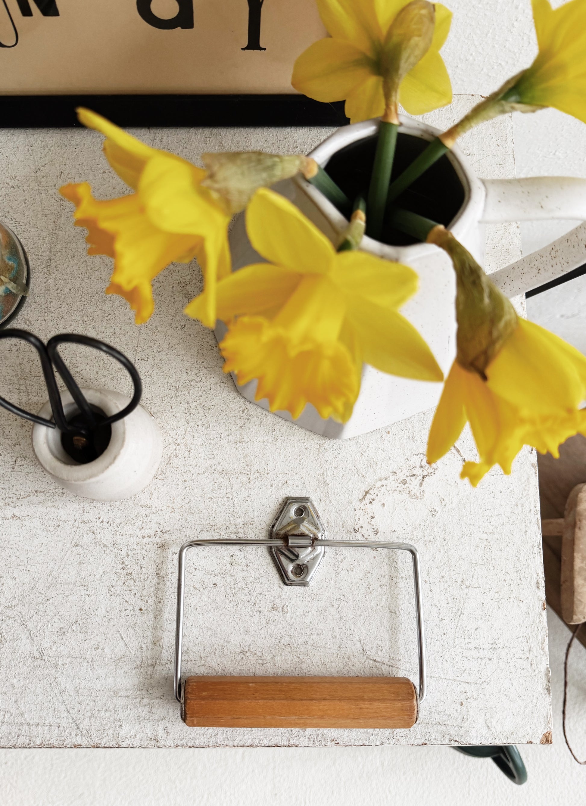 I love old utilitarian things. This toilet paper holder with its faceted wood roller and chrome hardware is art deco era. Also would hold rolls of tape for a craft space