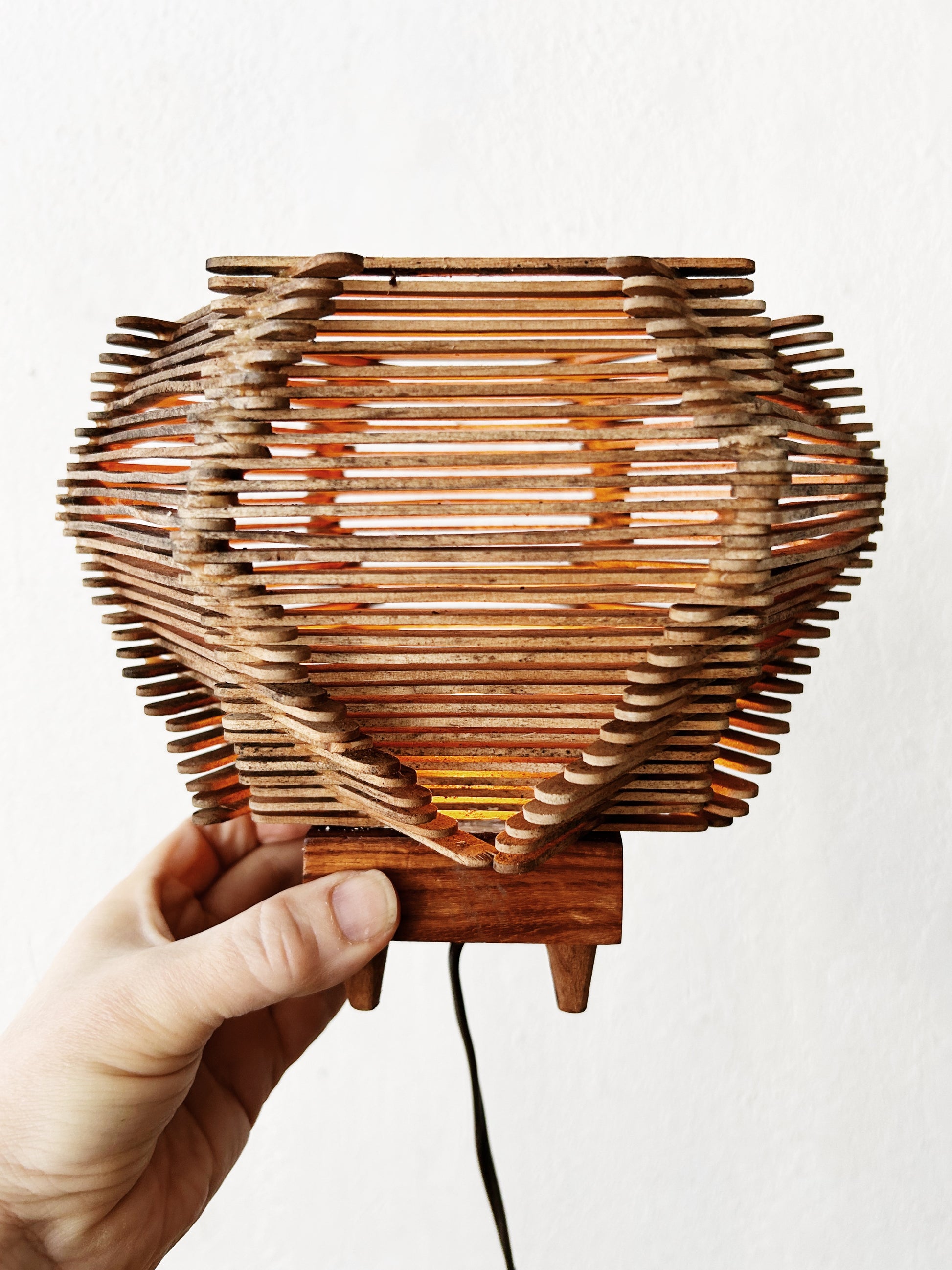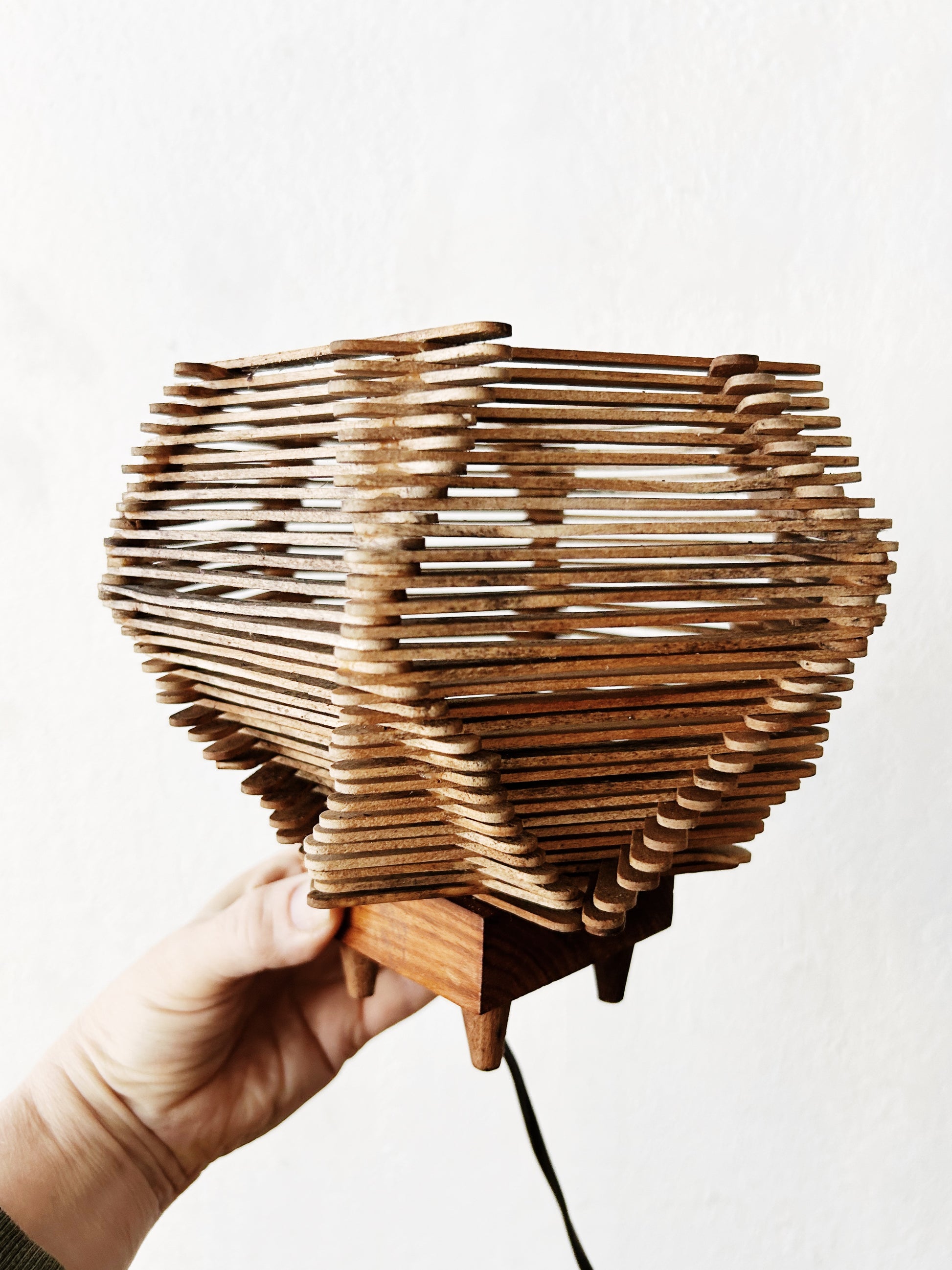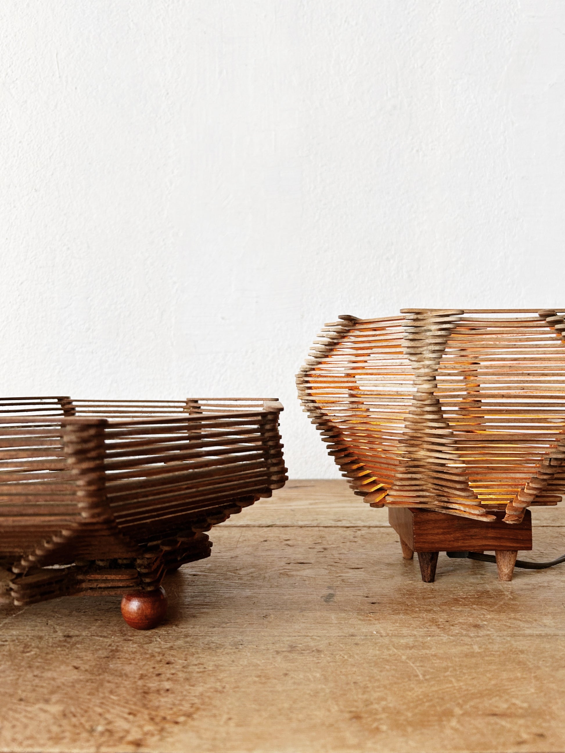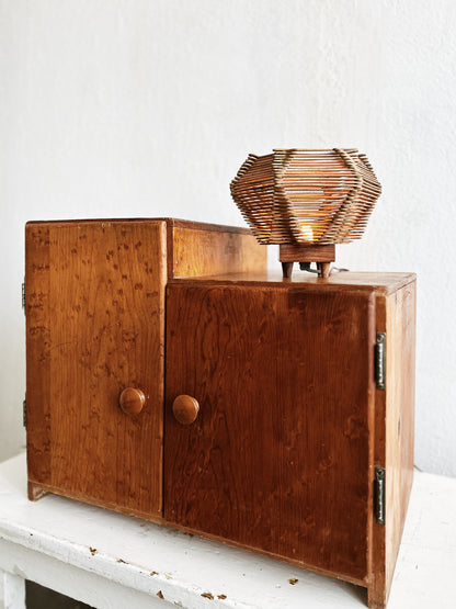 Wonderful tramp art mood light. Nicely sized for any nook shelf or side table. Sits atop a small footed wood stand. Rocker switch on cord. Takes a night light bulb. Outside has a little wear but doesn’t detract.