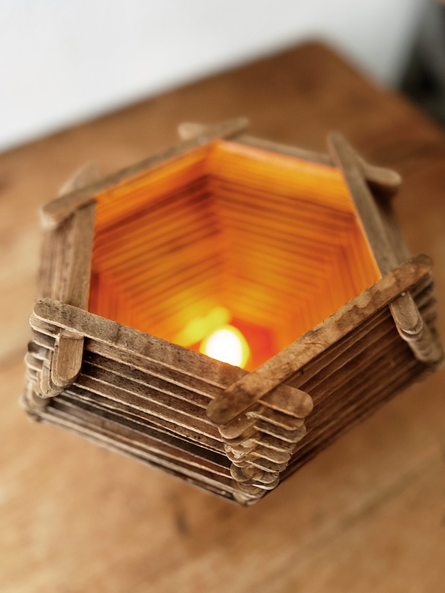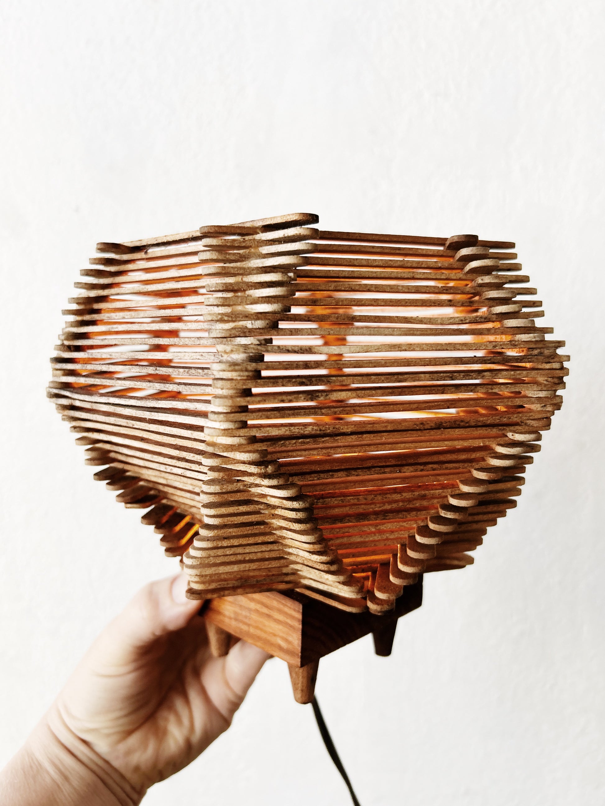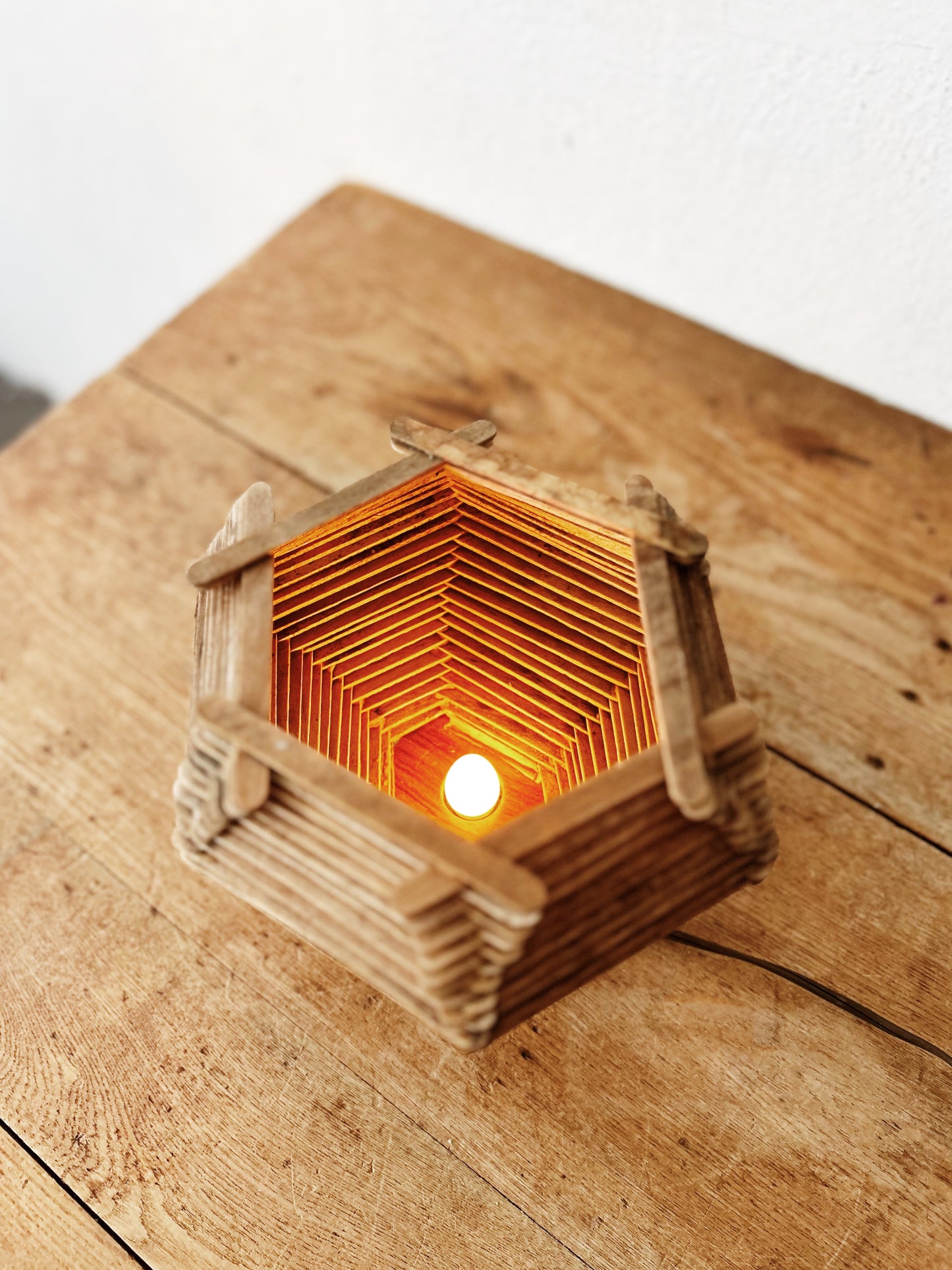 Wonderful tramp art mood light. Nicely sized for any nook shelf or side table. Sits atop a small footed wood stand. Rocker switch on cord. Takes a night light bulb. Outside has a little wear but doesn’t detract.