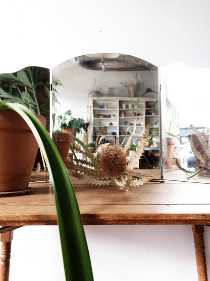 Lovely vintage trifold Mirror to go atop a tall dresser or vanity.
