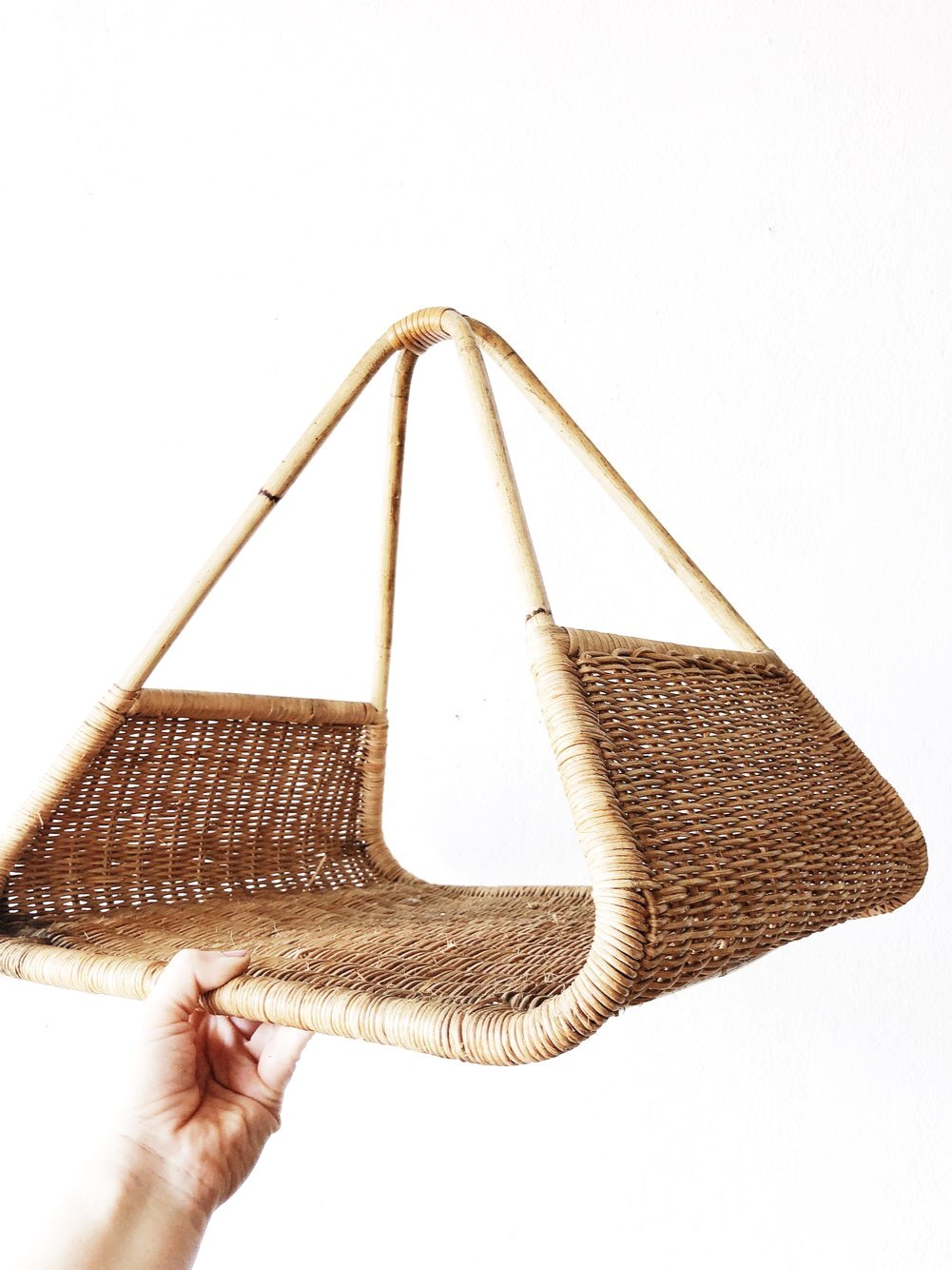 Great carry all basket in a triangular shape. We like this for kindling wood, art books and records! Could even be hung if you wanted