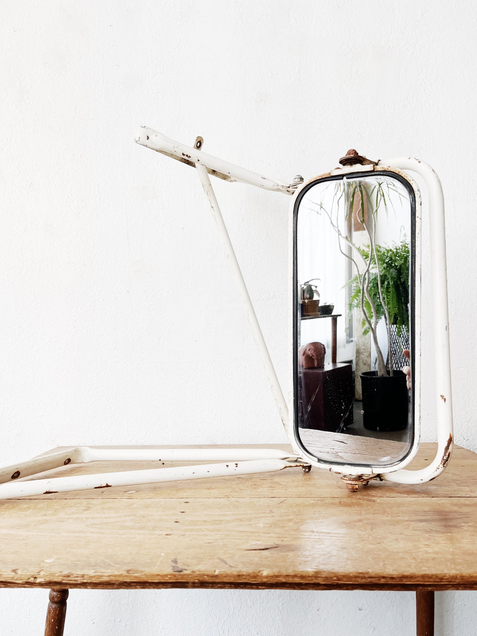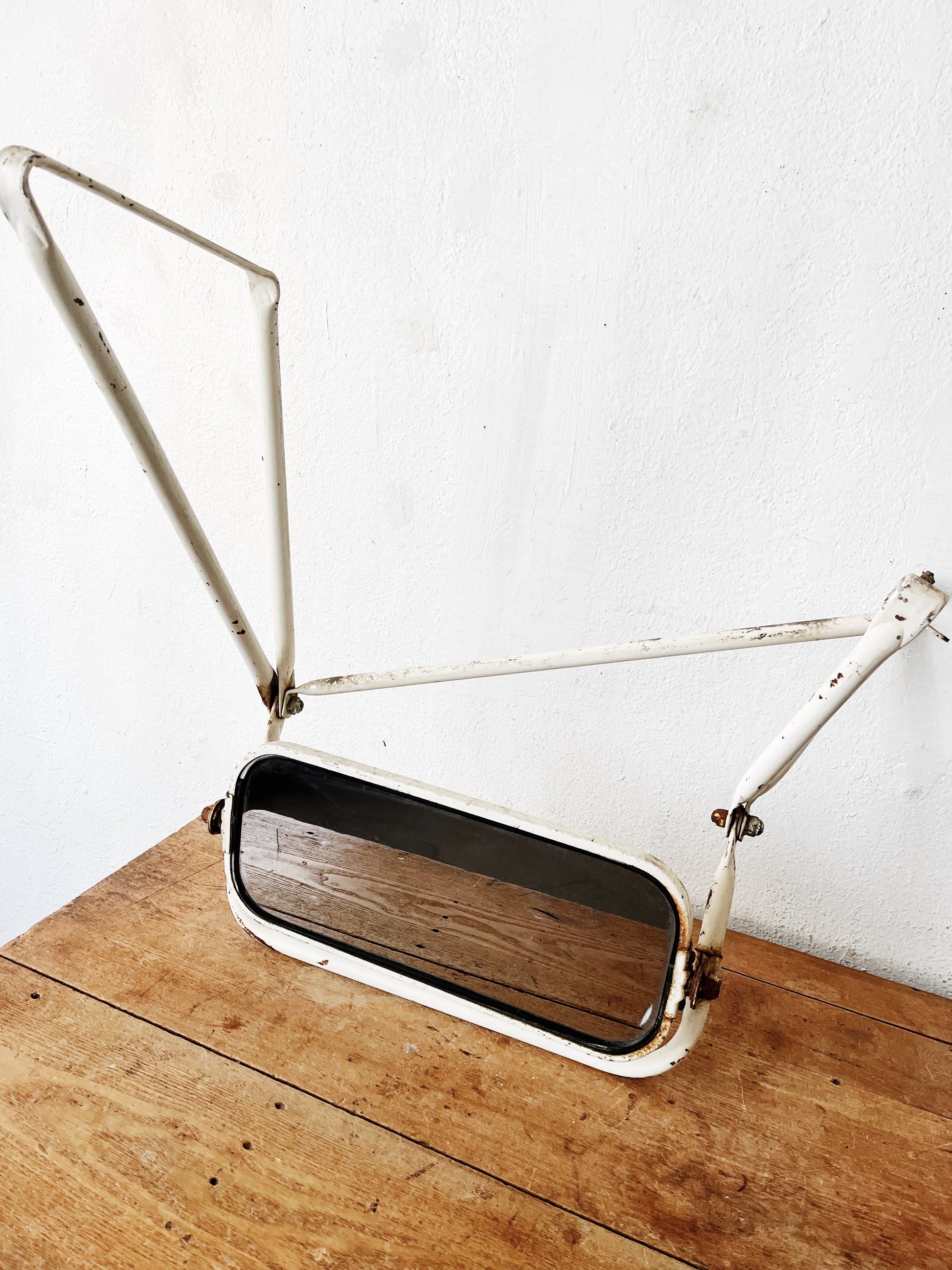 Large industrial style truck mirror. We think this would be really cool out in the garden or used in a bathroom renovation. Poppet a top and old worn dresser and it’s perfect. The Mayer is slightly tinted and the metal a tad rusty adds to the overall look.