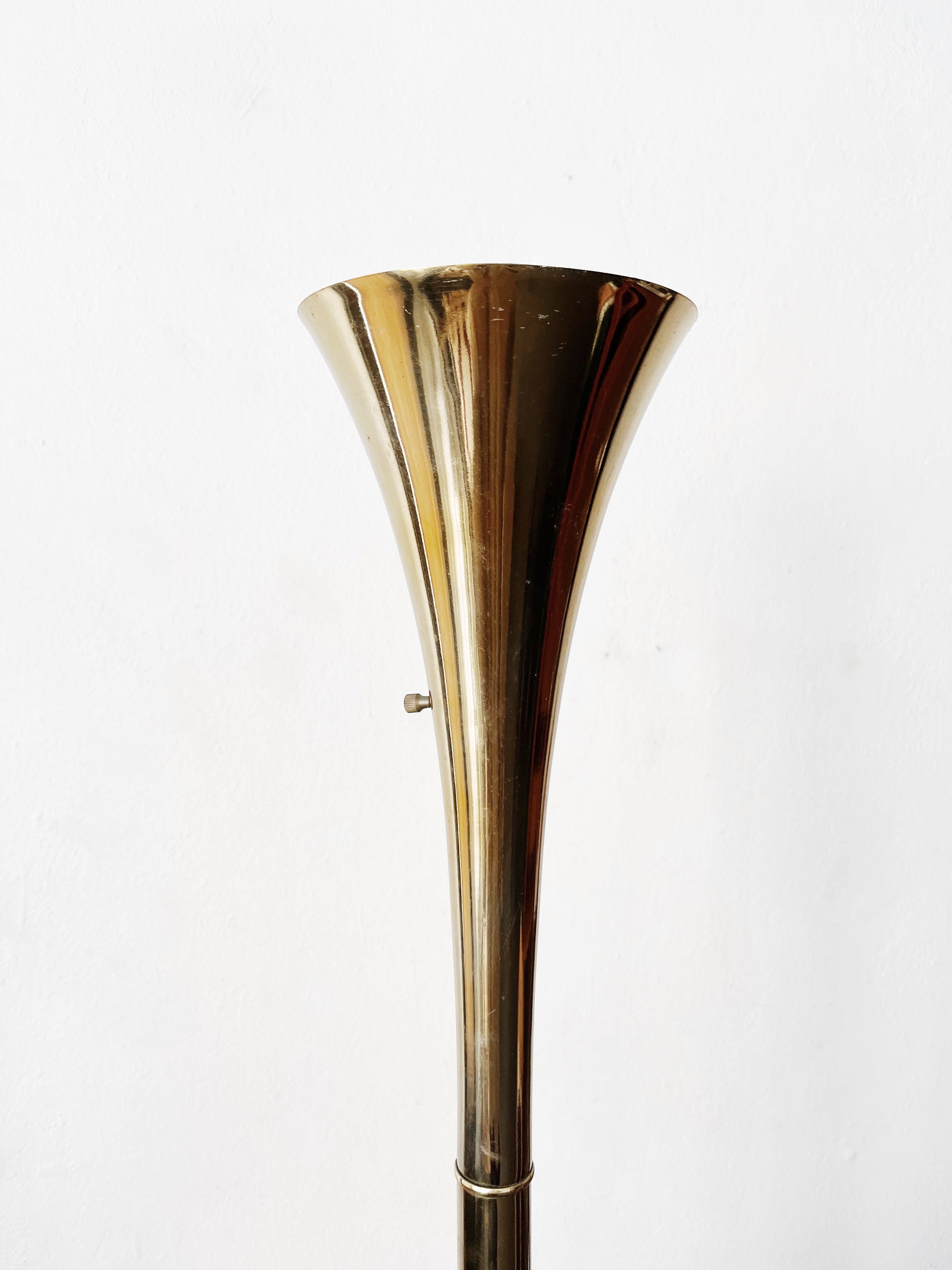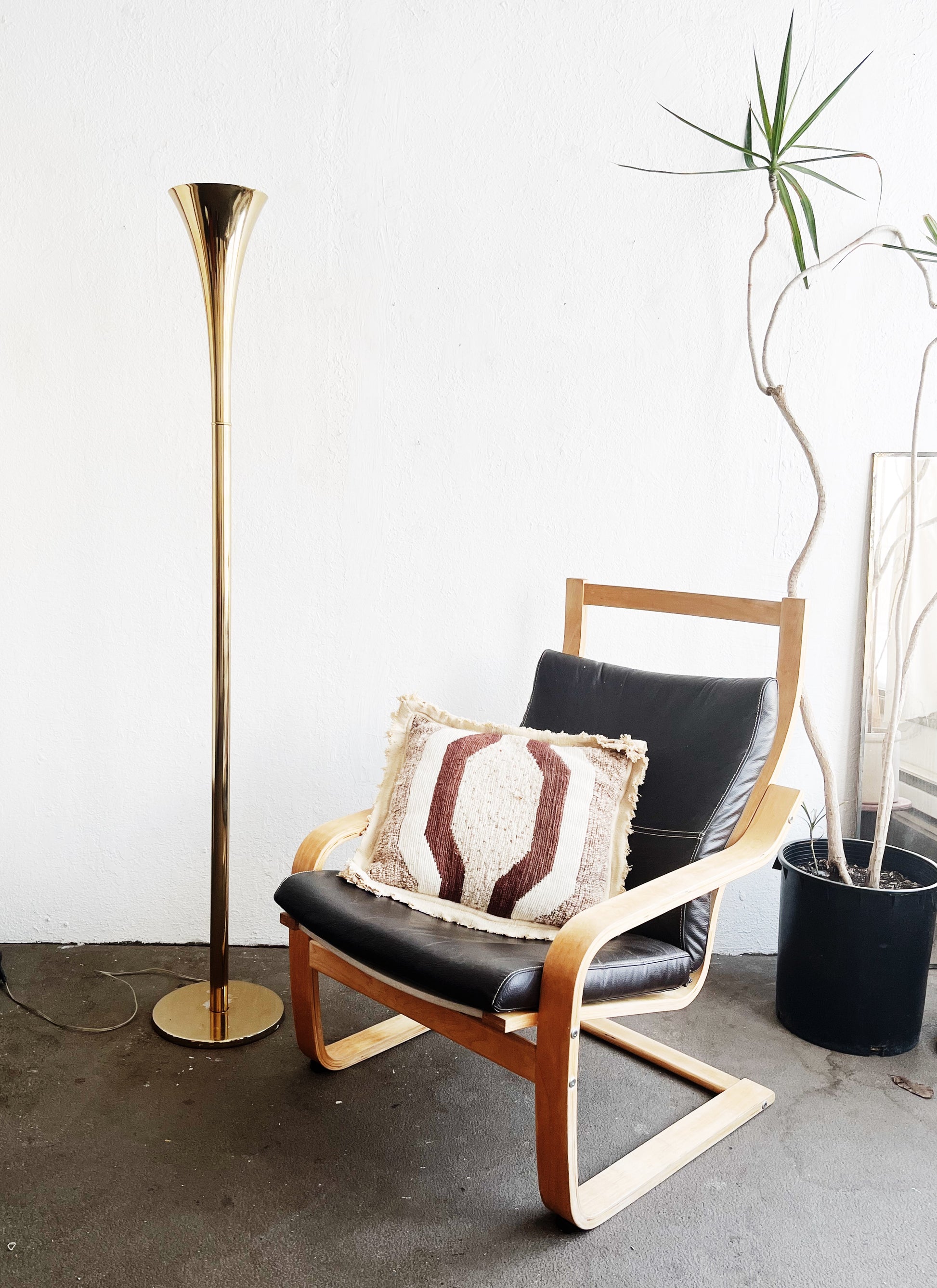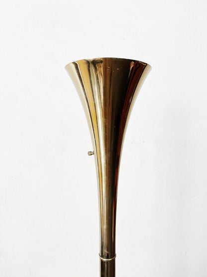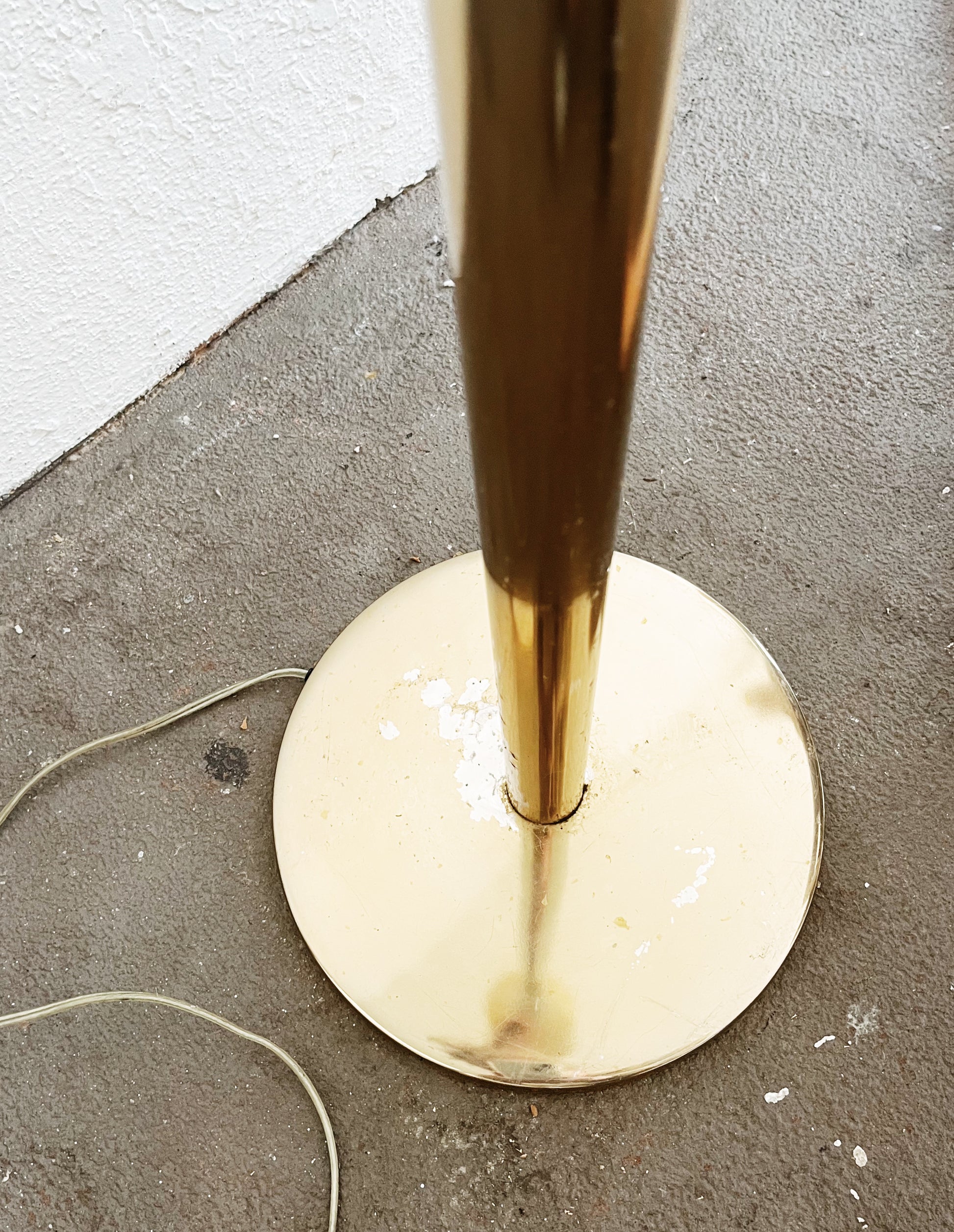 Mid century brass torchiere lamp. Nice and tall with a sublime presence. Weighted base has a little wear to the plating, and a small bit overall, but not bad at all. Single turn switch. Takes a standard bulb.