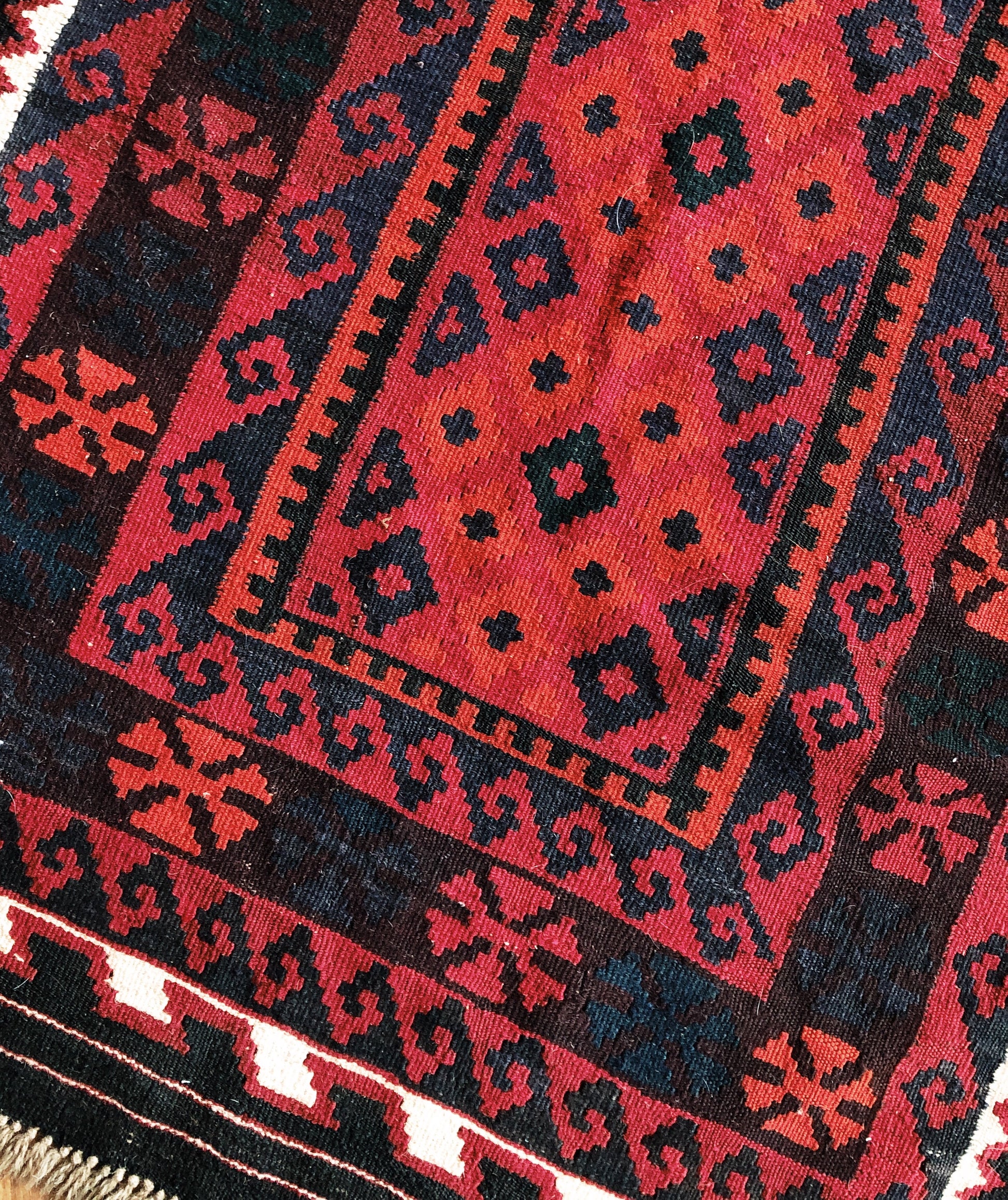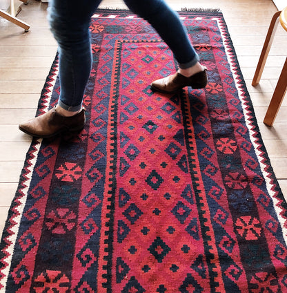 Deep saturated colors in this vintage Turkish wool kilim rug. Subtle patterning shows off in shades of pinky red, melon, brown, charcoal, cream