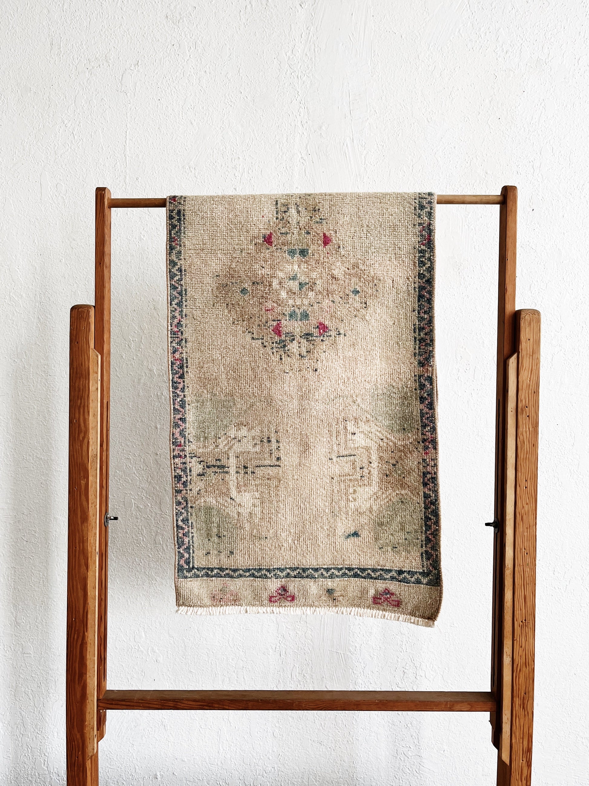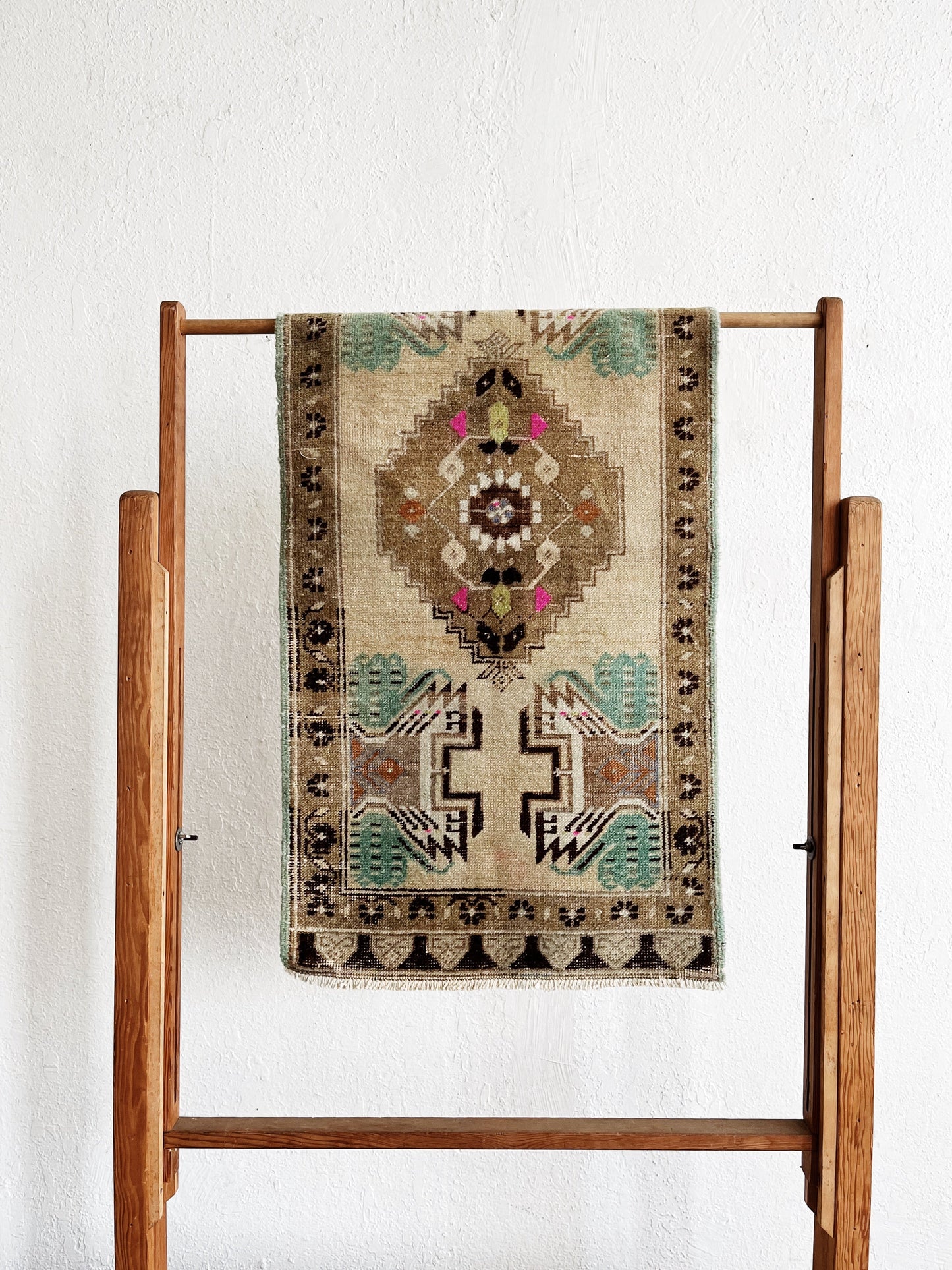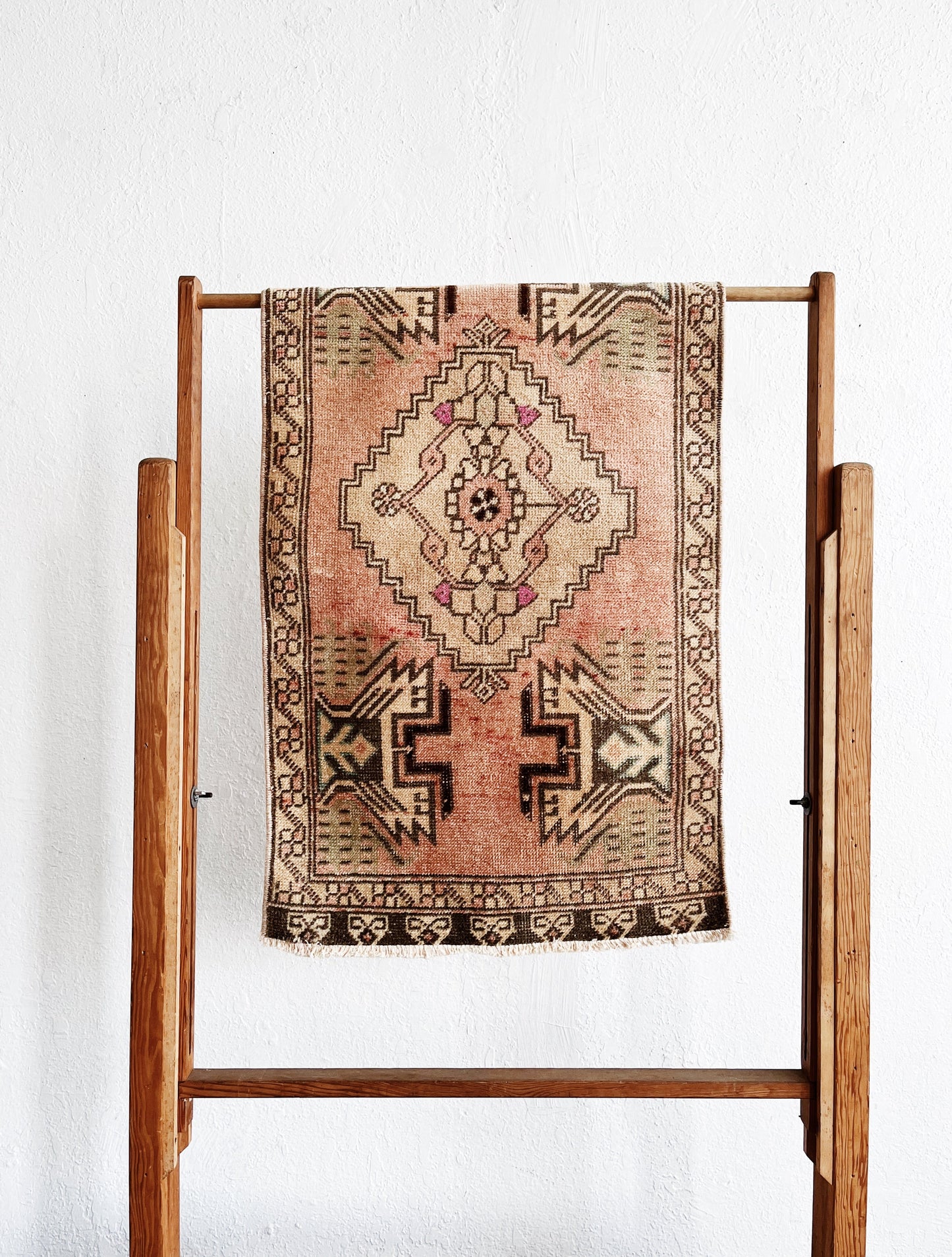 Vintage Turkish wool. Soft and thick underfoot with a medium flat pile. Reversible, with the opposite side being a little bit more dull in color but a nice choice for seasonal change ups. Perfectly sized for the bath or kitchen.